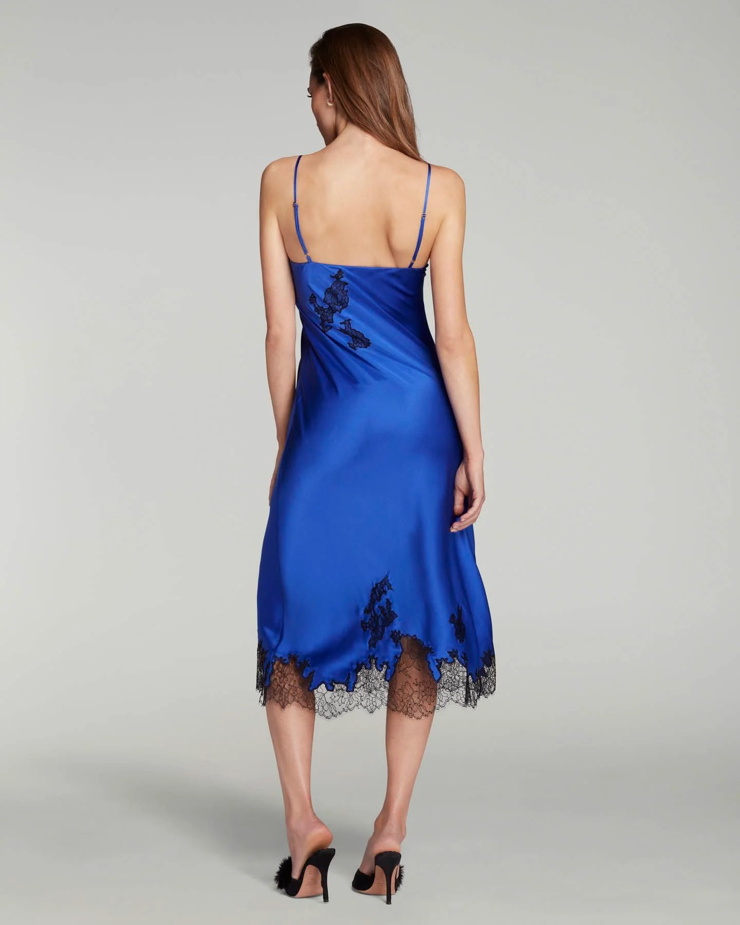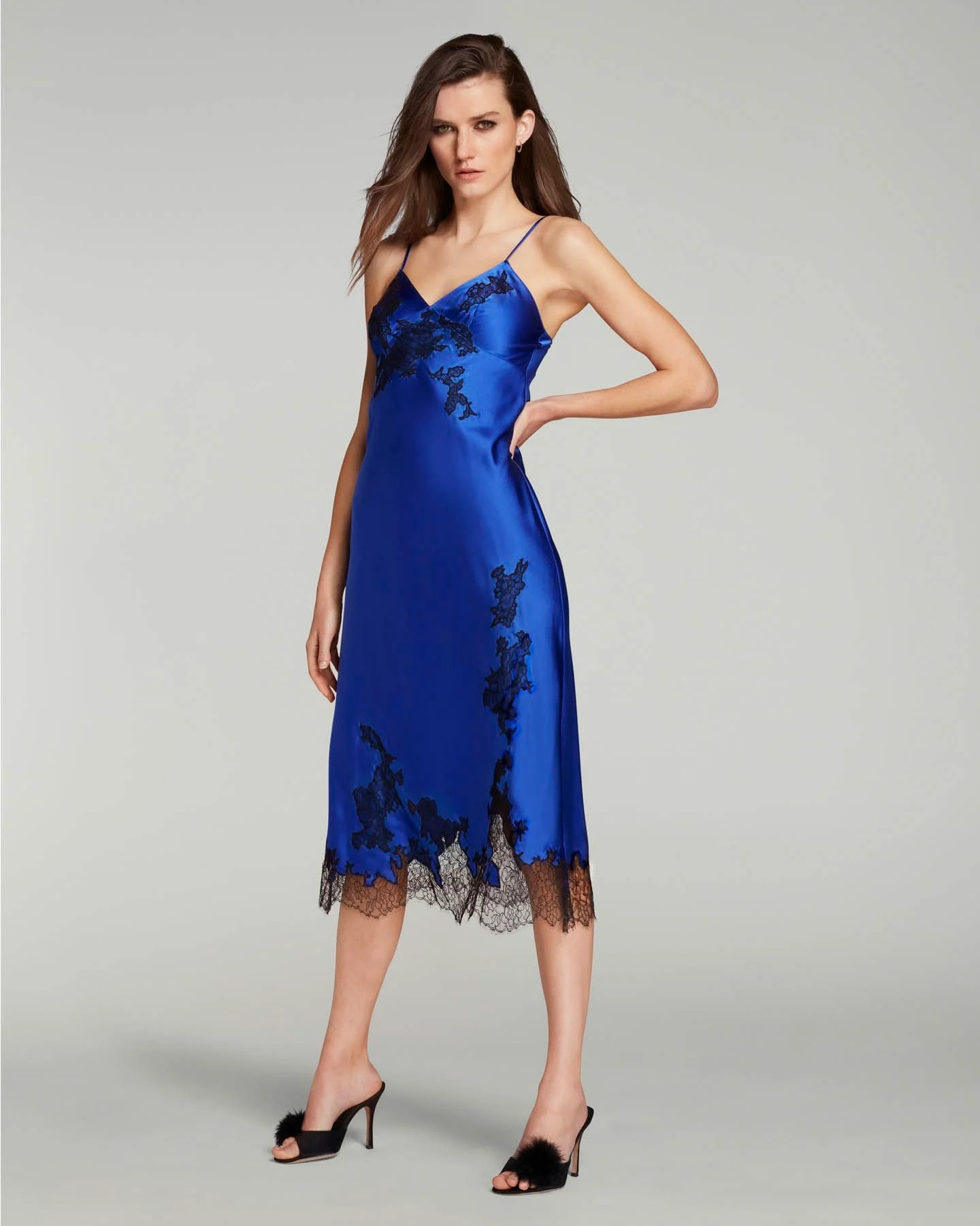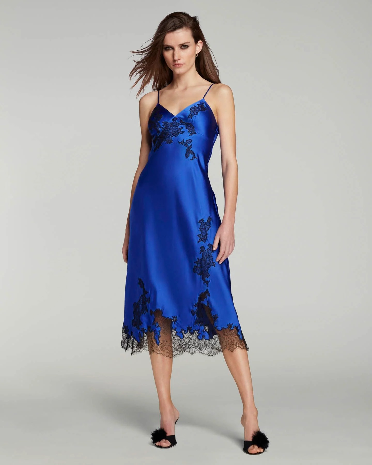 Шелковая сорочка Christi кобальтового цвета расшита аппликациями из черного резного кружева. Созданное на Севере Франции, тонкое кружевное полотно вырезано и пришито вручную. Треугольные чашечки завершены узкими бретелями с регулировкой на спине.