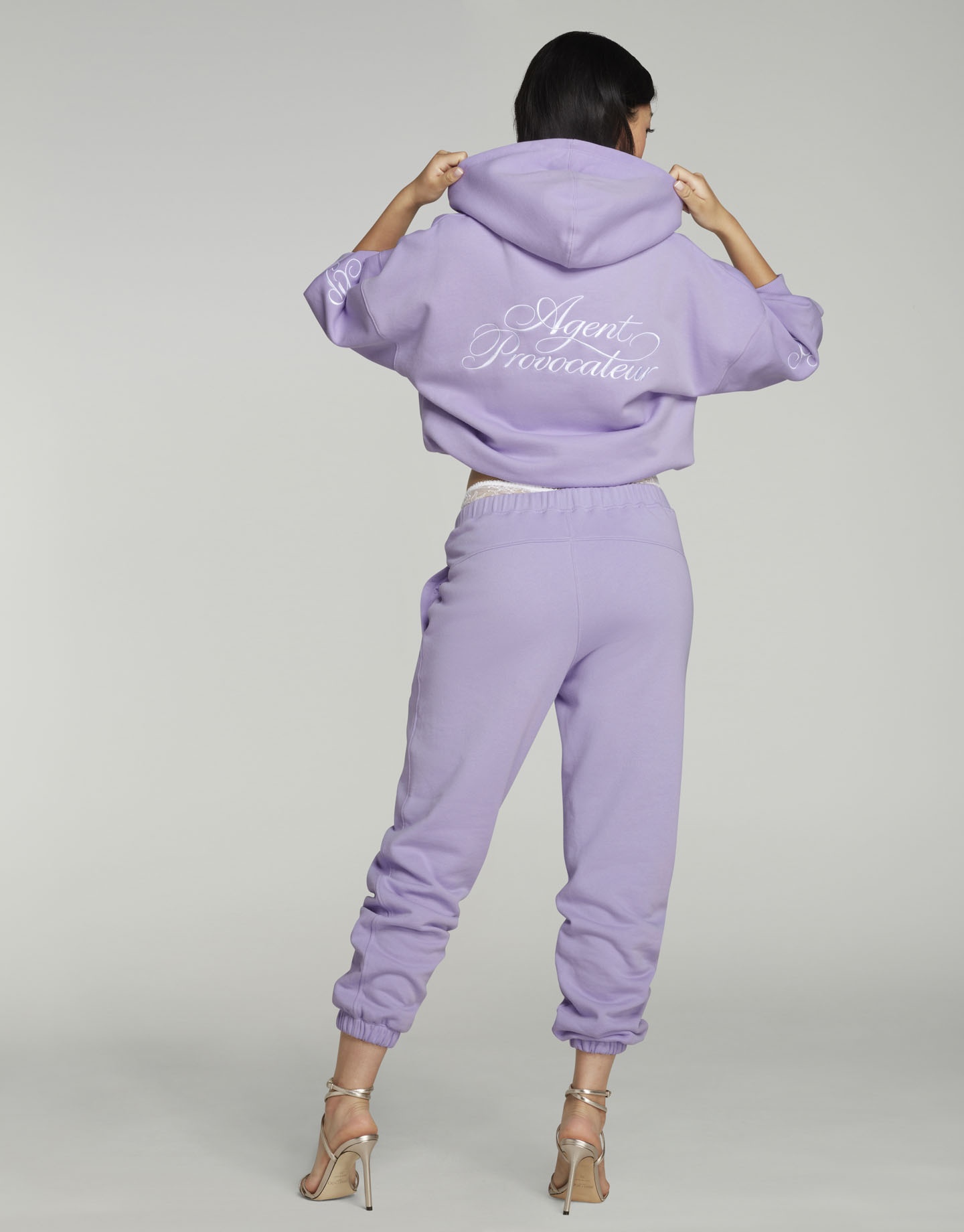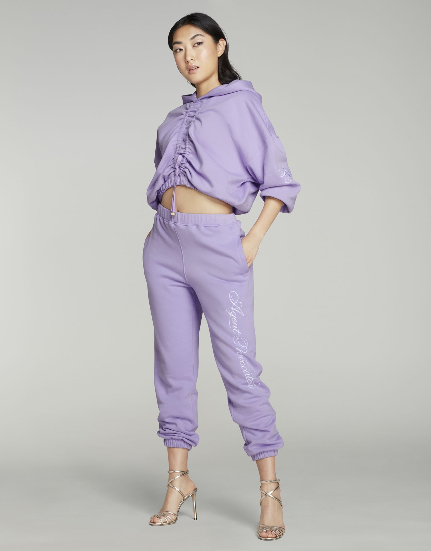 Это просторное худи из коллекции Rayley сшито из мягкого хлопкового трикотажа. Нежно-лиловый оттенок полотна подчеркнут белыми шелковистыми нитями вышивки. Расслабленный силуэт в духе спортивного шика 90-х оснащен парной кулиской для создания укороченной модели.