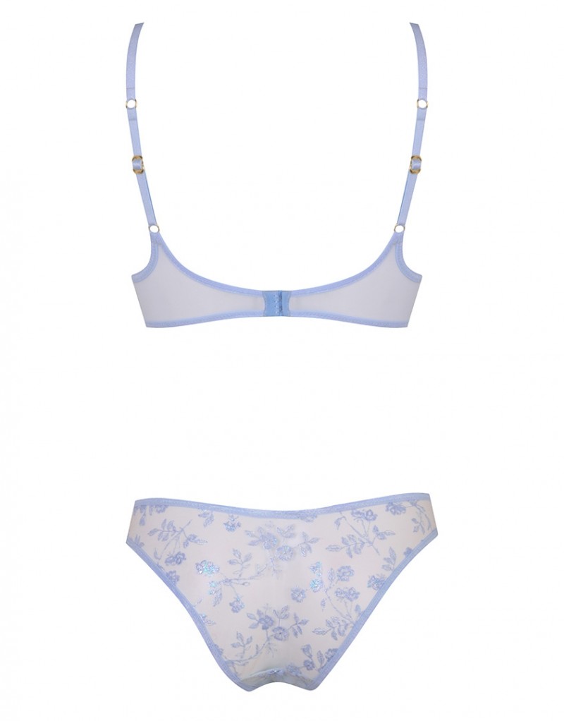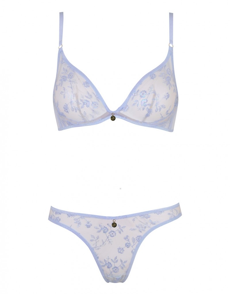 Никто не поставит малышку в угол! Женственная коллекция Zadi нежно-голубого оттенка в стиле 80-х и фильма "Грязные танцы" украшена вышивкой с эффектом сияния. Высокие трусики дополнены подвеской с логотипом AP на талии.