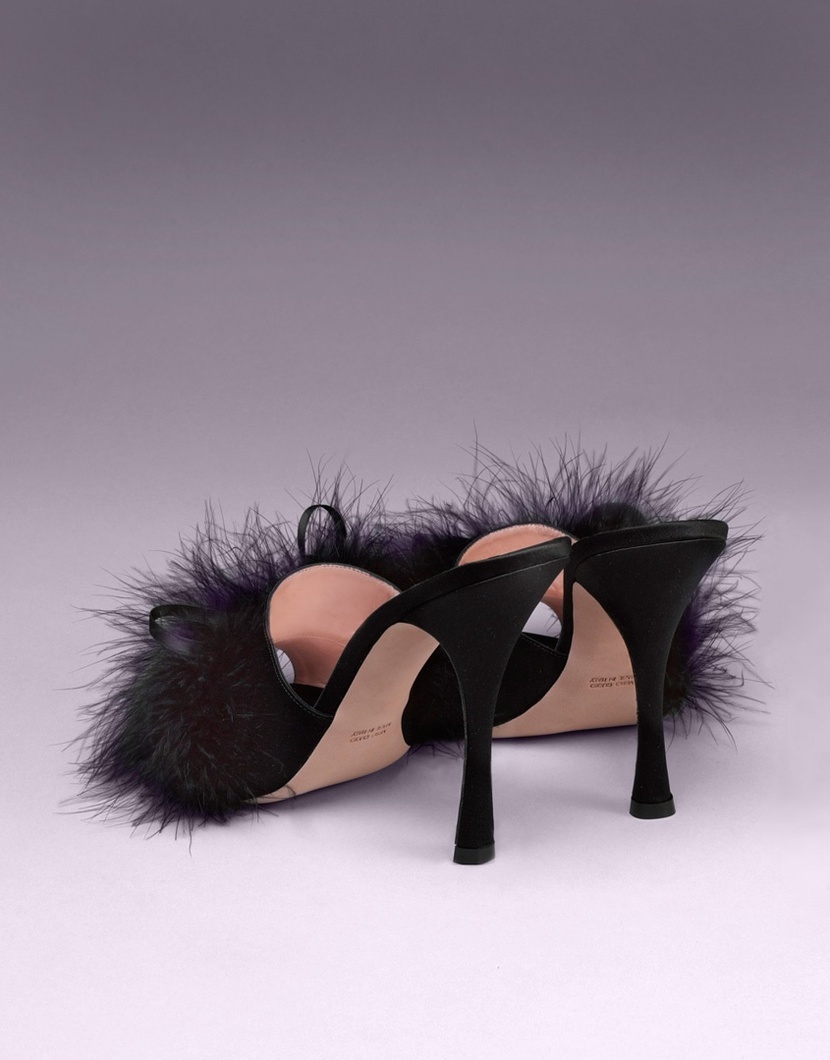 Классические туфельки AP для будуара вышли в новой интерпретации с 10.5cm каблуком. Способствуют создания образа в стиле женцины-вамп, благодаря кокетливому марабу и шелковым бантиками. Выполнены из черного имперского атласного шелка, 100% сделано в Италии.