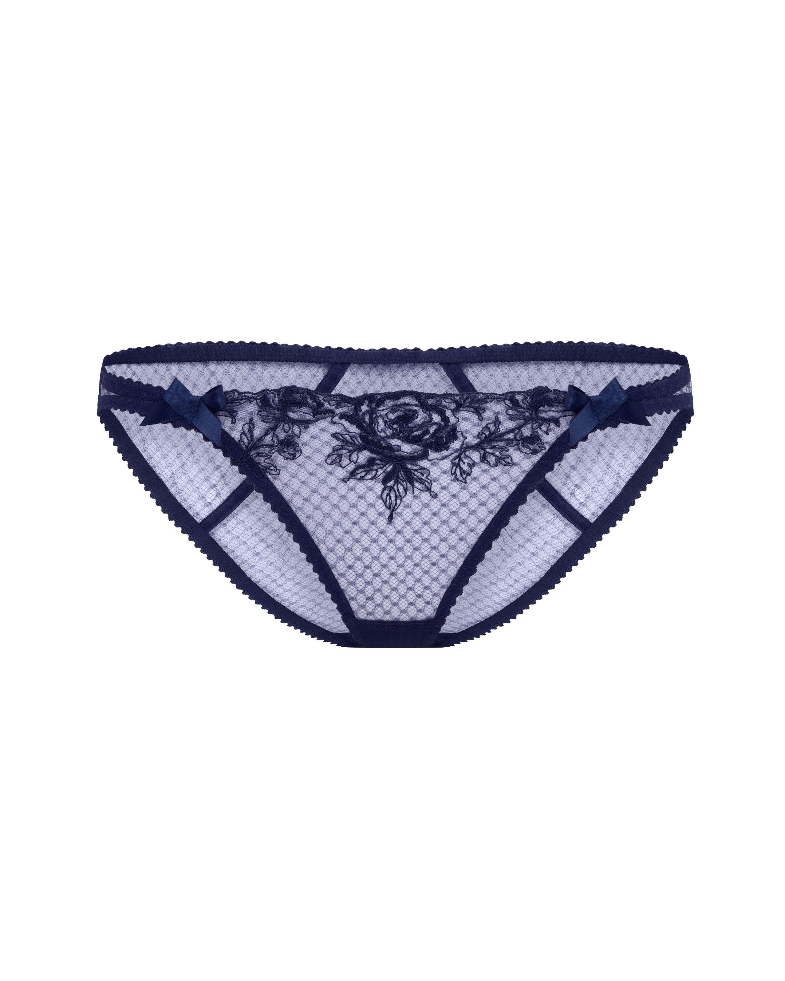 Европейская цветочная вышивка и сетчатая основа встречаются с шелковыми бантами и глянцевыми окантовками в этих классических трусах Rosia темно-синего цвета. Дополните образ коллекцией Rosia.