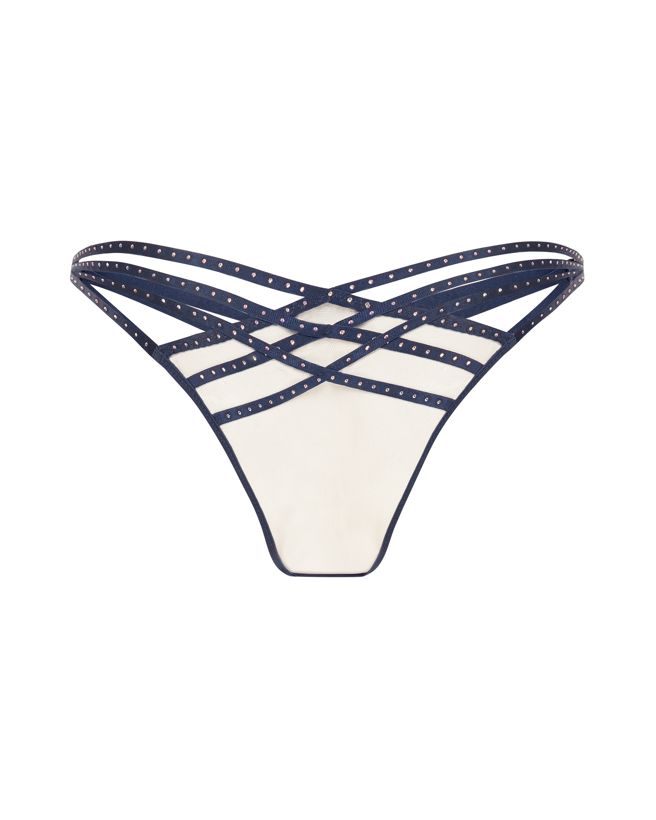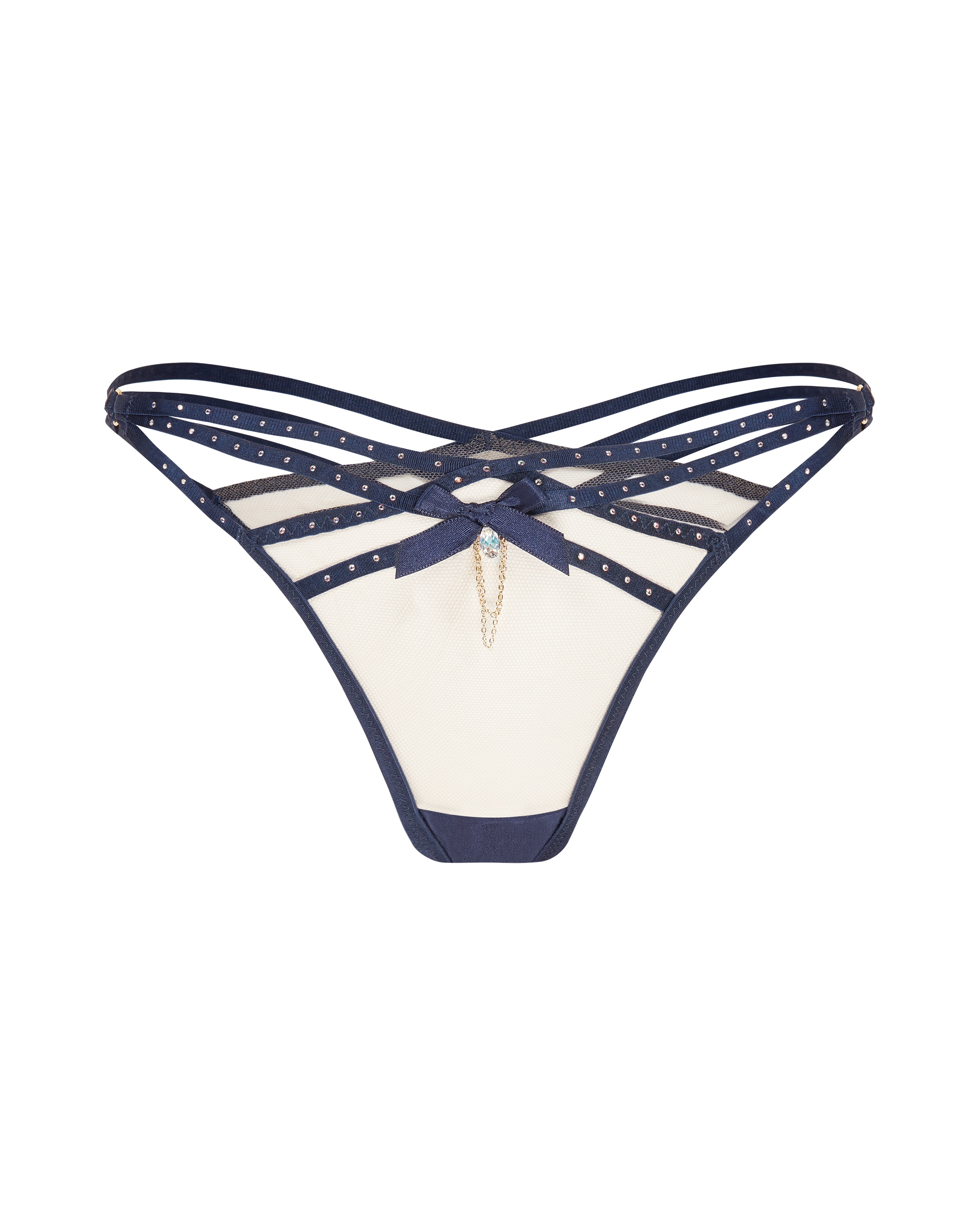 Классические трусы Rubi темно-синего цвета вдохновлены вегасскими шоу-герлз и созданы для центра сцены. Прозрачная тюлевая модель украшена перекрестными эластичными лямками с кристаллами, ниспадающая цепочкой и бантиком по центру. Станьте главной героиней вечера с коллекцией Rubi.
