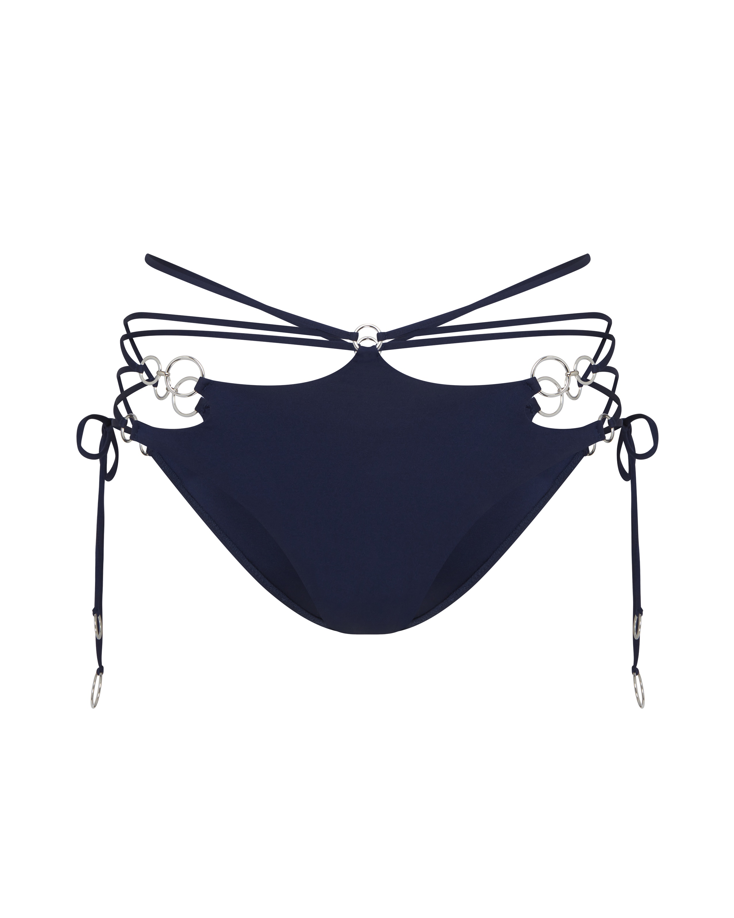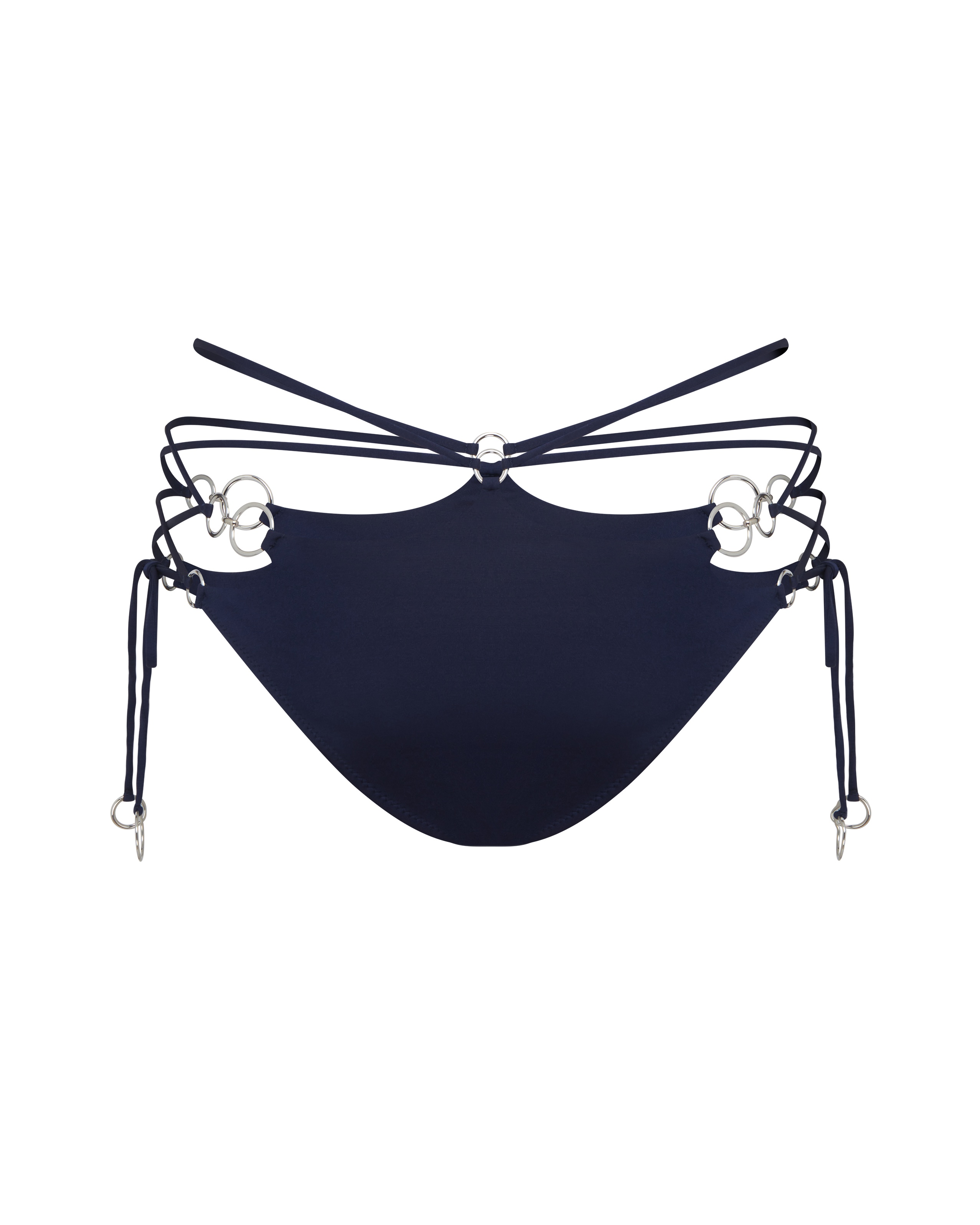 Плавки Davine в темно-синем оттенке выполнены из эластичной итальянской ткани с легким блеском, украшены боковой шнуровкой и кольцами серебристого тона. Дополните образ топом из этой же коллекции.