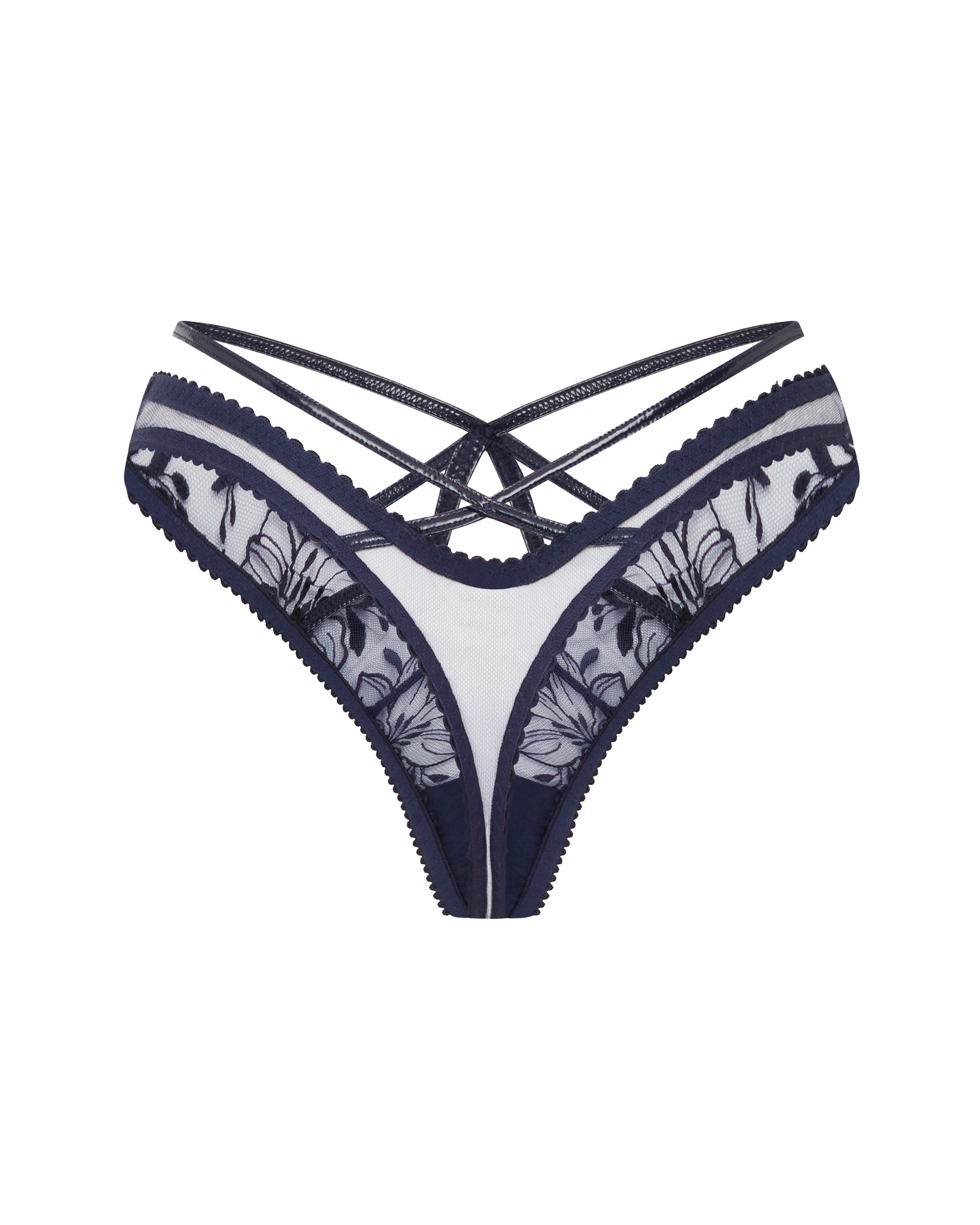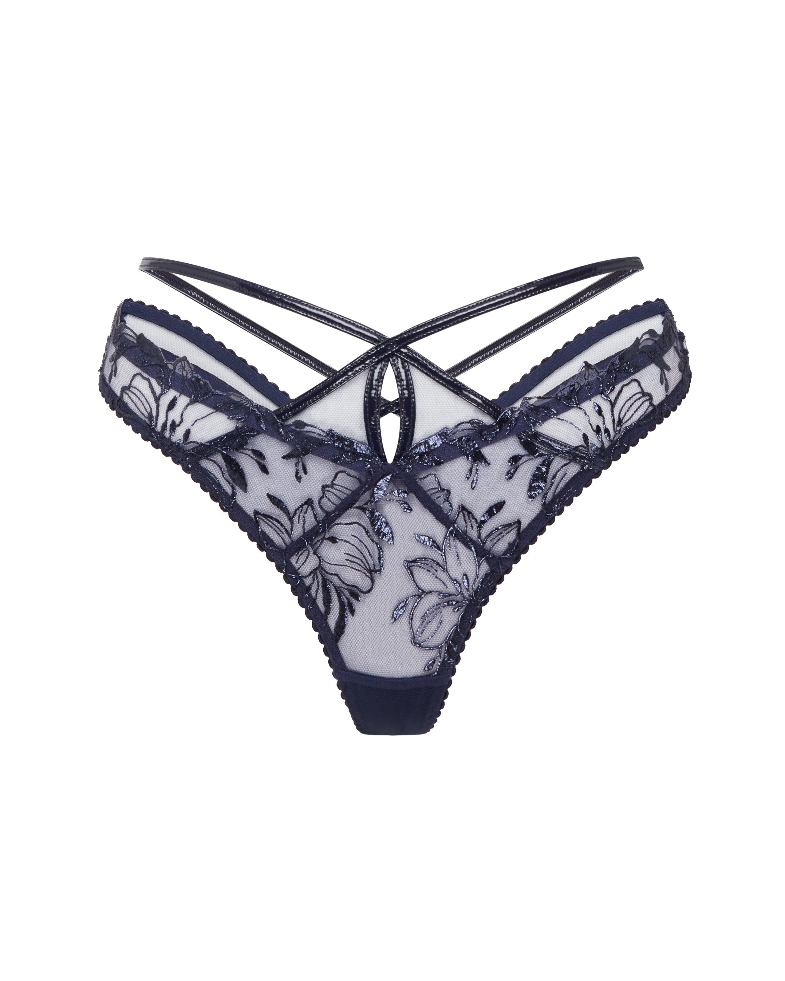 Темно-синие стринги Ozella: воздушный тюль, цветочная вышивка и дерзкие прорези. Глянцевый эффект придает классике современное звучание. Коллекция Ozella создана для тех, чьи секреты слишком хороши, чтобы их скрывать.