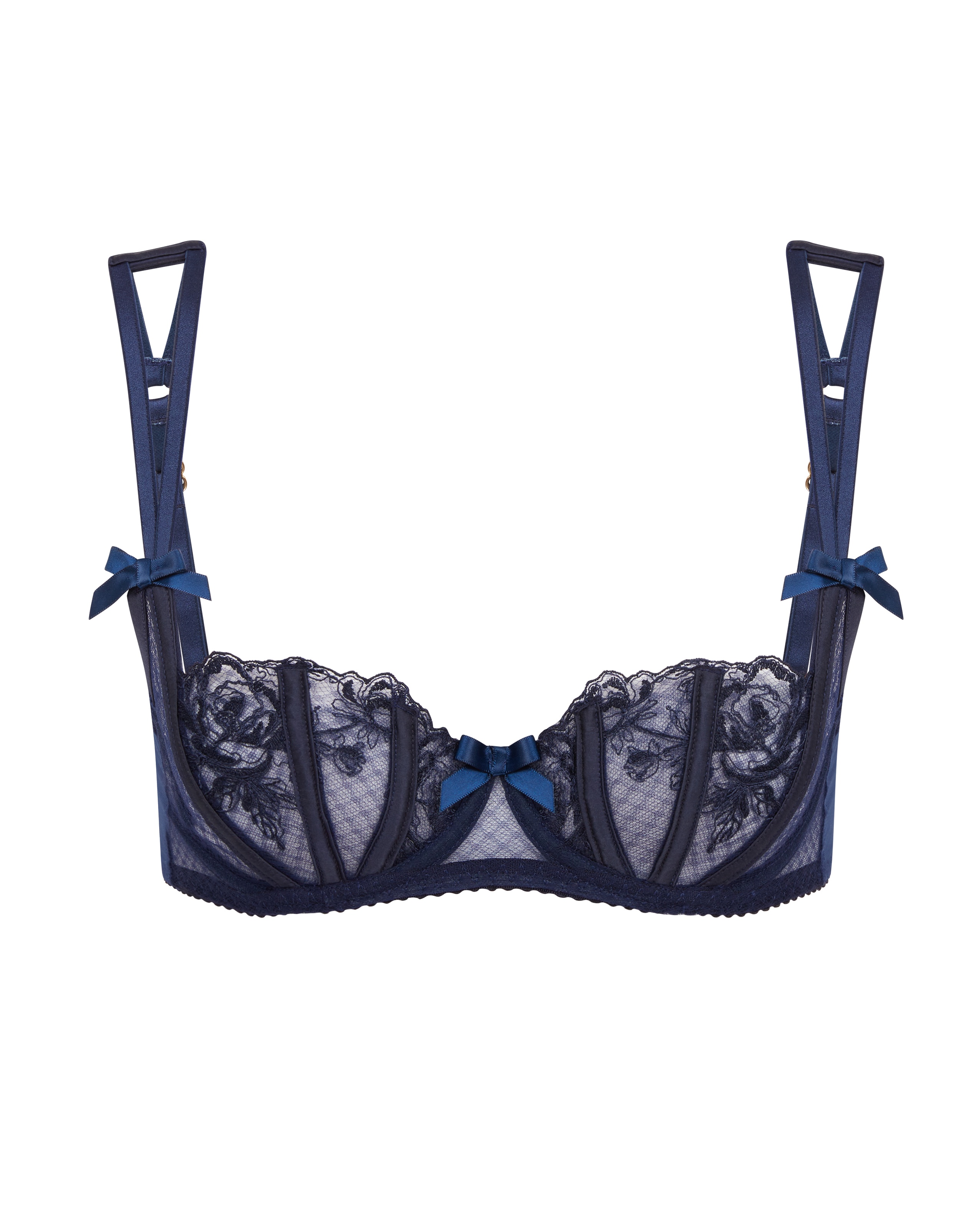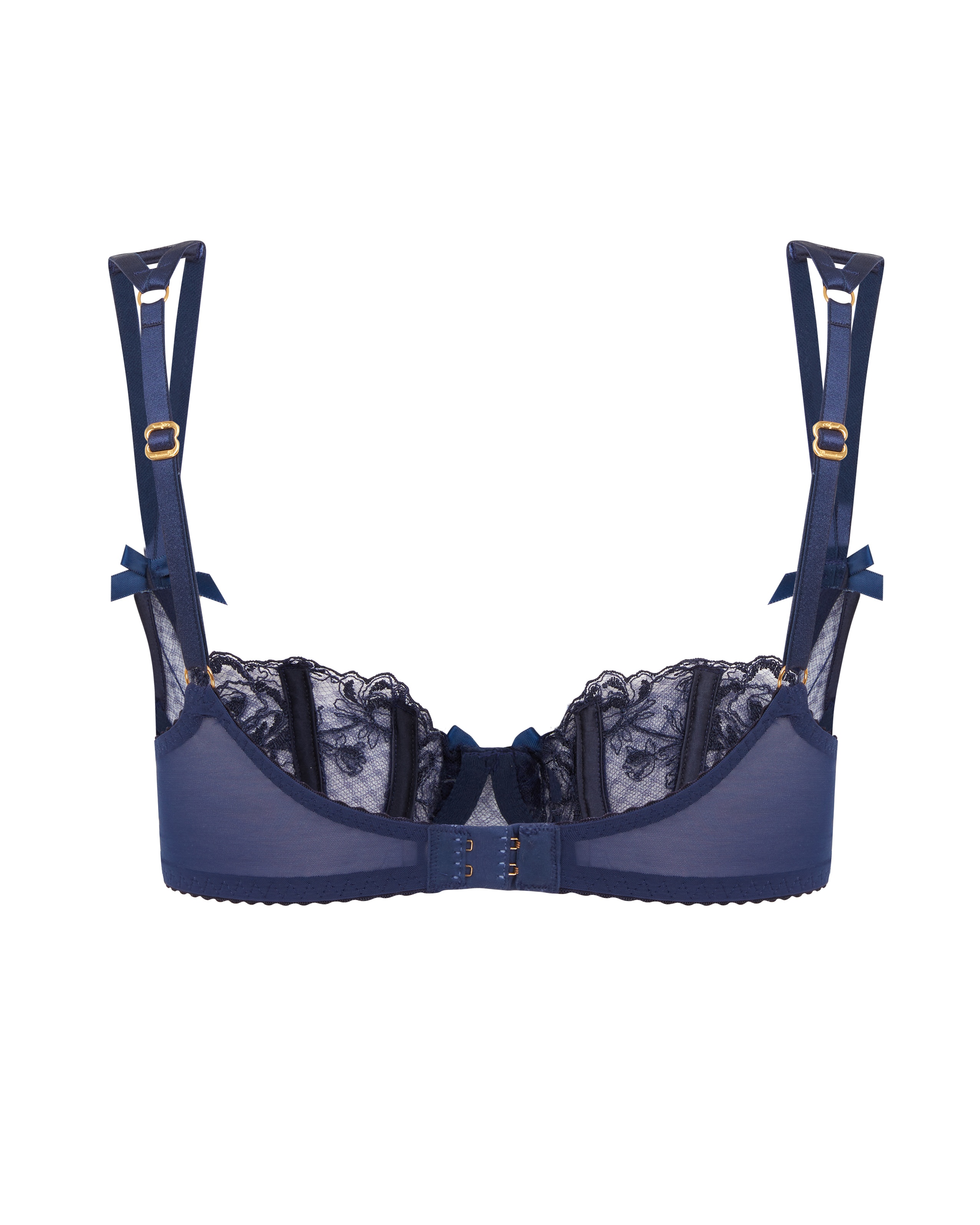 Бюстгальтер-балконет Rosia темно-синего цвета создан из сетчатой основы с европейской цветочной вышивкой. Косточки в шелковой оплетке и двойные бретели обеспечивают комфортную посадку. Сочетайте с полным комплектом Rosia.