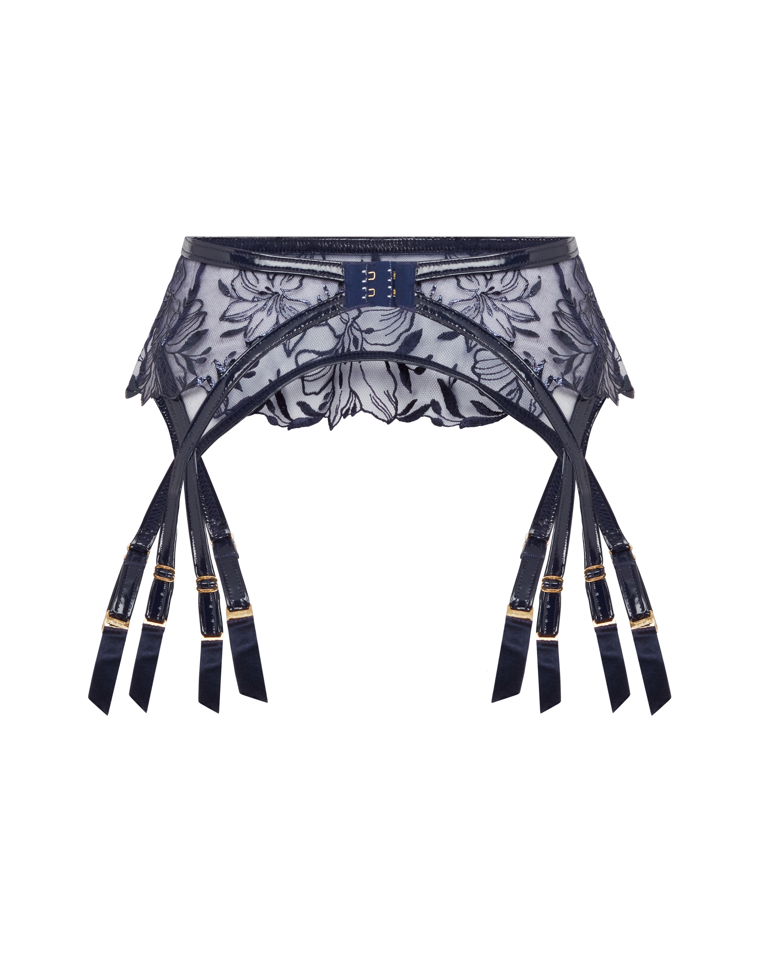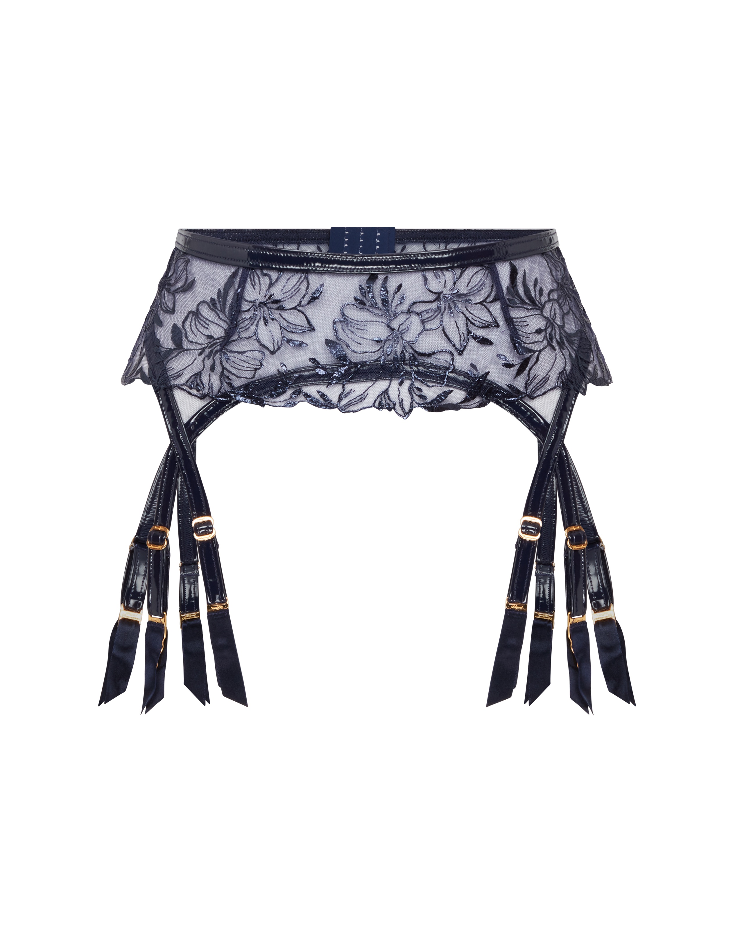 Темно-синий пояс для чулок Ozella: ажурный тюль, нежные цветы и кокетливая «юбочка». Глянцевые канты подчеркивают изгибы, добавляя образу игривости. Этот дерзкий аксессуар — часть коллекции Ozella, чья утонченность лишь прикрывает соблазн.