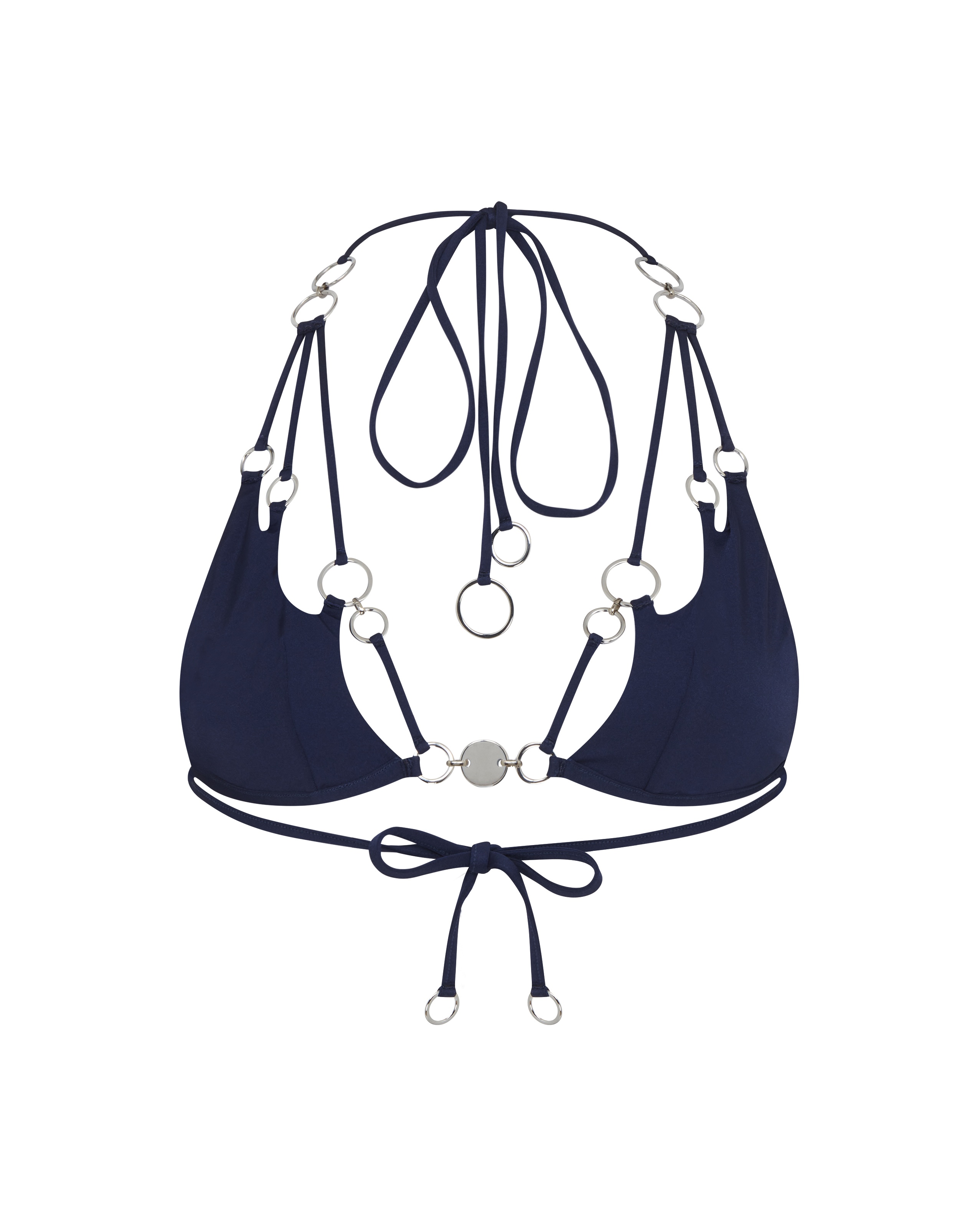 В коллекции Davine представлен темно-синий топ с вырезами, мягкими чашками и дизайнерской фурнитурой, устойчивой к нагреву и воде. Завершите образ плавками из этой же коллекции.