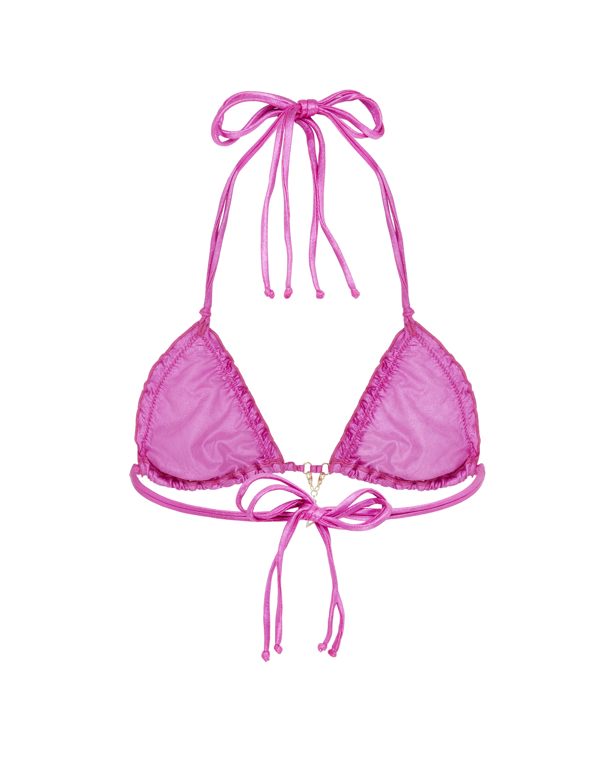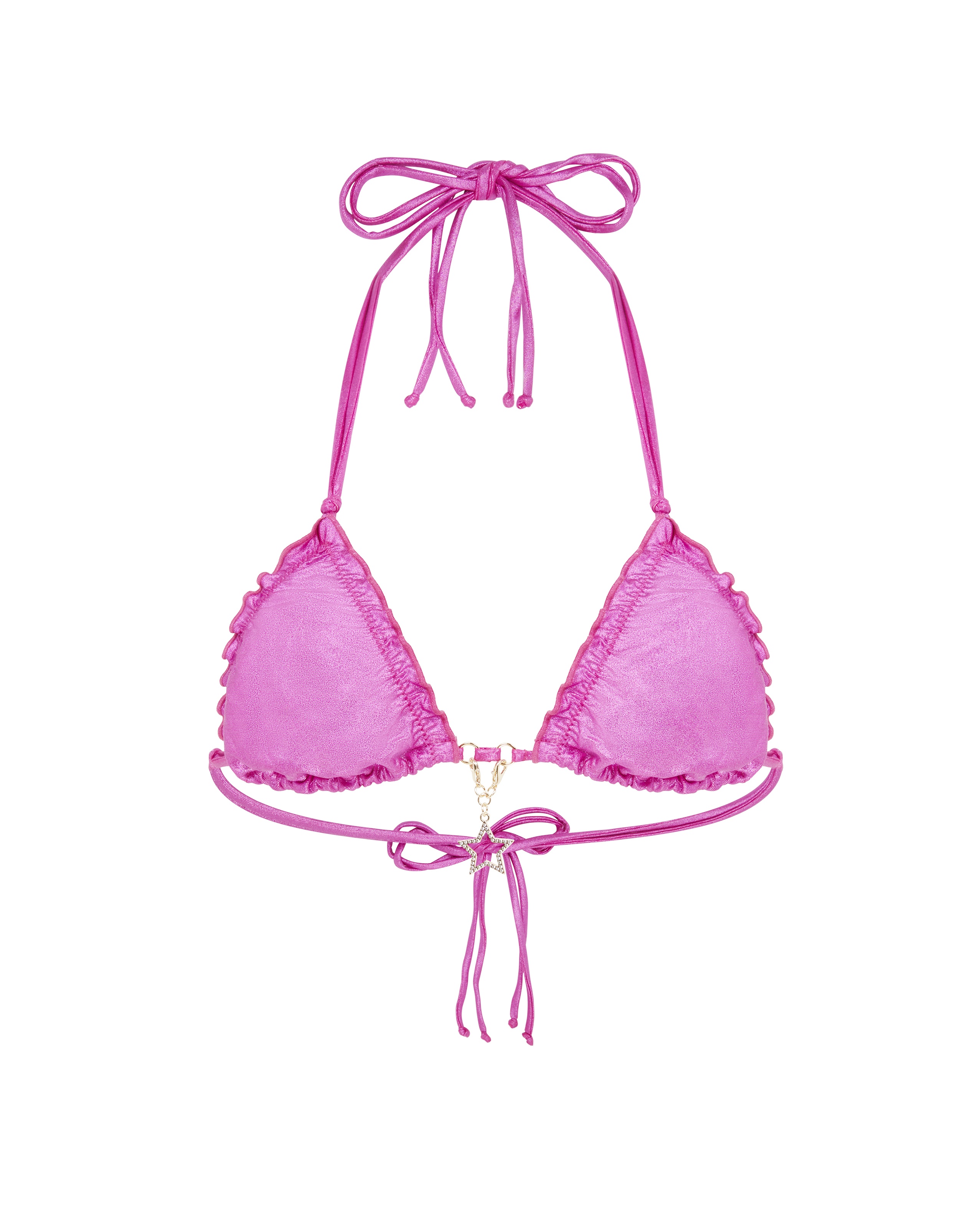 Топ купальника Berry цвета фуксии на бретелях-халтер. Треугольные чашки с регулируемой сборкой. Роскошная итальянская купальная ткань, игривые оборчатые края. Между чашками свисает подвеска в виде звезды с кристаллами и водостойким покрытием. Комбинируйте с плавками Berry для завершения яркого образа.