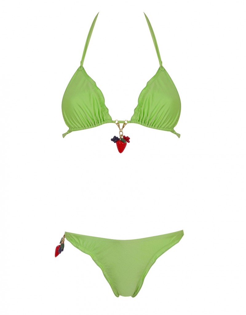 Окунитесь в тропическую жару в потрясающем бикини Berry насыщенного зеленого цвета , выполненном в бразильском стиле. Бюстгальтер с треугольными чашечками украшает оборка по краю и отстегивающиеся подвески с фруктами, создающие утонченный и игривый пляжный образ.
