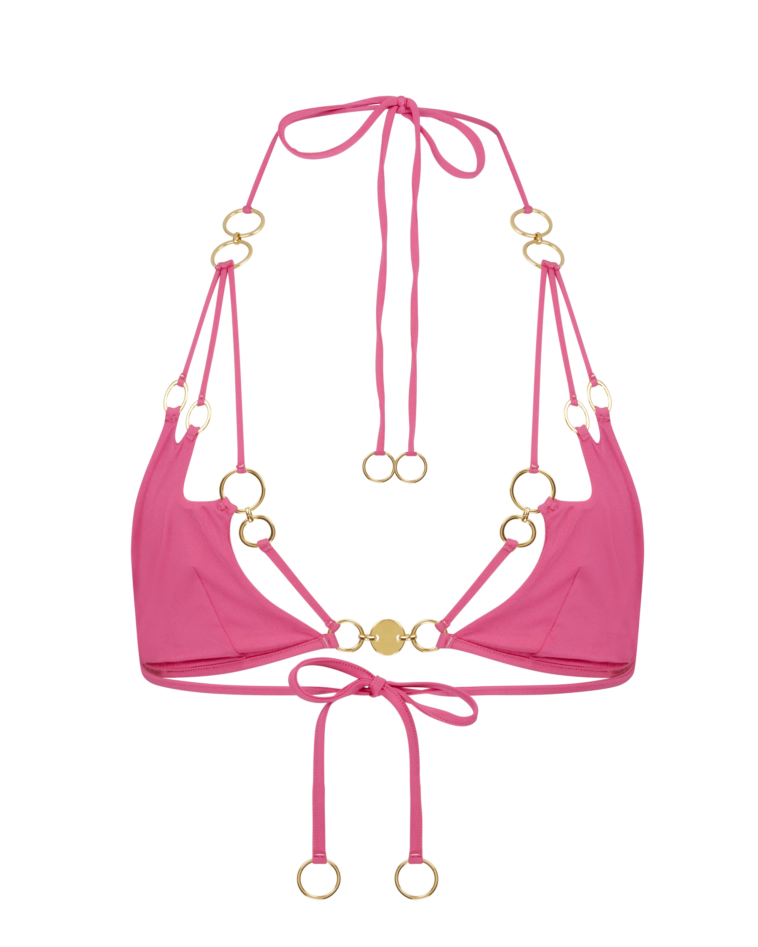Бюстгальтер купальника Davine в ярком цвете фуксия дополнит яркий пляжный образ в паре с плавками из этой же коллекции. Модель с мягкими треугольными чашечками сшита из гладкого материала и дополнена множеством золотистых колечек. Отличительной особенностью этого бюстгальтера стали тонкие перемычки, которые создают эффект соблазнительных вырезов.