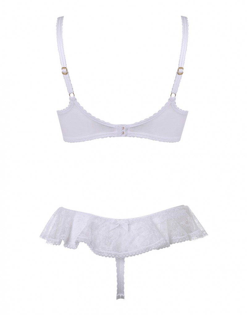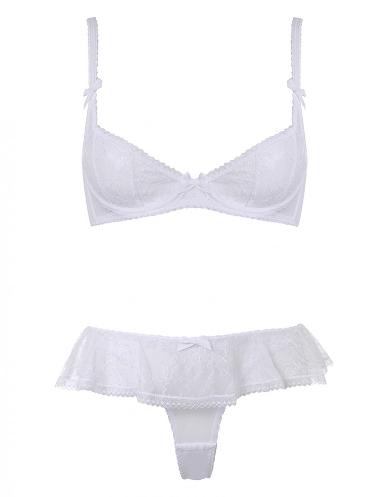 Незабываемо красивая кокетка Fee - модель из полупрозрачного белого кружева, которая соблазнительно обнажает тело. Трусики стринги украшены очаровательной оборкой вдоль талии и маленькими белыми бантиками. - Модель из свадебной коллекции Fee - Трусики стринги Материалы и уход: Основной материал: 60% полиамид, 40% эластан. Подкладка: 60% полиамид, 40% эластан. Сетка: 100% полиамид. Черная вышивка: 100% хлопок. Блестящая вышивка: 100% полиэстер. Рекомендована ручная стирка.