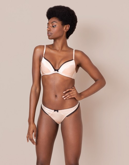 Прекрасная Felinda - воплощение повседневной элегантности в классических цветах Agent Provocateur. Трусики стринги из шелкового сатина телесного цвета с тонкими швами украшает оторочка черным кружевом и черный шелковый бантик на талии.