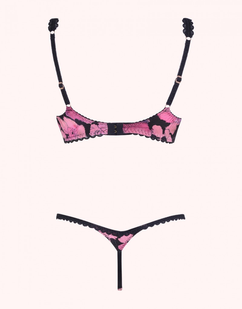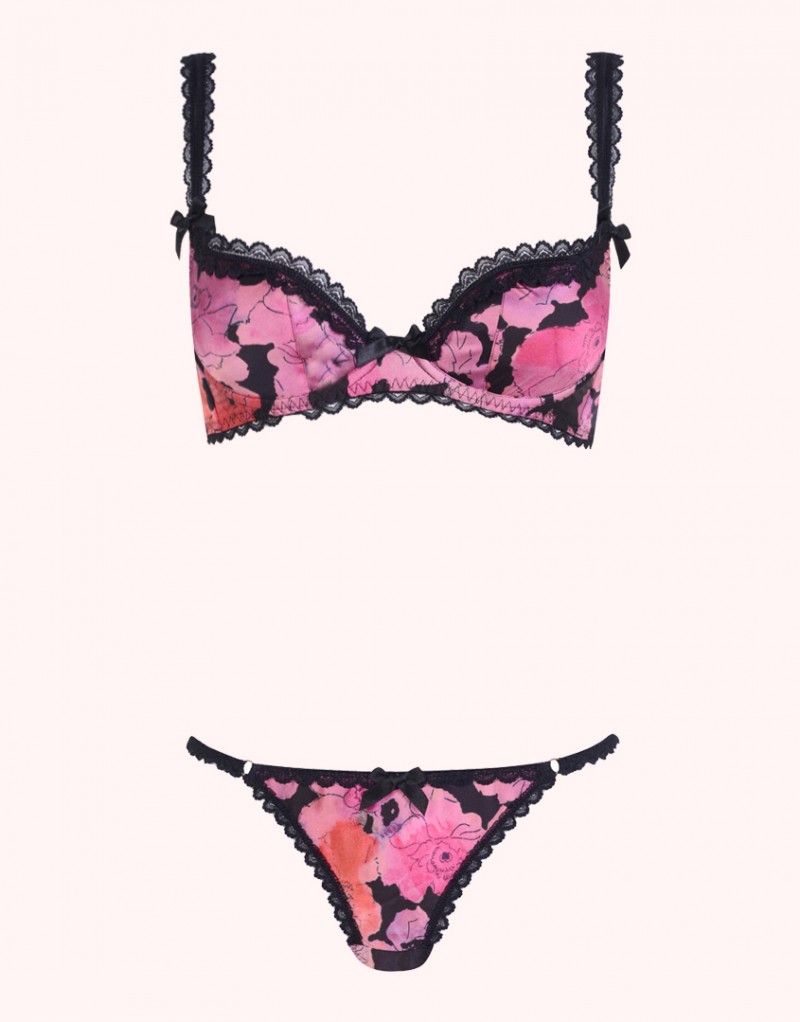 Озорную June отличают яркий цветочный принт и игривый нрав. Трусики стринги из шелкового стрейч сатина с флоральным узором в стиле 1930-х годов оторочены широкой лентой черного кружева. Металлические колечки на бедрах завершают образ.
