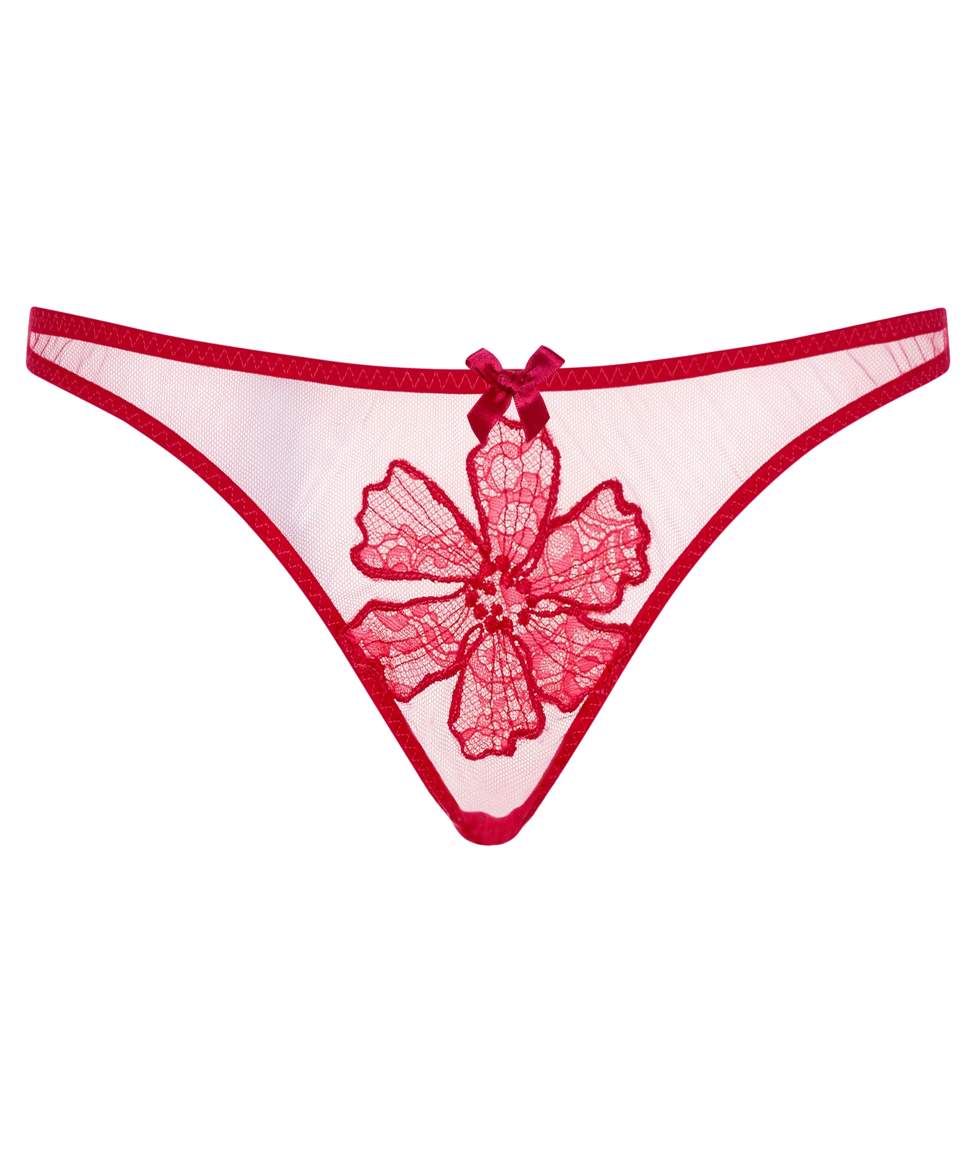 Seraphina - настоящее воплощение женственности, украшающее тело яркими цветами. Алые трусики стринги из тюля декорированы восхитительной австрийской цветочной вышивкой, дизайн которой был специально разработан для Agent Provocateur. Тонкие сатиновые ленты по бокам и красная оторочка подчеркивают силуэт. Маленький бантик на талии завершает образ.