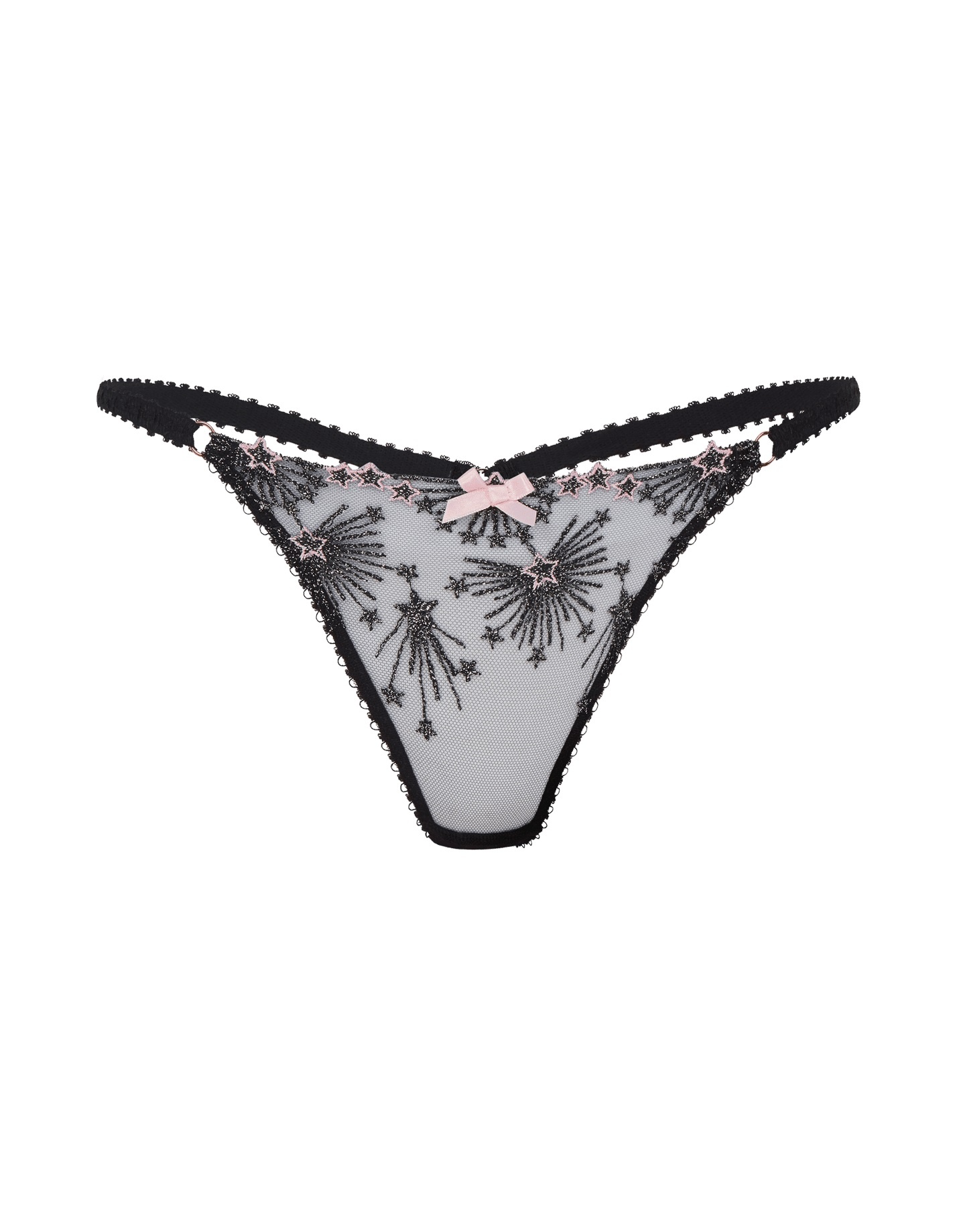 Трусики-стринг из серии Kaylie дополнят роскошный и загадочный образ в духе Agent Provocateur. Модель выполнена из тонкой и эластичной сетки, расшитой мерцающими звездами и лучами. Изящные перемычки по бокам дополнены соблазнительными колечками.