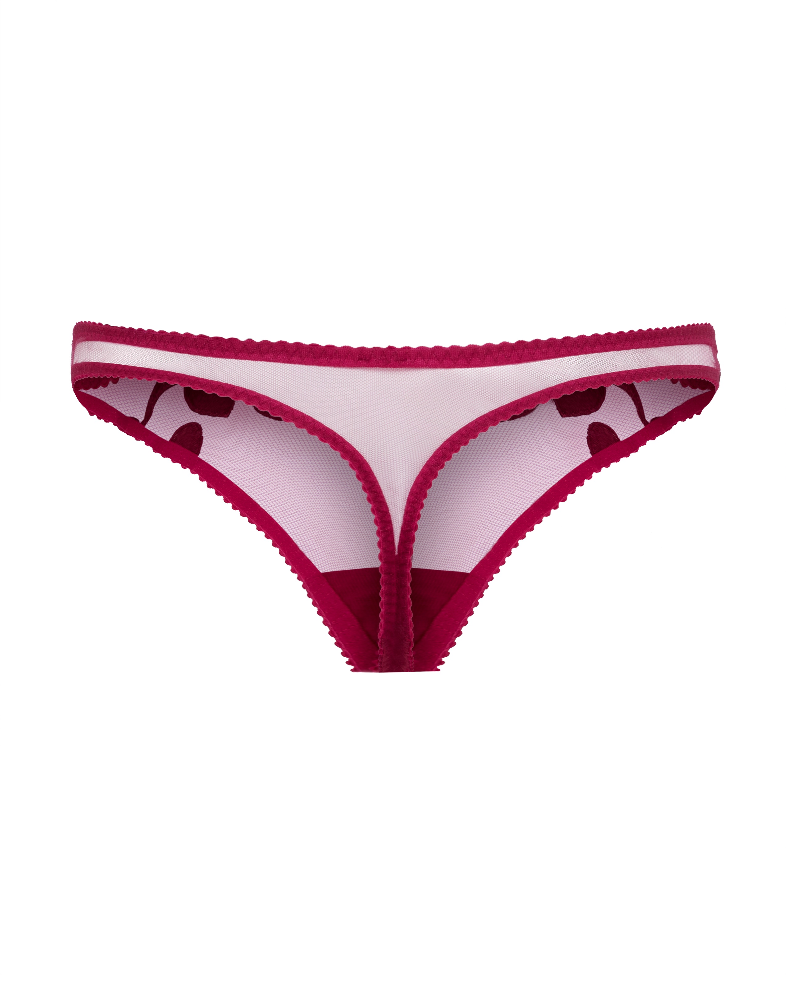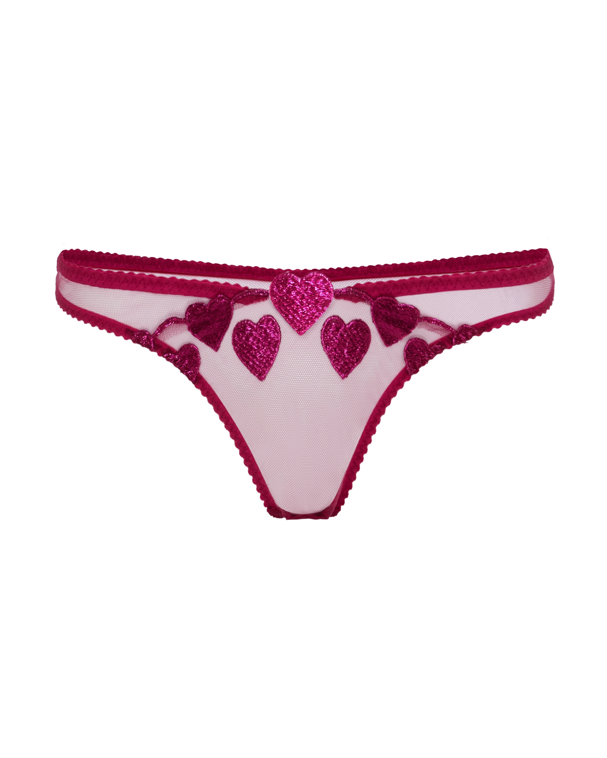 Стринги Liliya в оттенке маджента из прозрачного мерцающего тюля с люрексом. Вышитые фольгированные сердечки создают игривый акцент. Финальный штрих сияющего ансамбля Liliya.