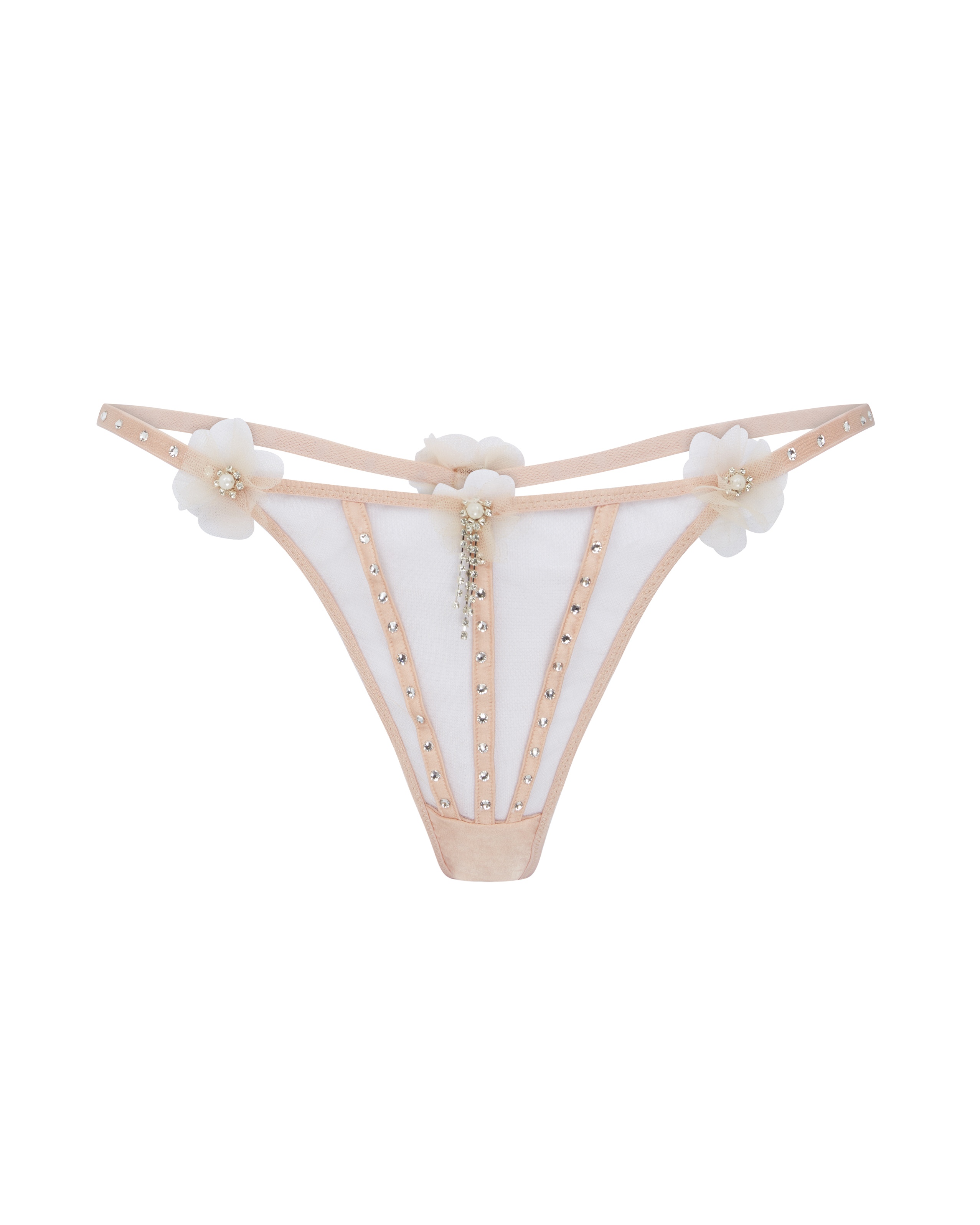 Трусы стринги песочного цвета Evangelene выполнены из прозрачного тюля. Изделие украшено рюшами и цветами из того же материала, а также кристаллами и жемчугом. Благодаря шелковой ластовице и отделке, эти трусы обеспечивают не только красоту, но и комфорт в носке. Идеально сочетаются с другими элементами коллекции Evangelene для создания мечтательного и романтического образа.