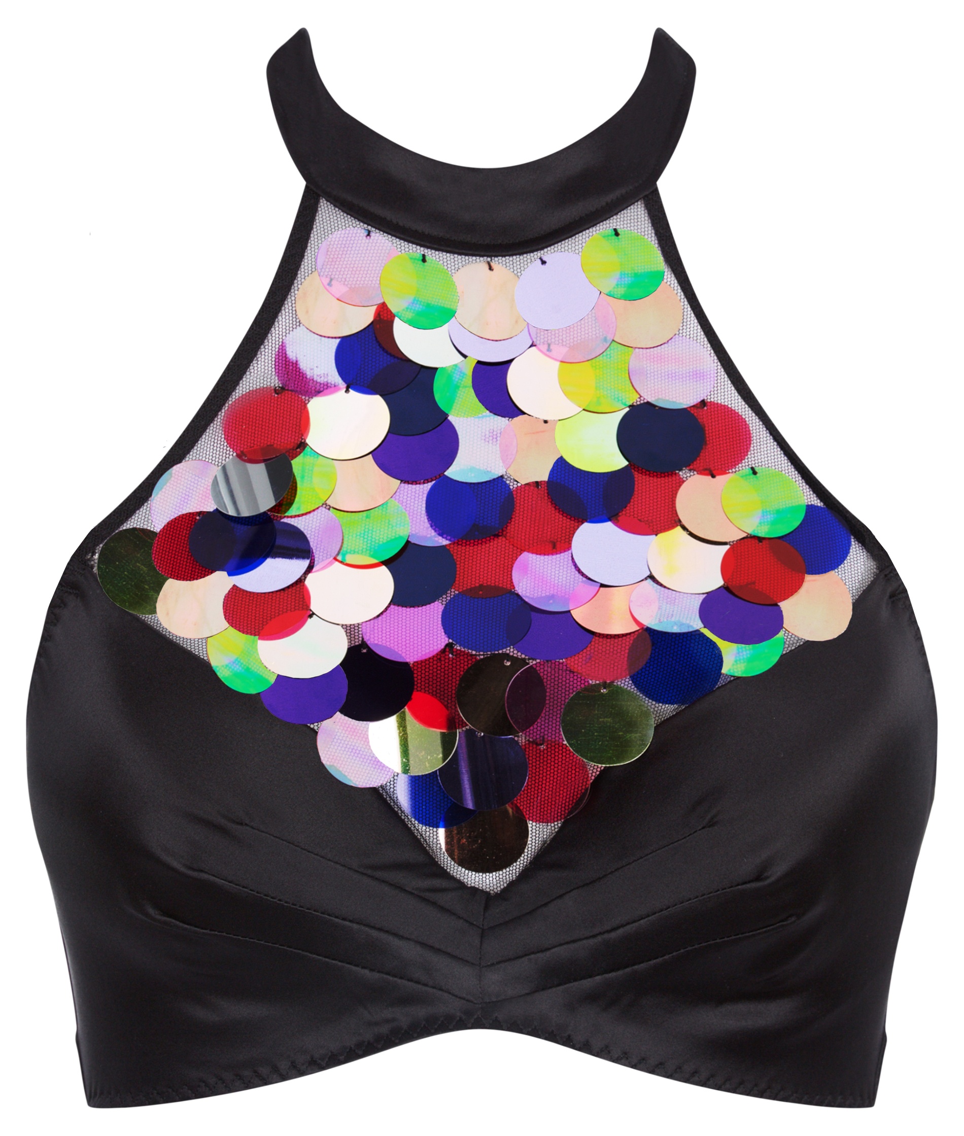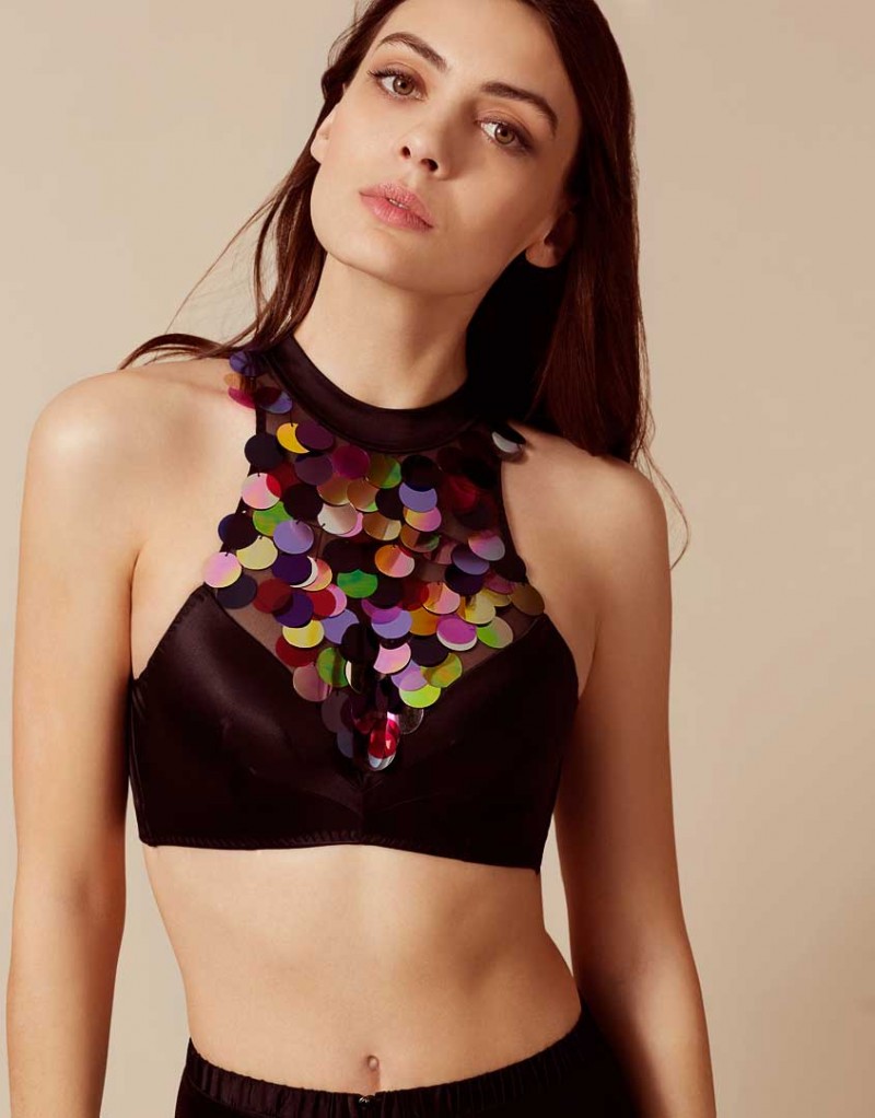 Начните вечеринку в Reno - потрясающем бюстгальтере из гладкого блестящего крепдешина. Высокий бюстгальтер спереди украшает панель из полупрозрачного черного тюля, расшитая крупными разноцветными пайетками, которые эффектно отражают свет. Чашки со скрытыми косточками обеспечивают незаметную поддержку. Носите этот бюстгальтер на танцполе и позже в будуаре.