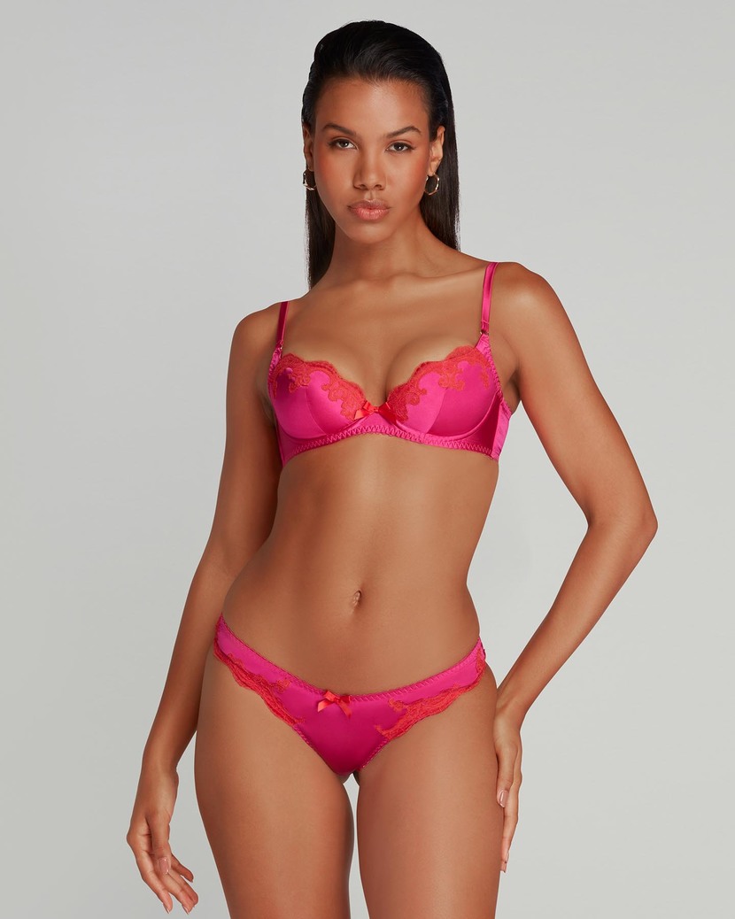 Бюстгальтер с плотной чашкой из коллекции Molly пошит из роскошного шелкового атласа насыщенного розового цвета. Модель с глубоким вырезом декорирована красным французским кружевом ручной работы и атласным бантиком в центре. Фурнитура покрыта 24-каратным золотом. На спине располагается классический крючок и застежка-ушко. Создайте элегантный образ с остальной частью коллекции.