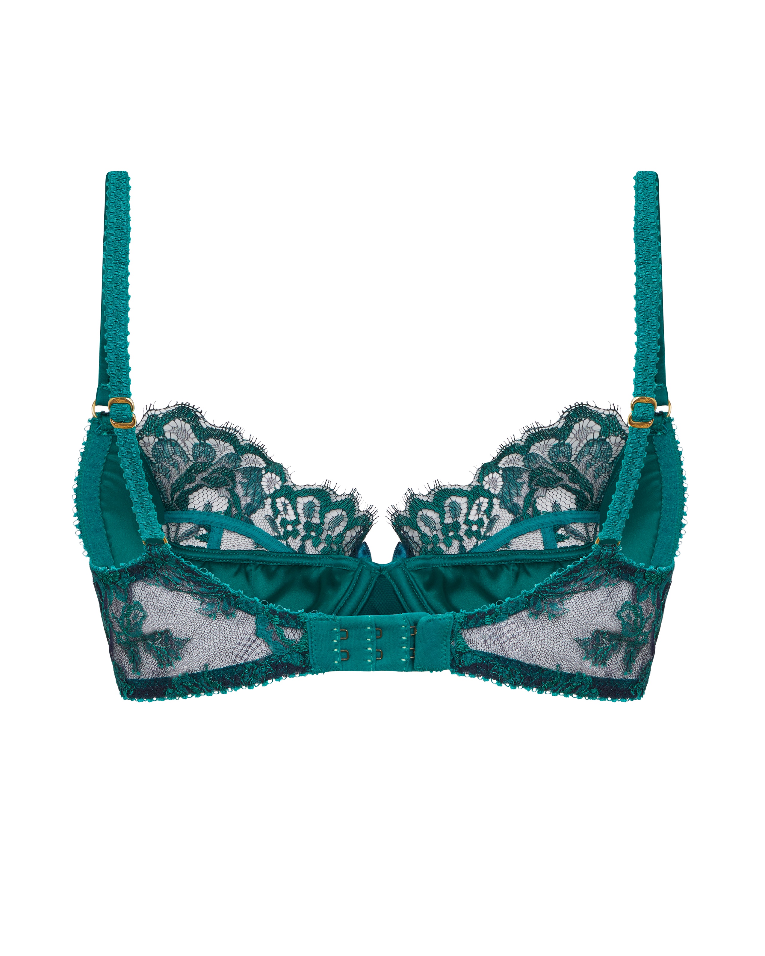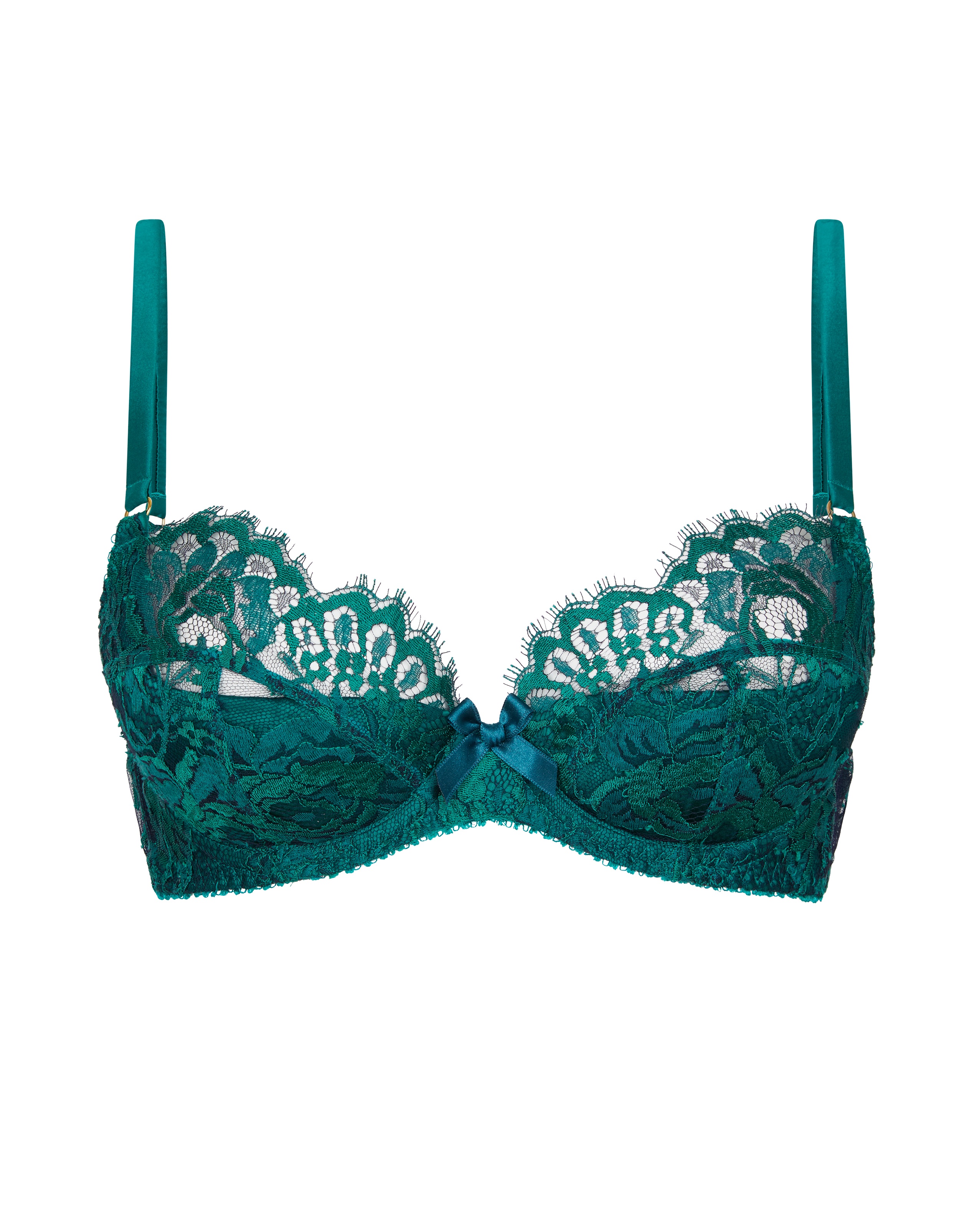Зеленый бюстгальтер Solanna с трехсекционными чашками из кружева Leavers и вкладками для поддержки. Шелковые чехлы для косточек и бретели, позолоченная фурнитура. Дополните ансамбль комплектом Solanna для безупречного вида.