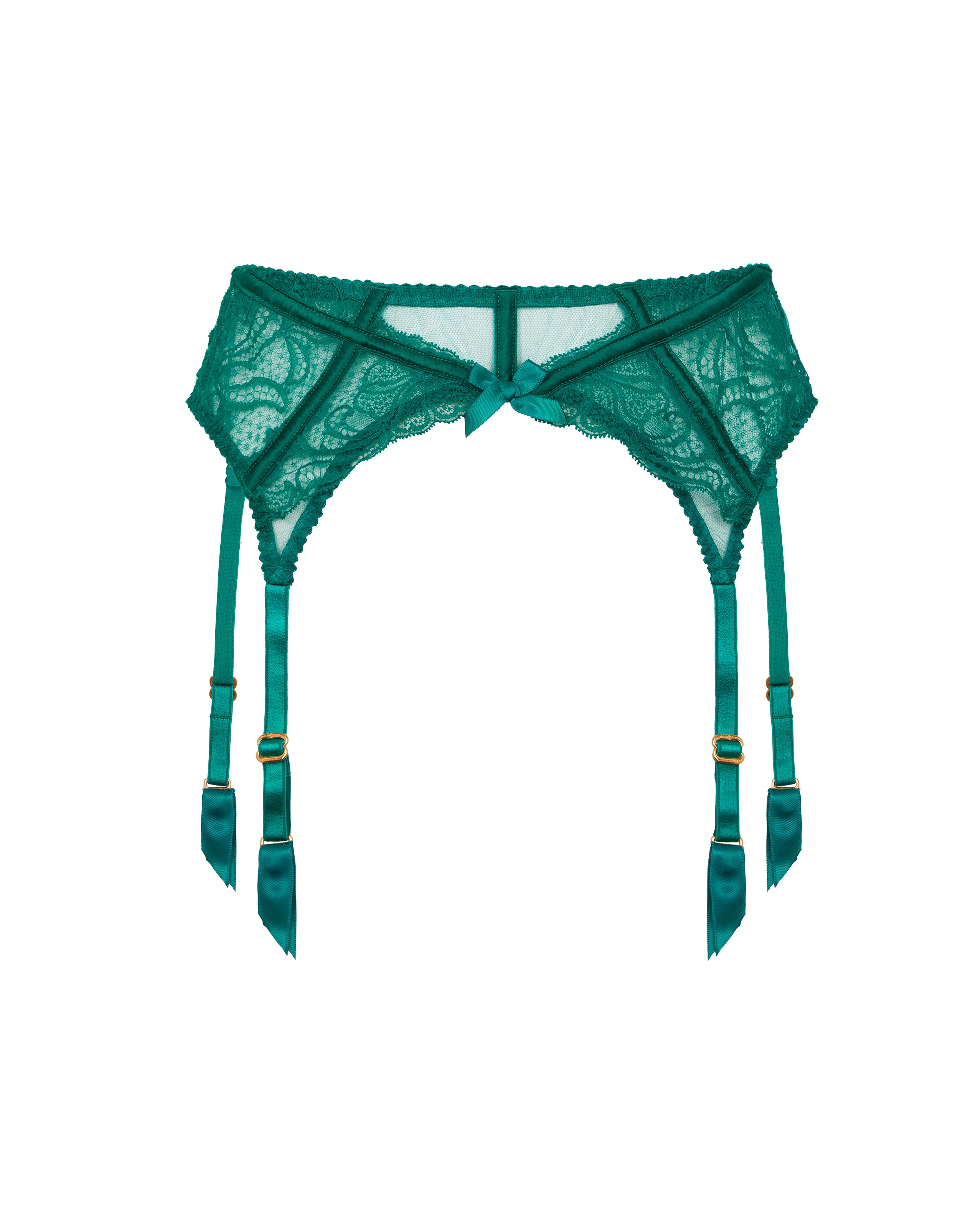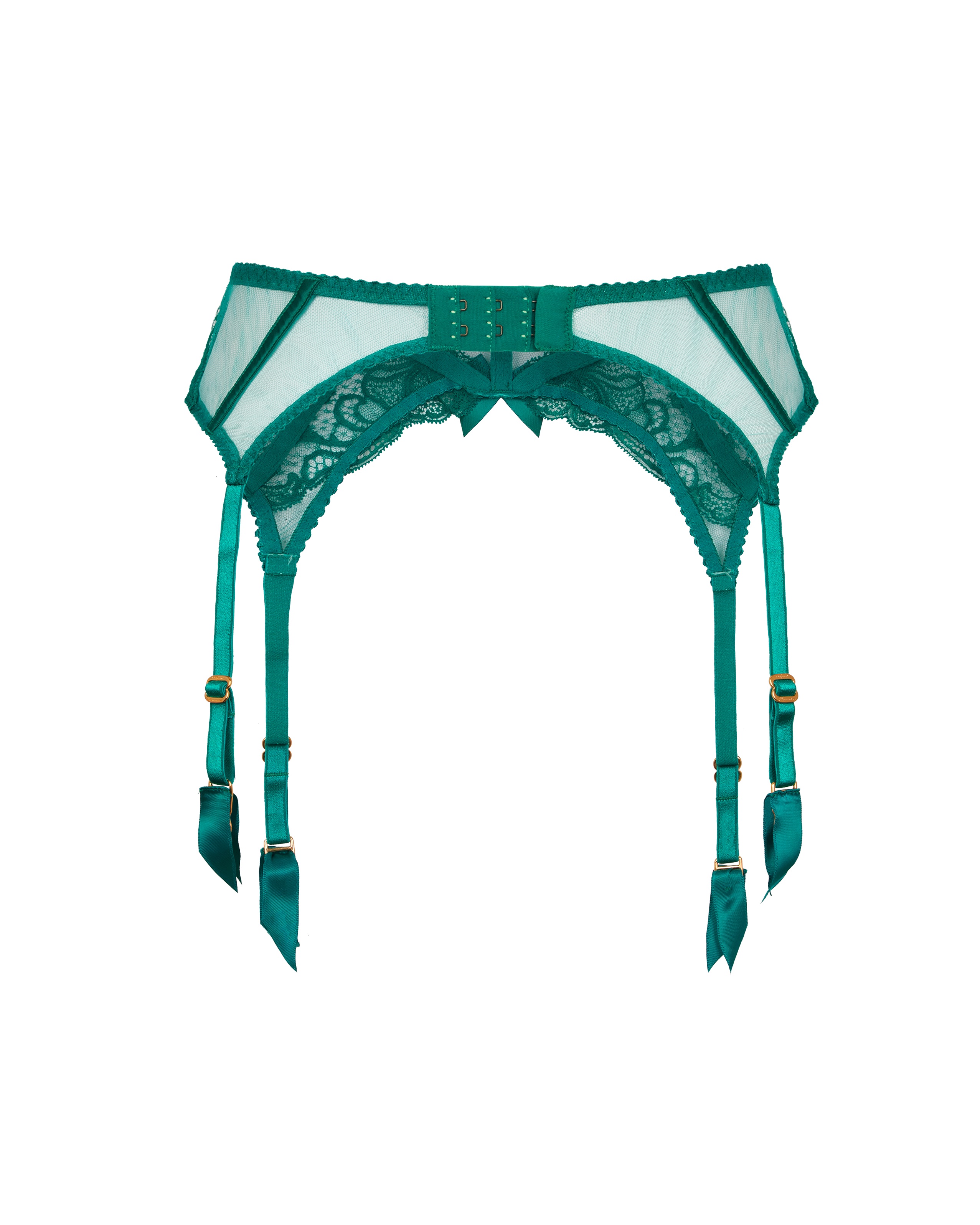 Пояс для чулок Rozlyn зеленого цвета из прозрачного тюля с кружевными вставками Leavers на бедрах. Регулируемые подвязки из шелкового атласа. Массивные швы с шелковой окантовкой создают эффект клетки на талии. Атласные банты спереди и сзади, фурнитура с покрытием из золота. Идеальный элемент соблазнительного комплекта Rozlyn.