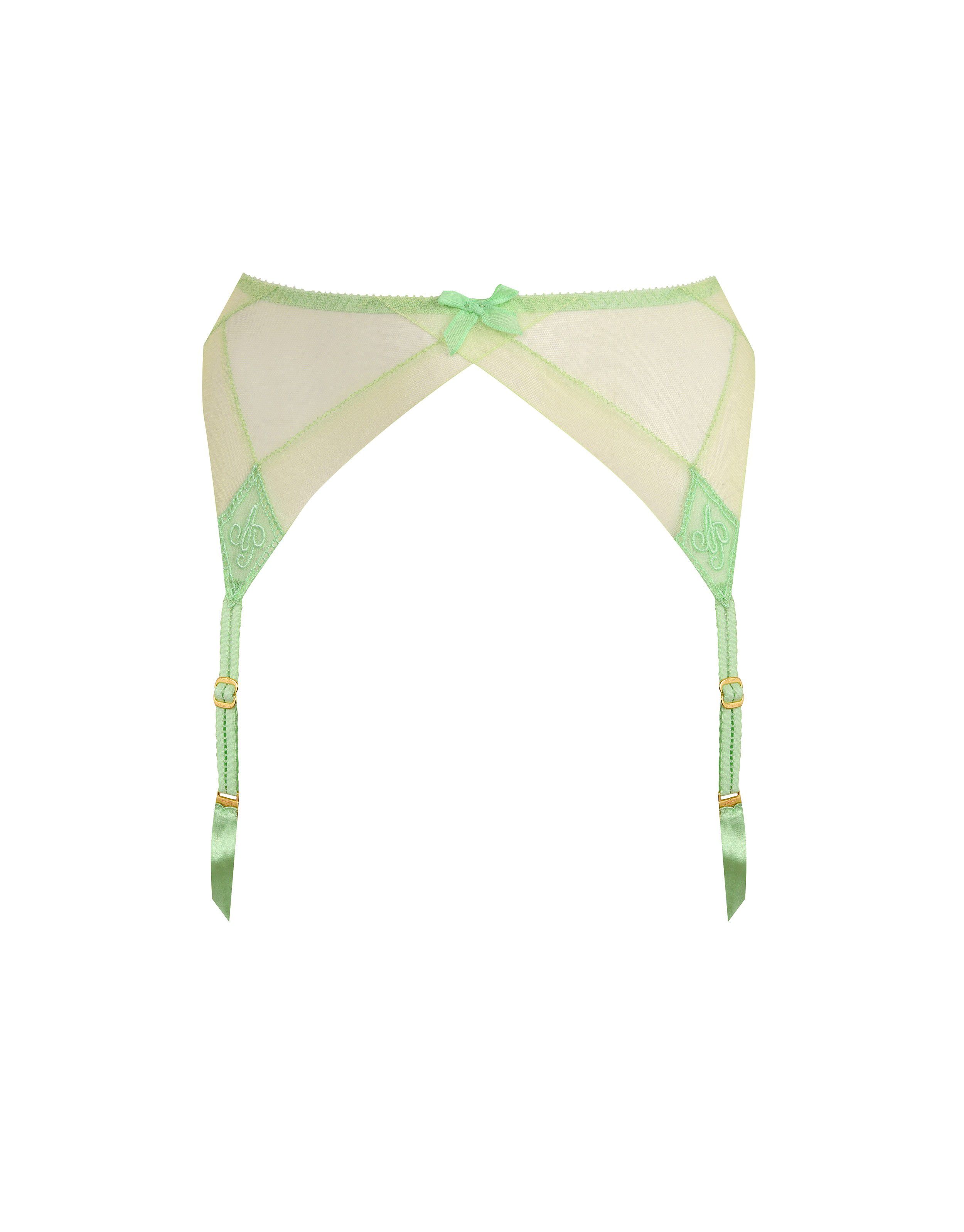 Пояс из сета Casper выполнен из тонкого тюля в необычном неоново-зеленом цвете и украшен вышитой монограммой бренда в традиционном английском стиле. Модель состоит из перекрещенных треугольников, которые создают соблазнительный эффект ритмичных вырезов. Регулируемые ремешки и застежка на крючки дополняют модель.