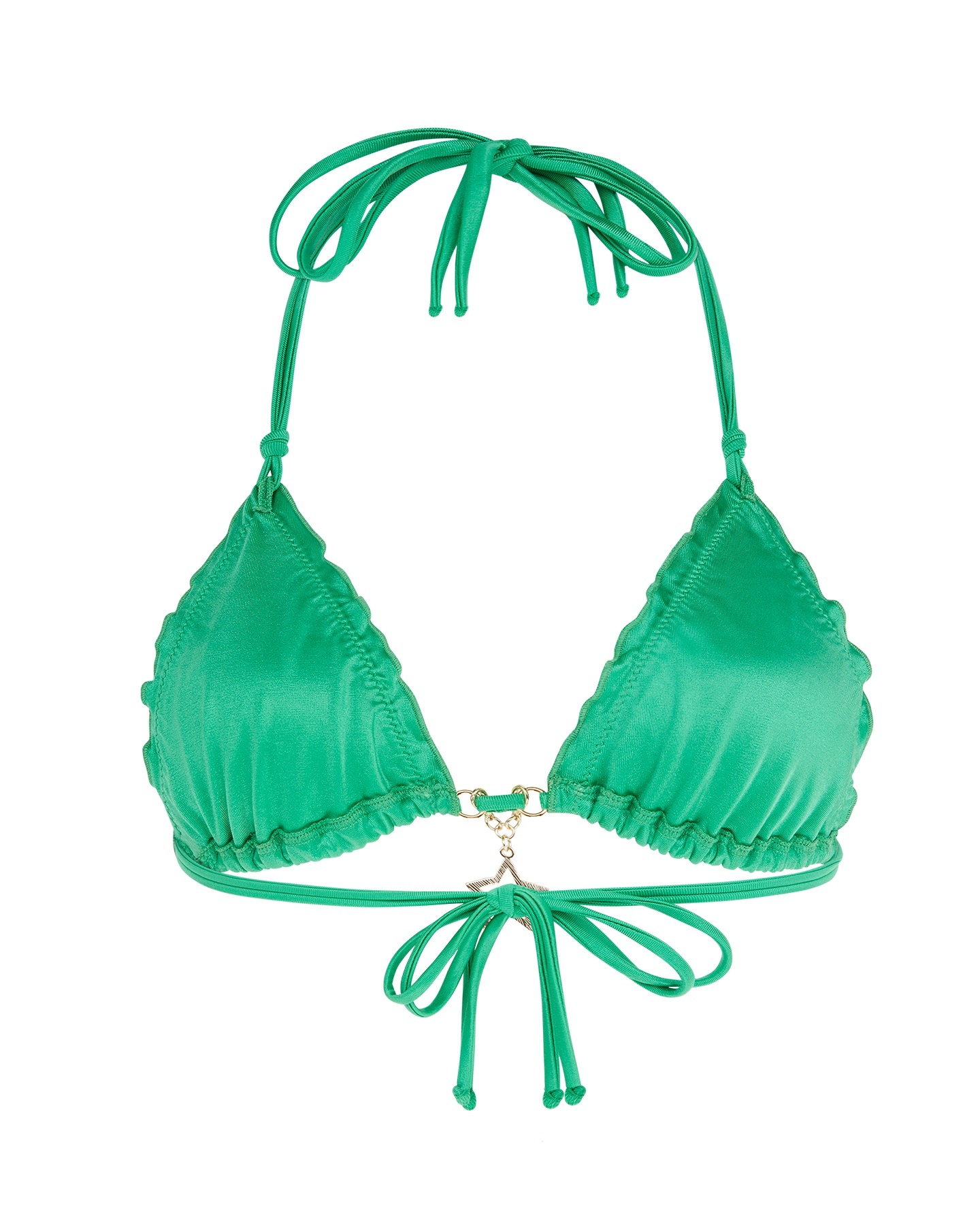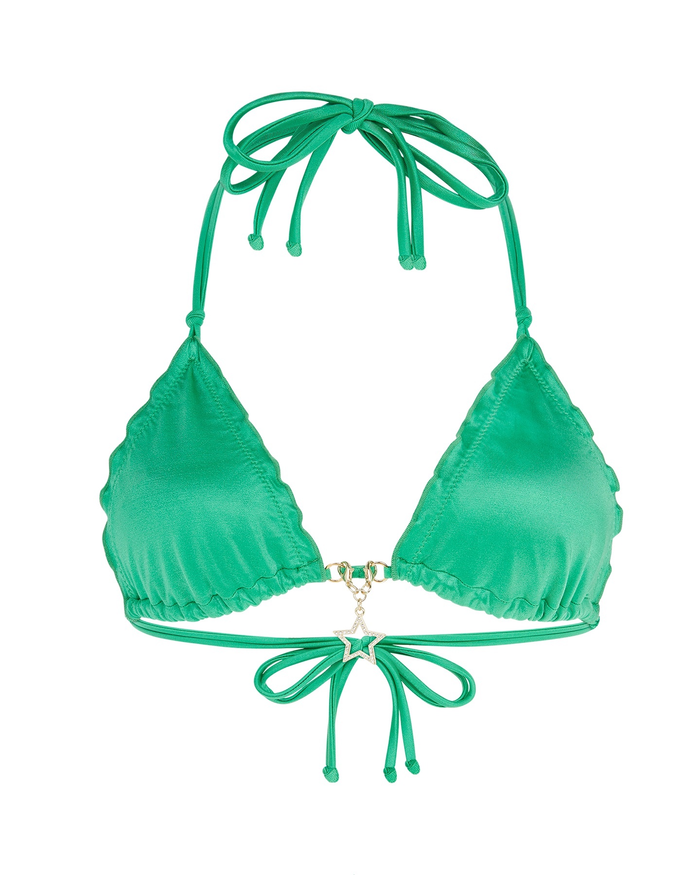 Зеленый топ-халтер Berry: треугольные чашки с возможностью регулировки, элитная итальянская ткань, рюши и сверкающая подвеска-звезда в центре. Этот верх идеален в паре с плавками Berry для игривого и гламурного образа.