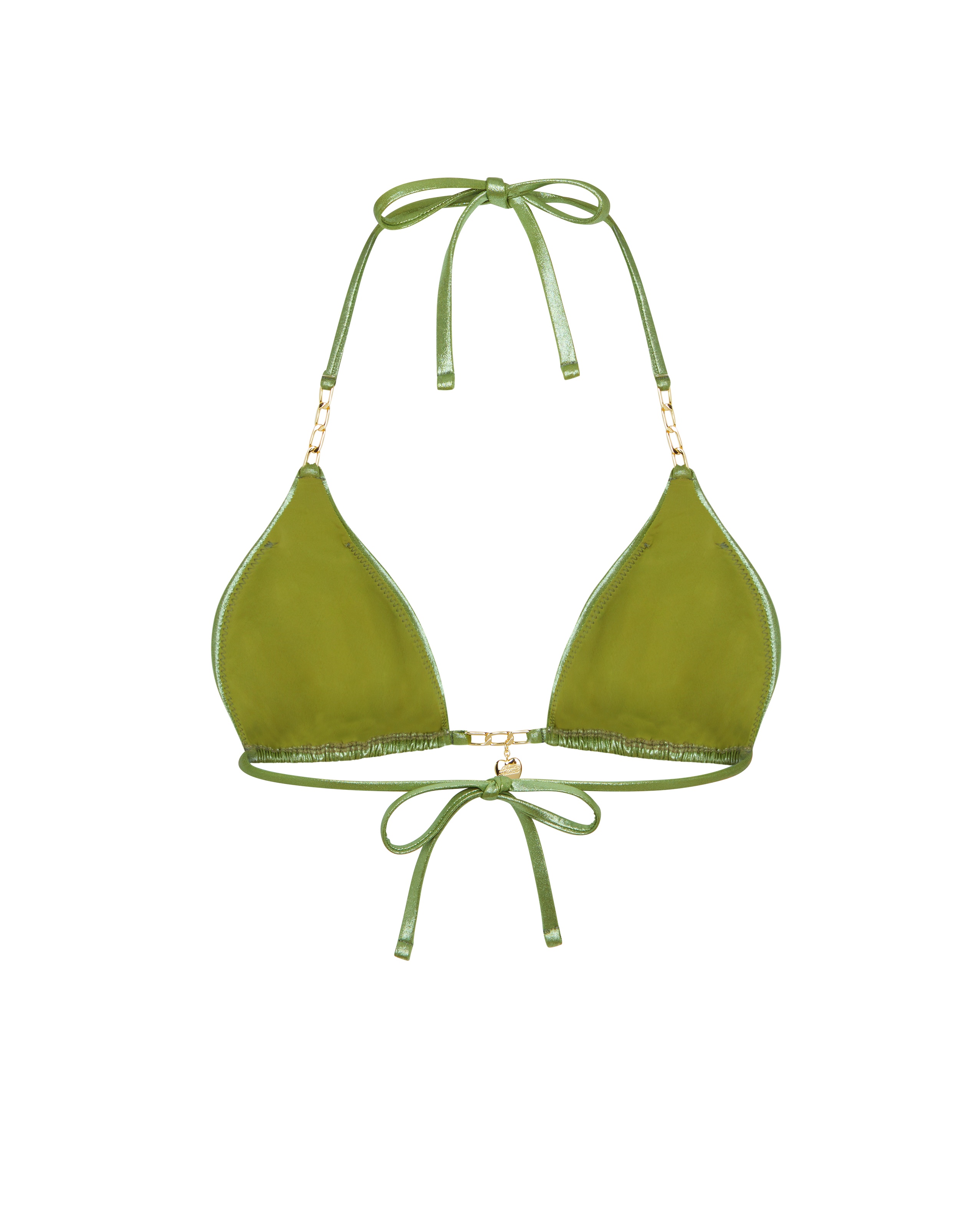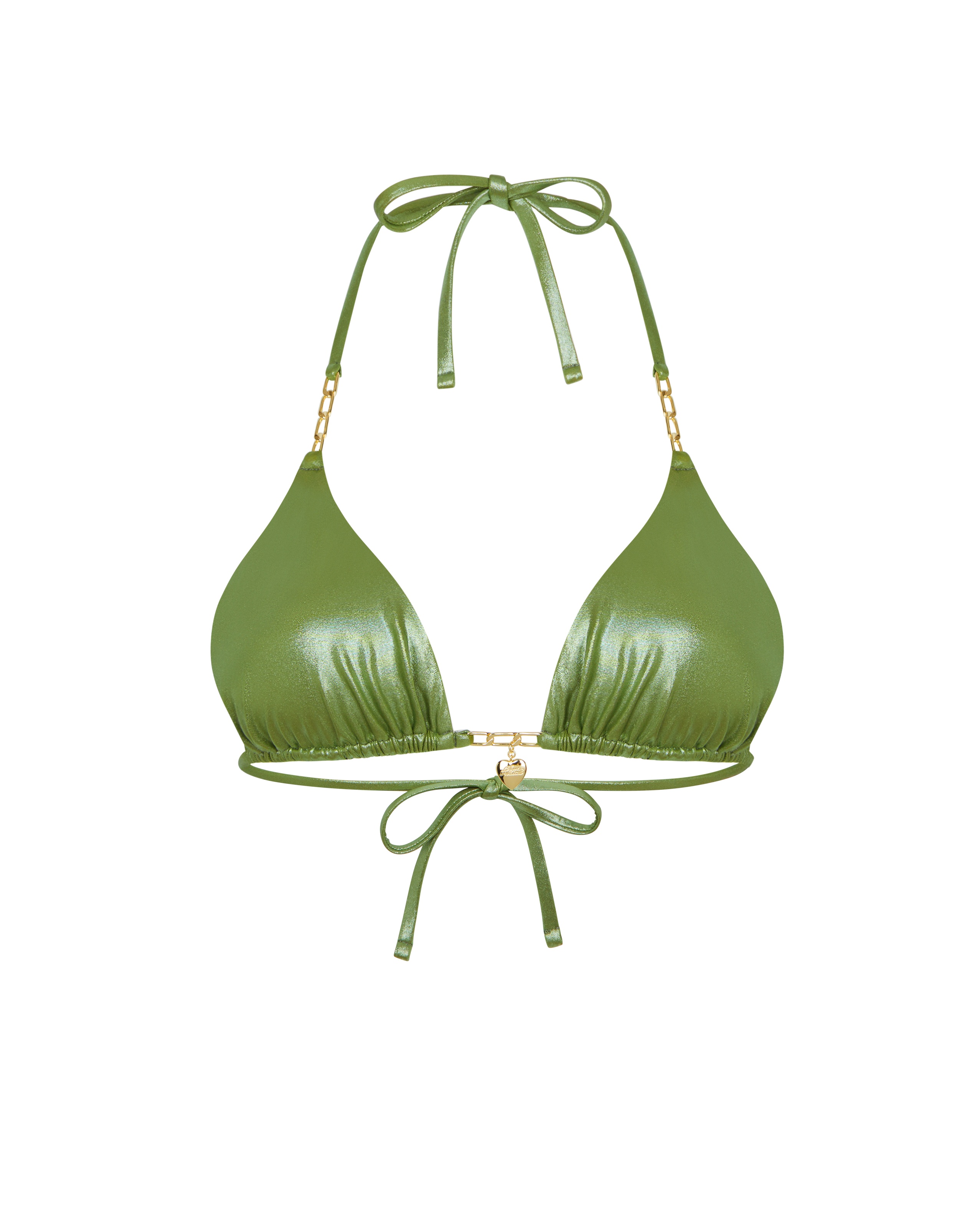 Топ-бикини Lyra зеленого цвета с треугольными чашками выполнен из итальянской ткани «ламэ» с металлическим эффектом. Массивная цепная фурнитура с подвеской в виде сердца AP. Завязки на шее и спине. Сочетайте с соответствующими плавками Lyra для завершения образа.