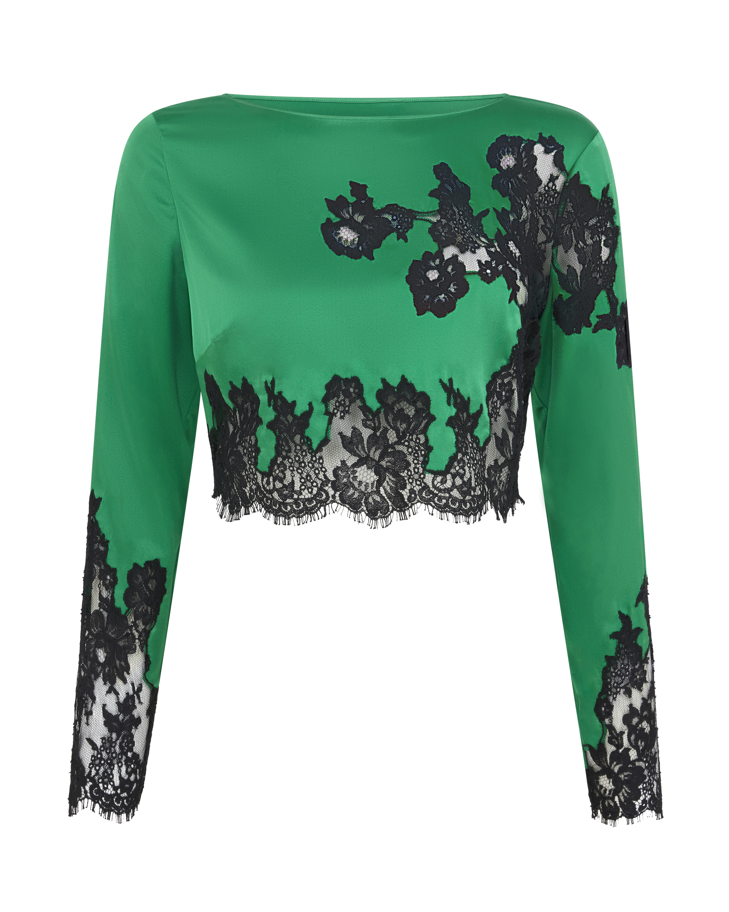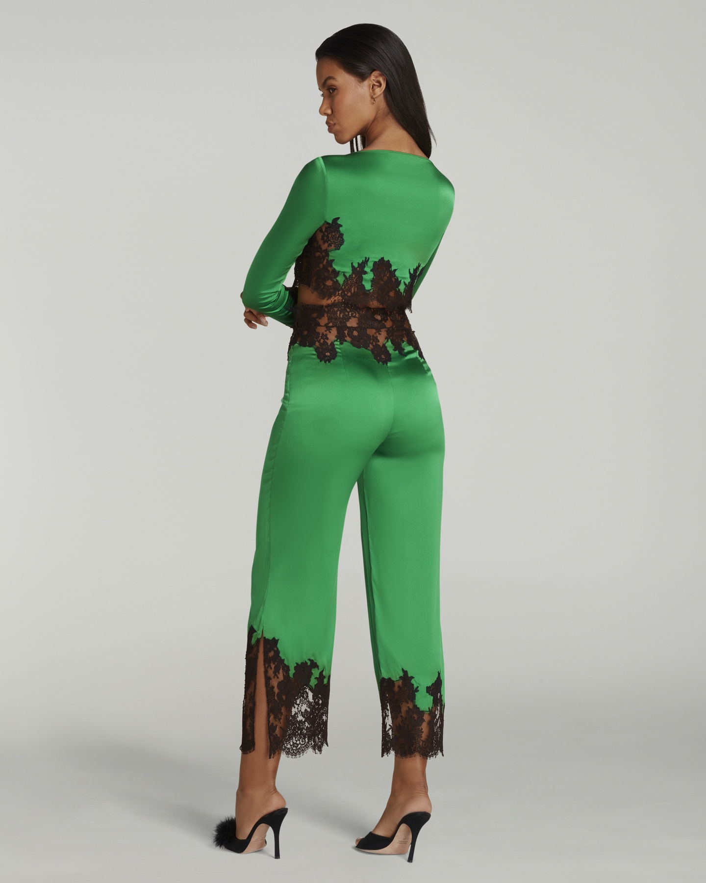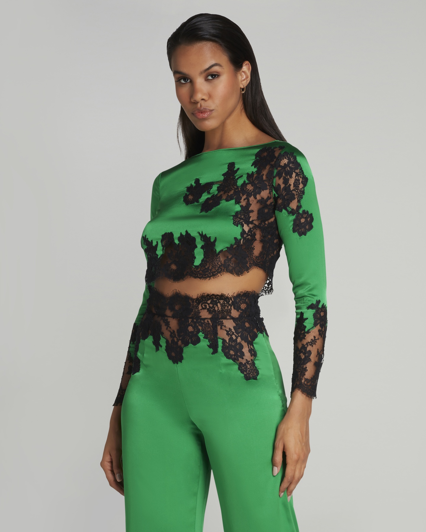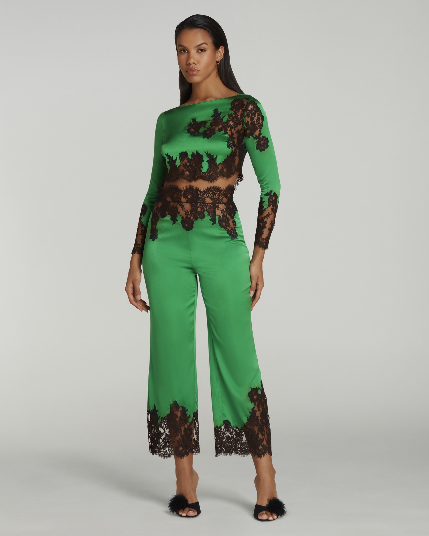 Топ Trishya зеленого цвета отличается использованием черного французского кружева Leavers с изящной бахромой. Вытачки по бокам бюста делают посадку максимально удобной и эффектной. Сочетайте с брюками из этой же коллекции для создания восхитительного вечернего наряда или шикарного образа для особых случаев.