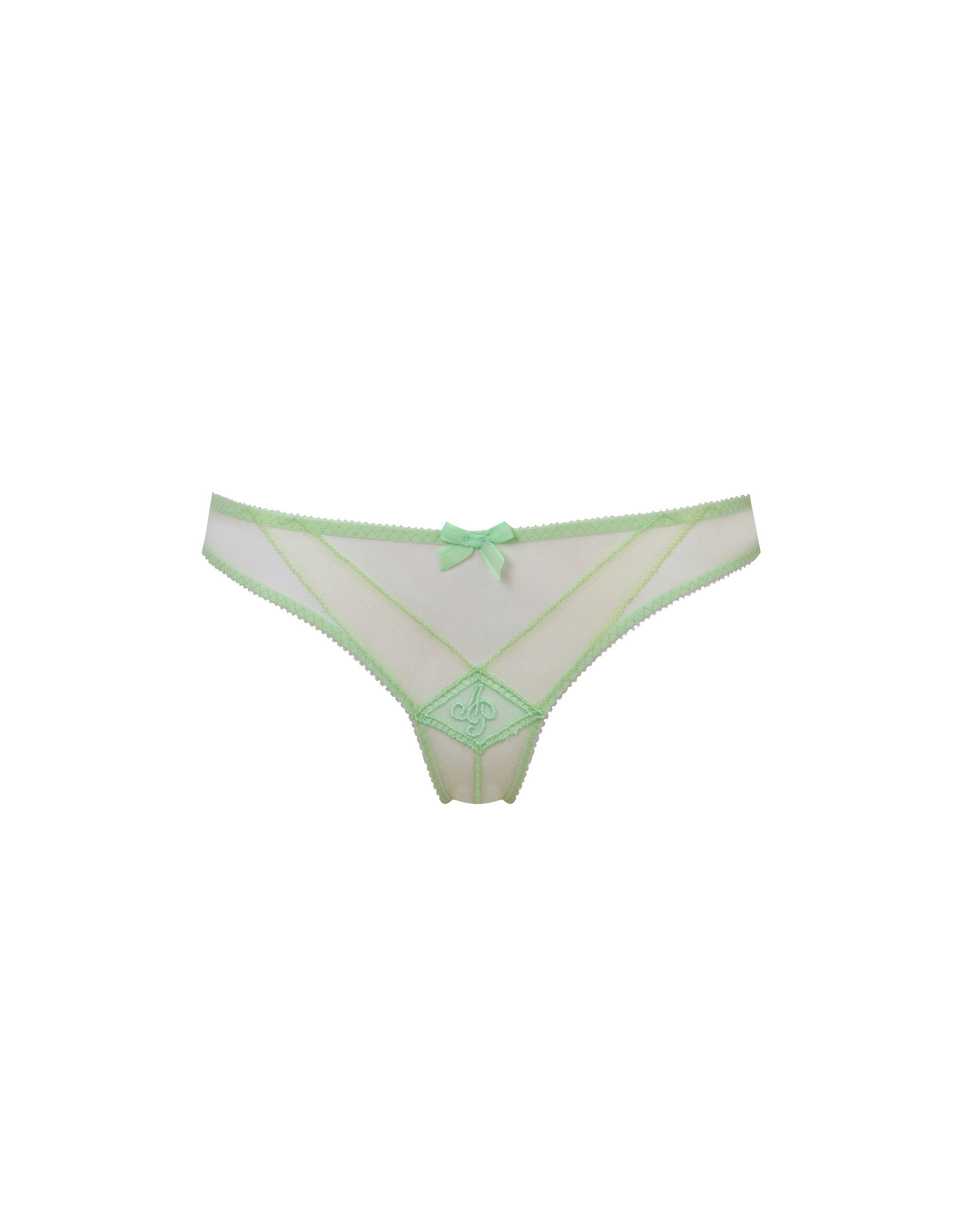 Французские трусики из коллекции Casper решены в ультрасовременном зеленом цвете и дополнены вышитой в викторианском стиле монограммой бренда. Полоски по центру подчеркивают V-образную форму модели, а завершает дизайн фирменный атласный бант. Дополнить сет стоит бюстгальтером и поясом Casper.