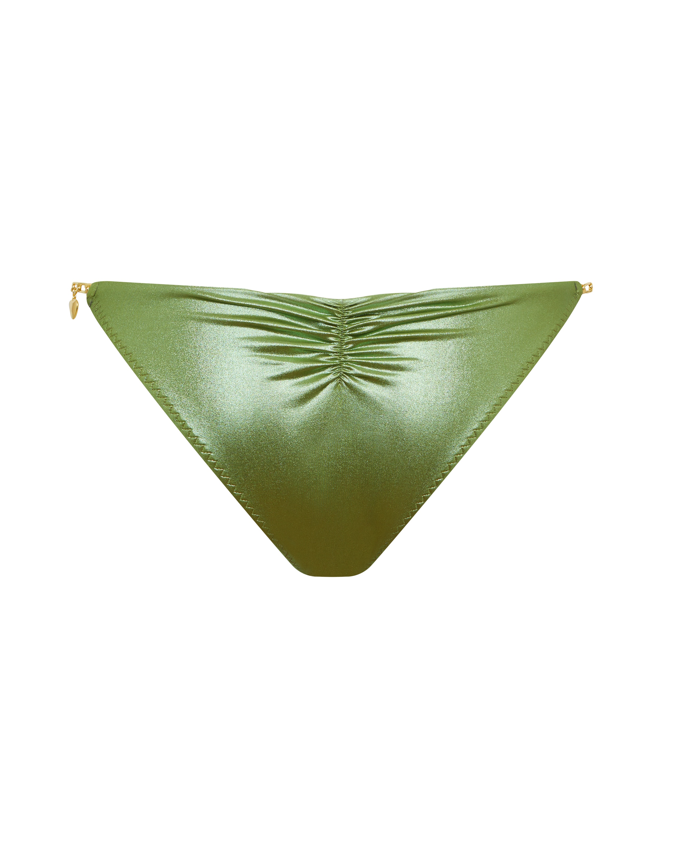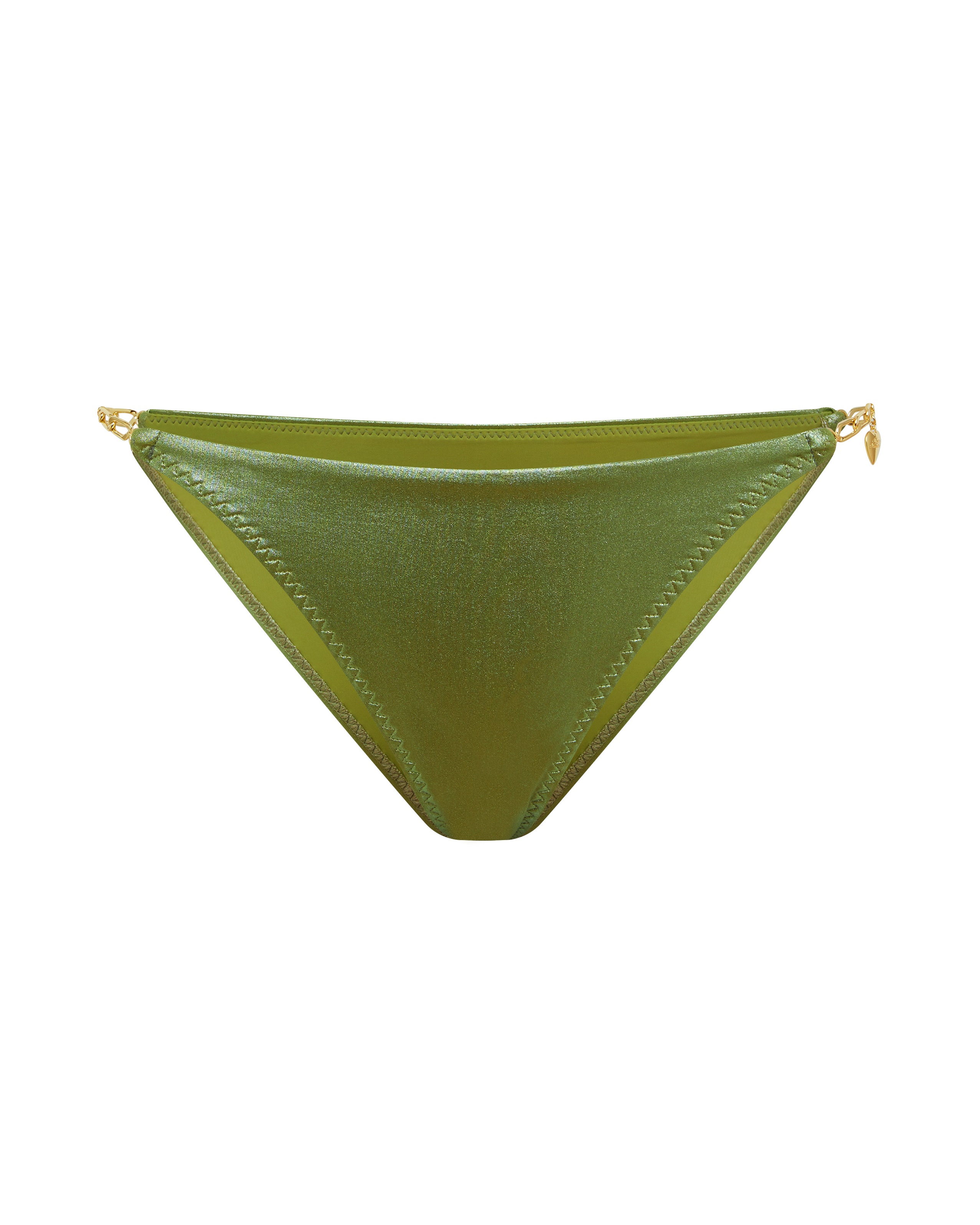 Плавки-бикини Lyra зеленого цвета с низкой посадкой выполнены из итальянской ткани «ламэ» с металлическим эффектом. Массивная цепная фурнитура с подвеской в виде сердца AP. Деталь в виде сборки на задней части подчеркивает силуэт. Завязки по бокам. Сочетайте с соответствующим топом Lyra для завершения образа.