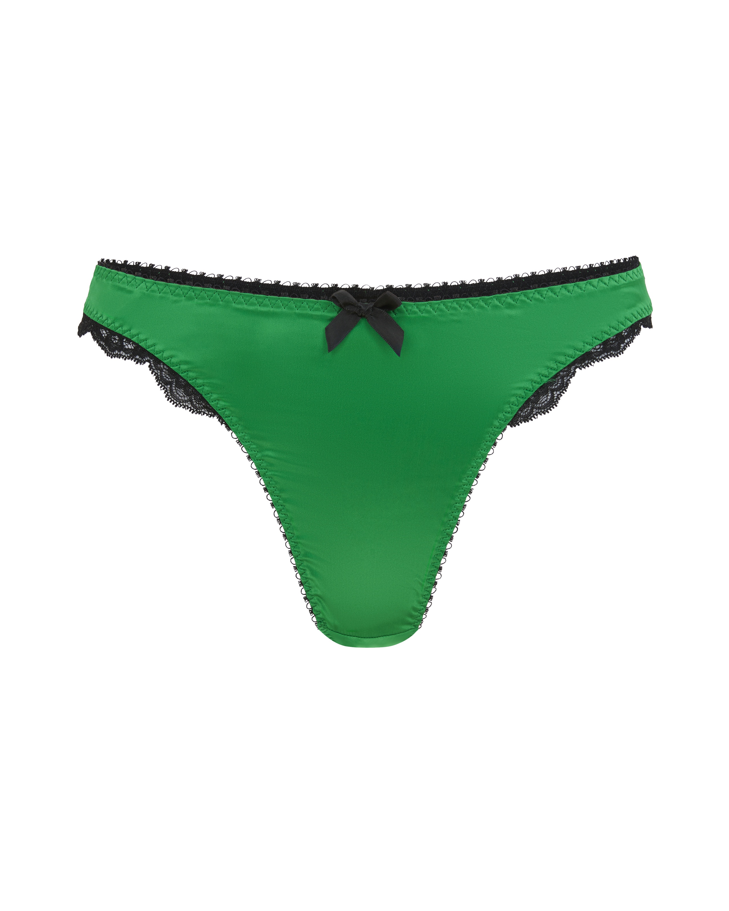 Зеленые трусы стринги Sloane имеют классическую форму AP с высокими вырезами, удлиняющими ноги. Изготовлены из мягкого эластичного сатина, с задней панелью из однотонного тюля, отделаны черным кружевом и атласными бантиками. Носите с бюстгальтером из коллекции Sloane для образа классической кинозвезды.