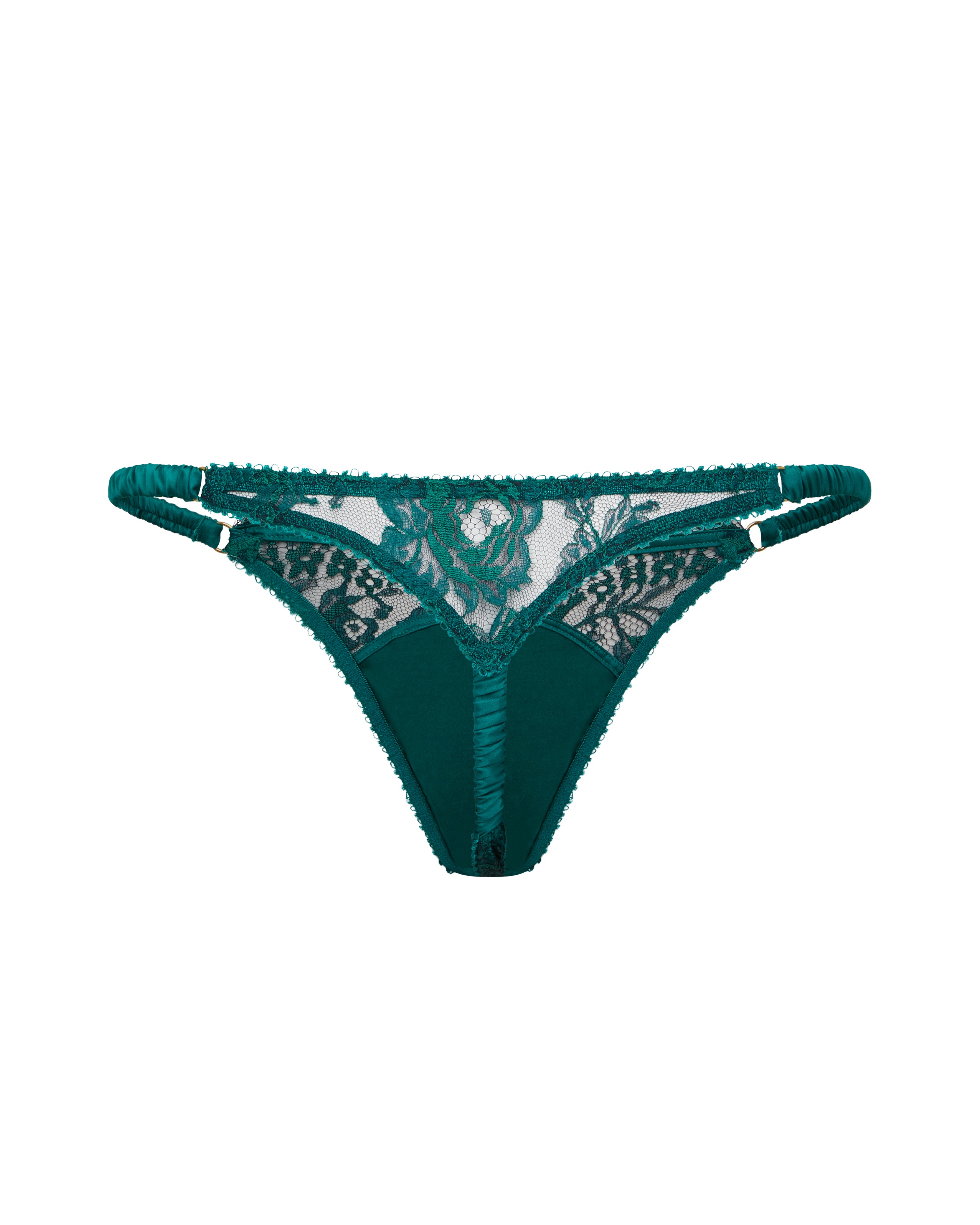 Зеленые стринги Solanna: кружево Leavers с цветочным узором, ажурный край с «ресничками» на талии. Шелковая подкладка спереди и ластовица, шелковые боковины. Завершите соблазнительный образ комплектом Solanna.