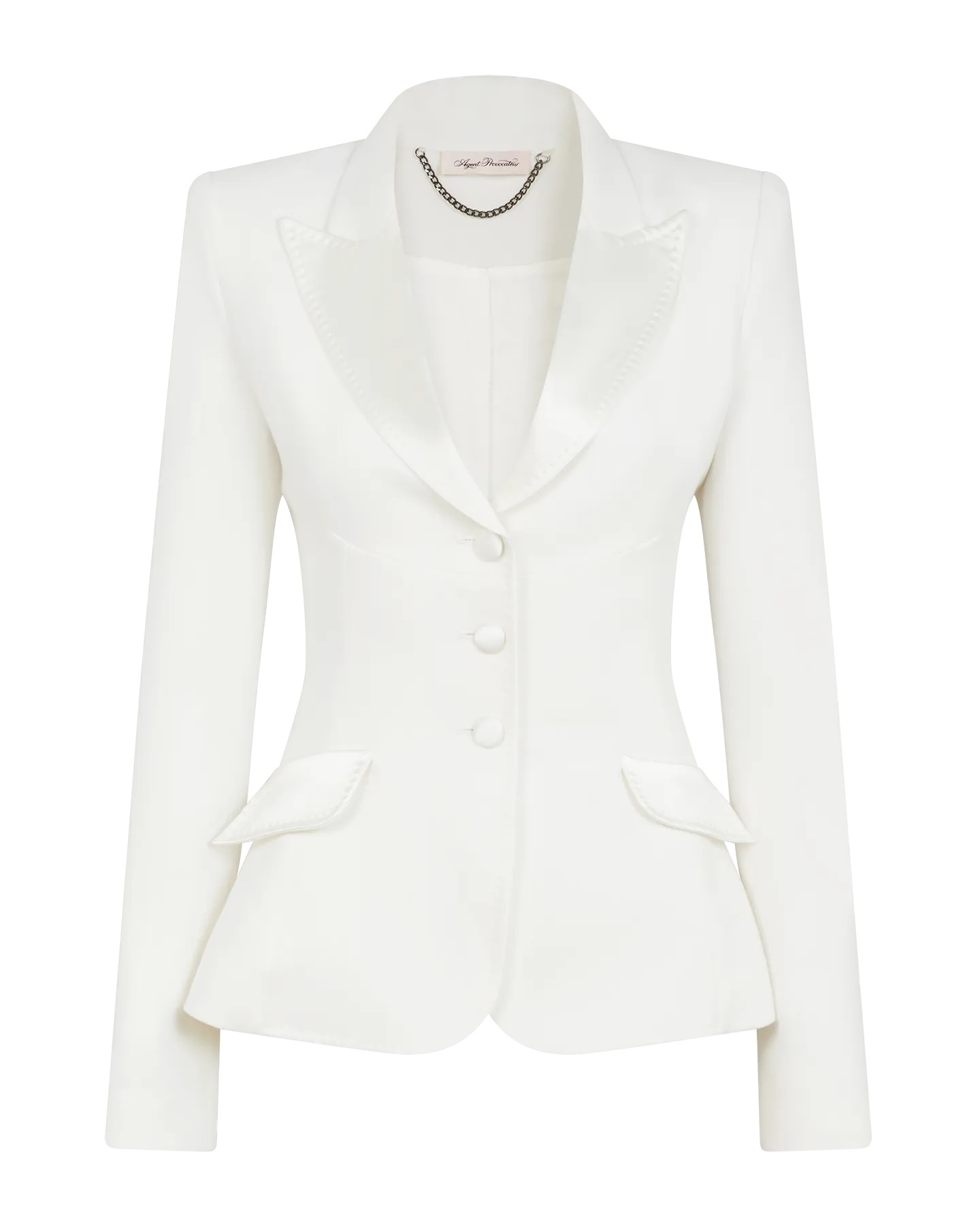 Классический жакет-смокинг Billi оттенка слоновой кости: шелковый креп, акцентированная талия, структурированные плечи. Двойная шлица сзади, лацканы и карманы с шелковой отделкой, пуговицы в шелковой оплетке. Сочетайте с юбкой Billi для завершенного образа.