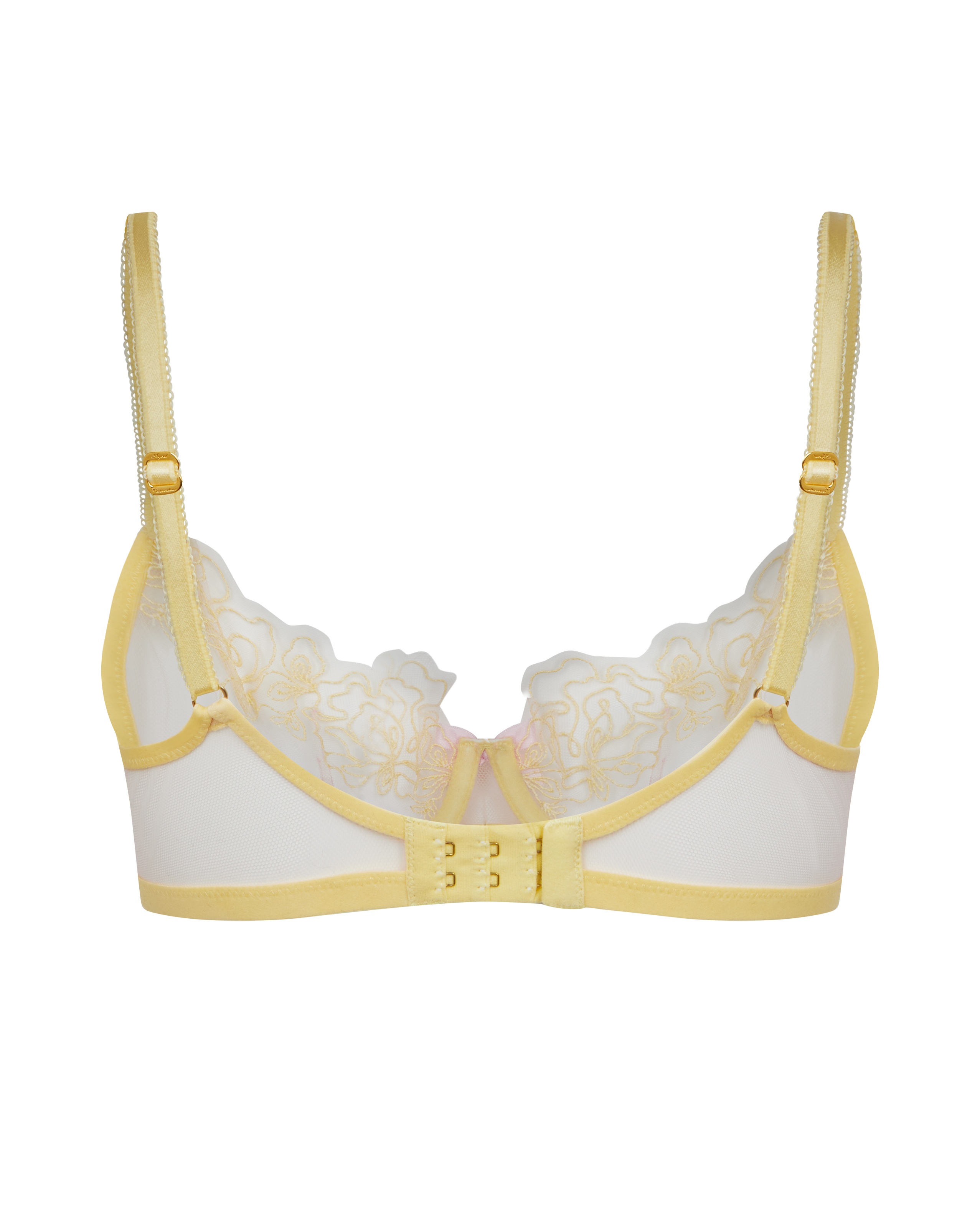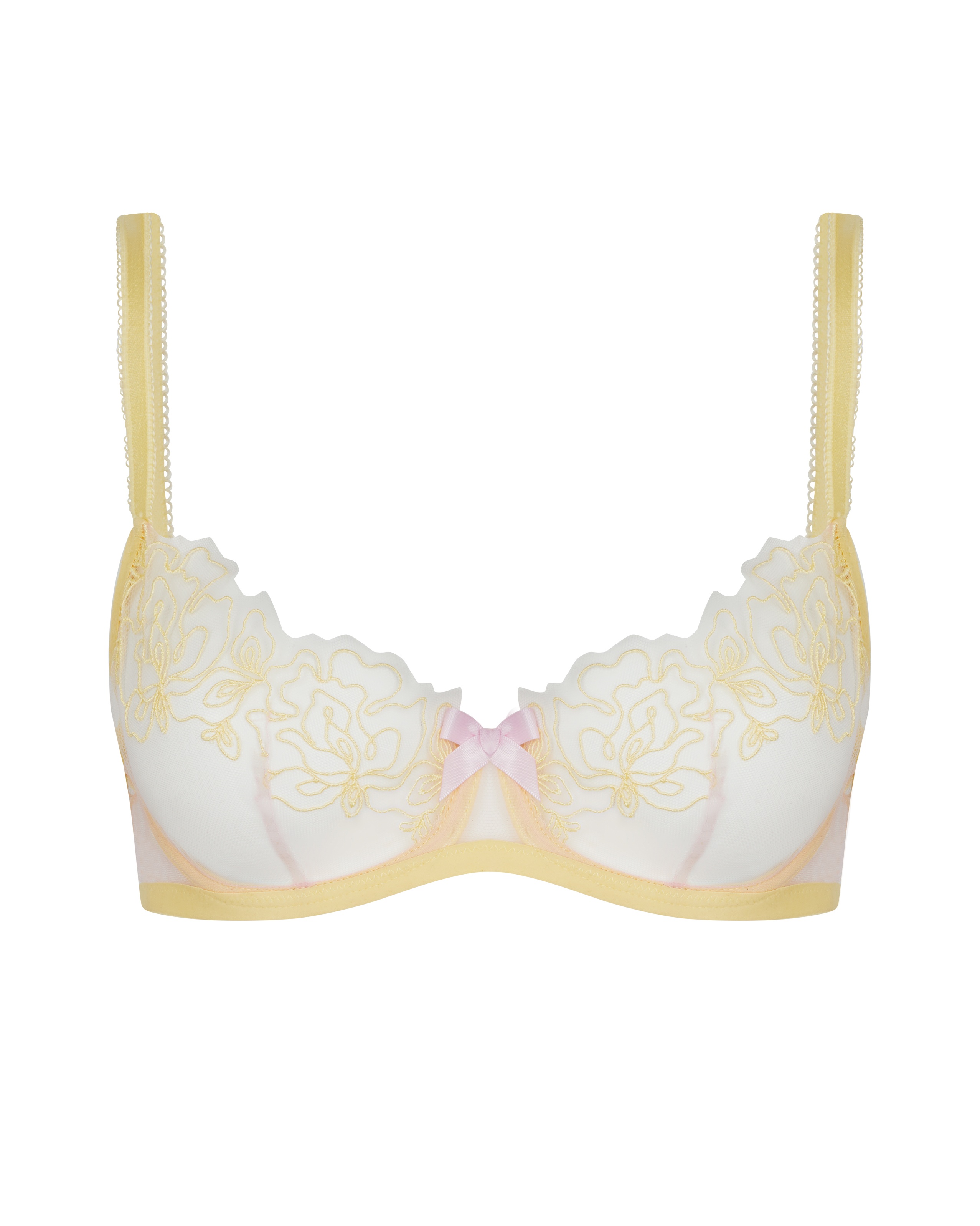Бюстгальтер Juni желто-розового цвета с чашками половинного покрытия и глубоким вырезом выполнен на основе прозрачного итальянского тюля. Украшен швейцарской рельефной вышивкой. Фурнитура с покрытием из настоящего золота. Сочетайте с другими предметами коллекции Juni для создания элегантного образа.