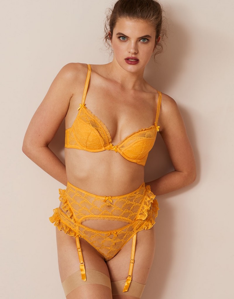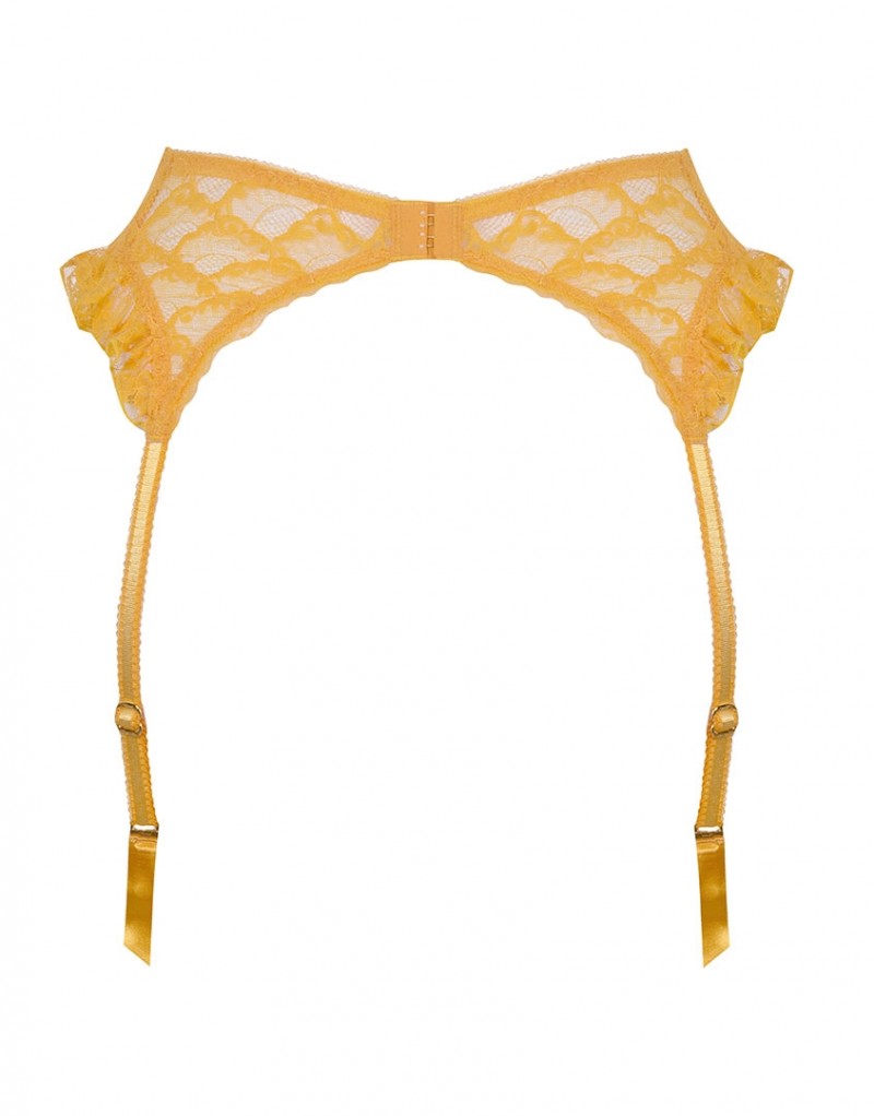 Высокий пояс с глубокими вырезами по бокам выполнен из желтого кружева и украшен игривой оборкой на бедрах. Модель дополнена желтыми сатиновыми пажами.