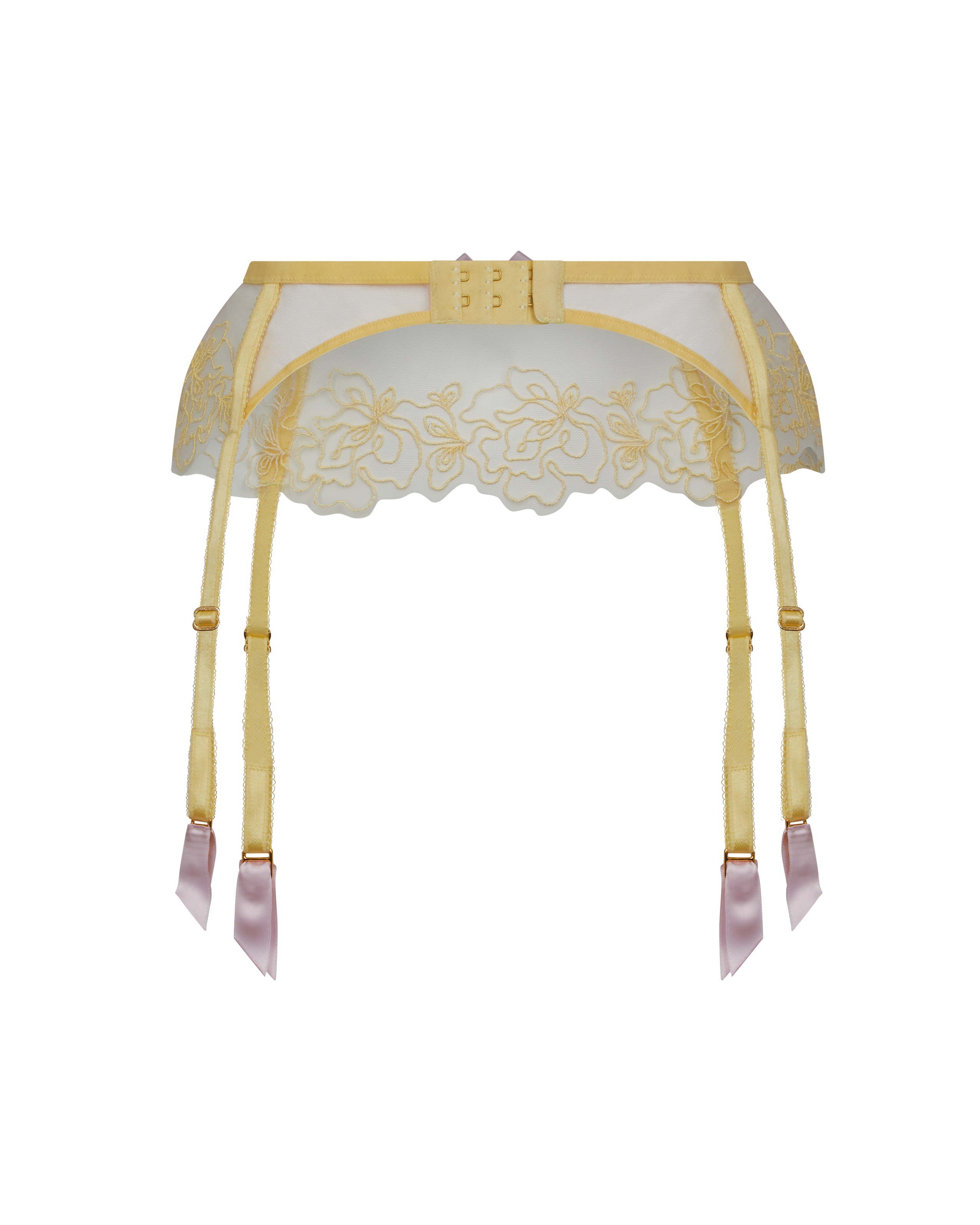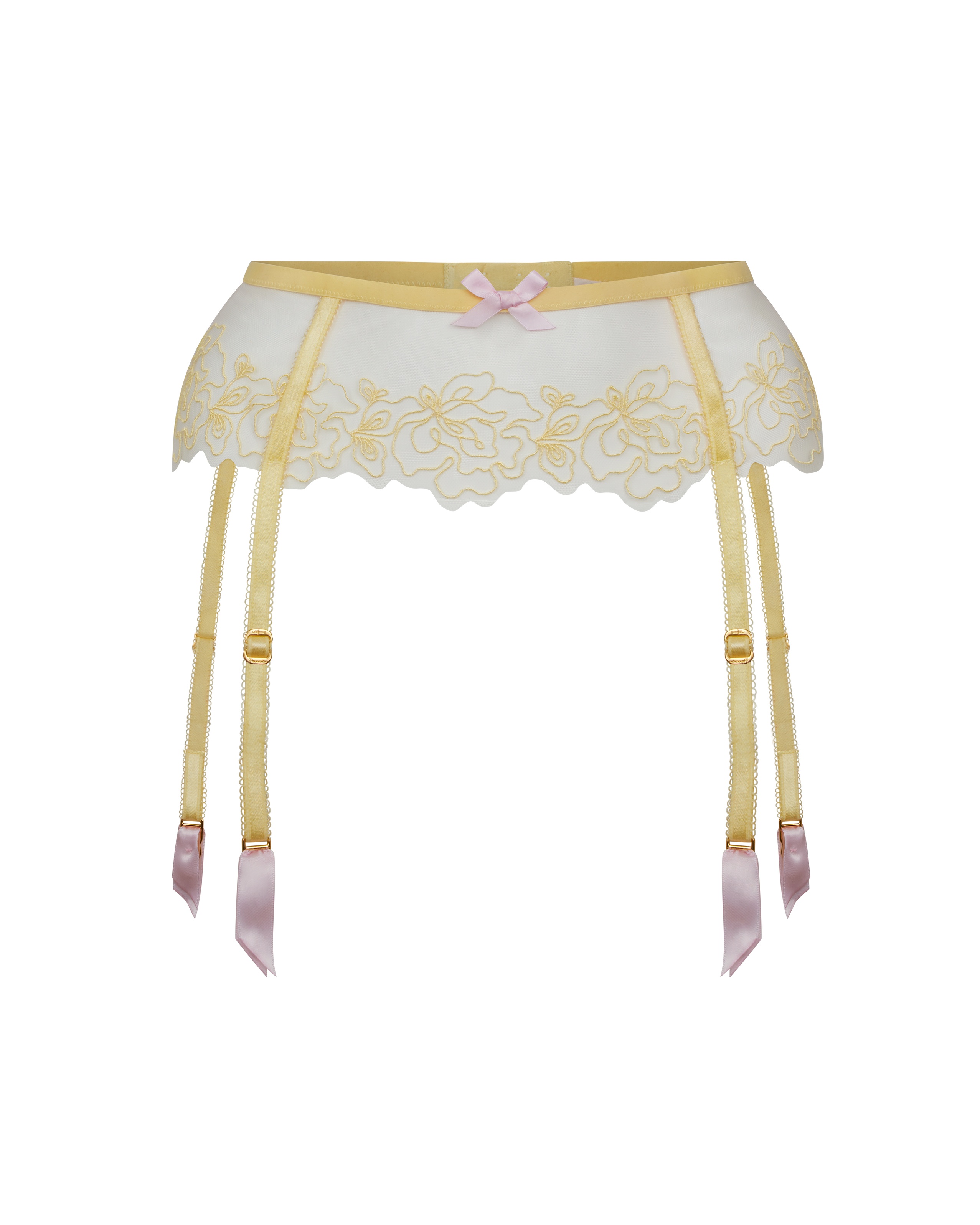Пояс для чулок Juni желто-розового цвета выполнен на основе прозрачного итальянского тюля. Украшен швейцарской цветочной вышивкой. Фурнитура с покрытием из настоящего золота. Изысканный акцент для образа, собранного из вещей коллекции Juni.