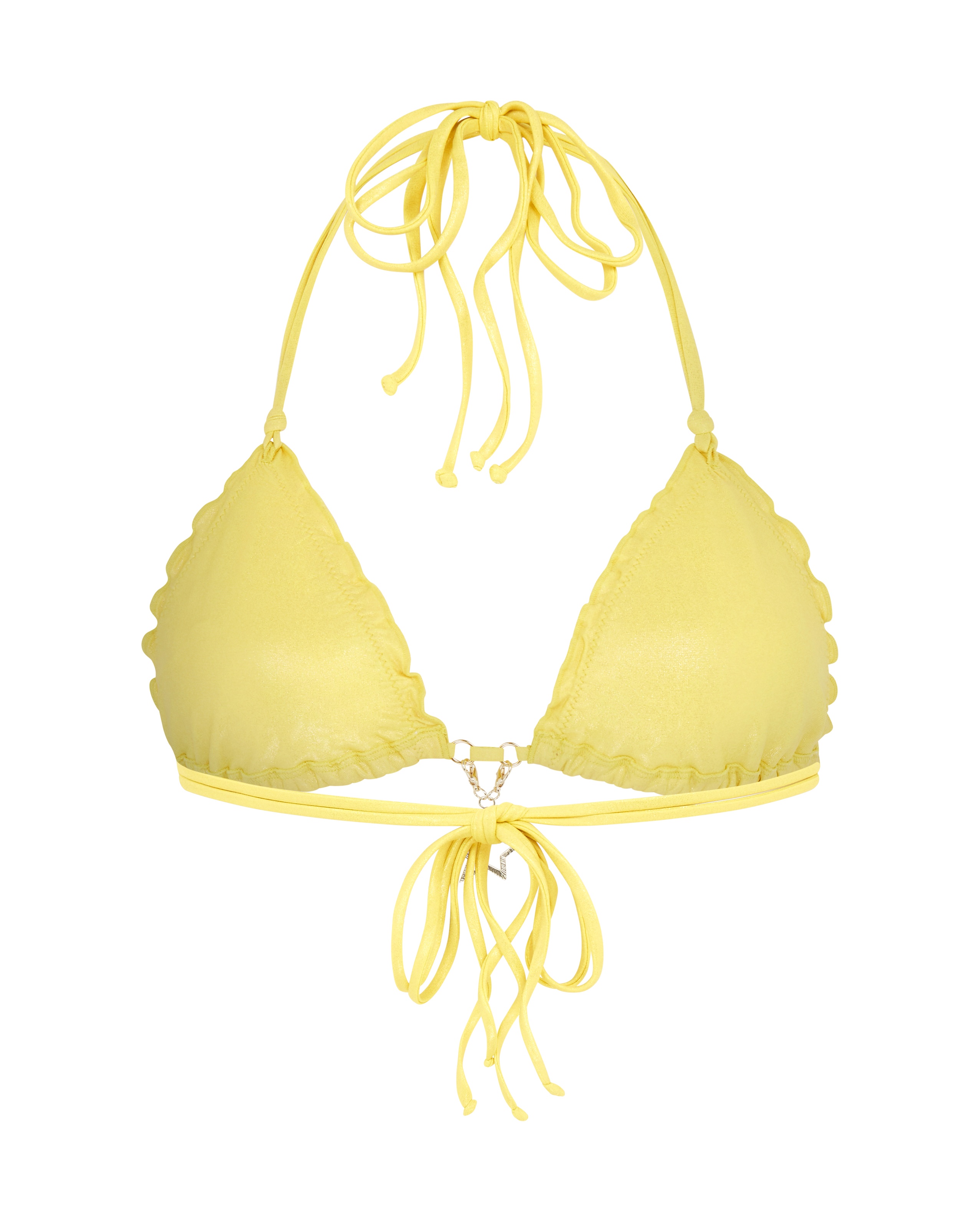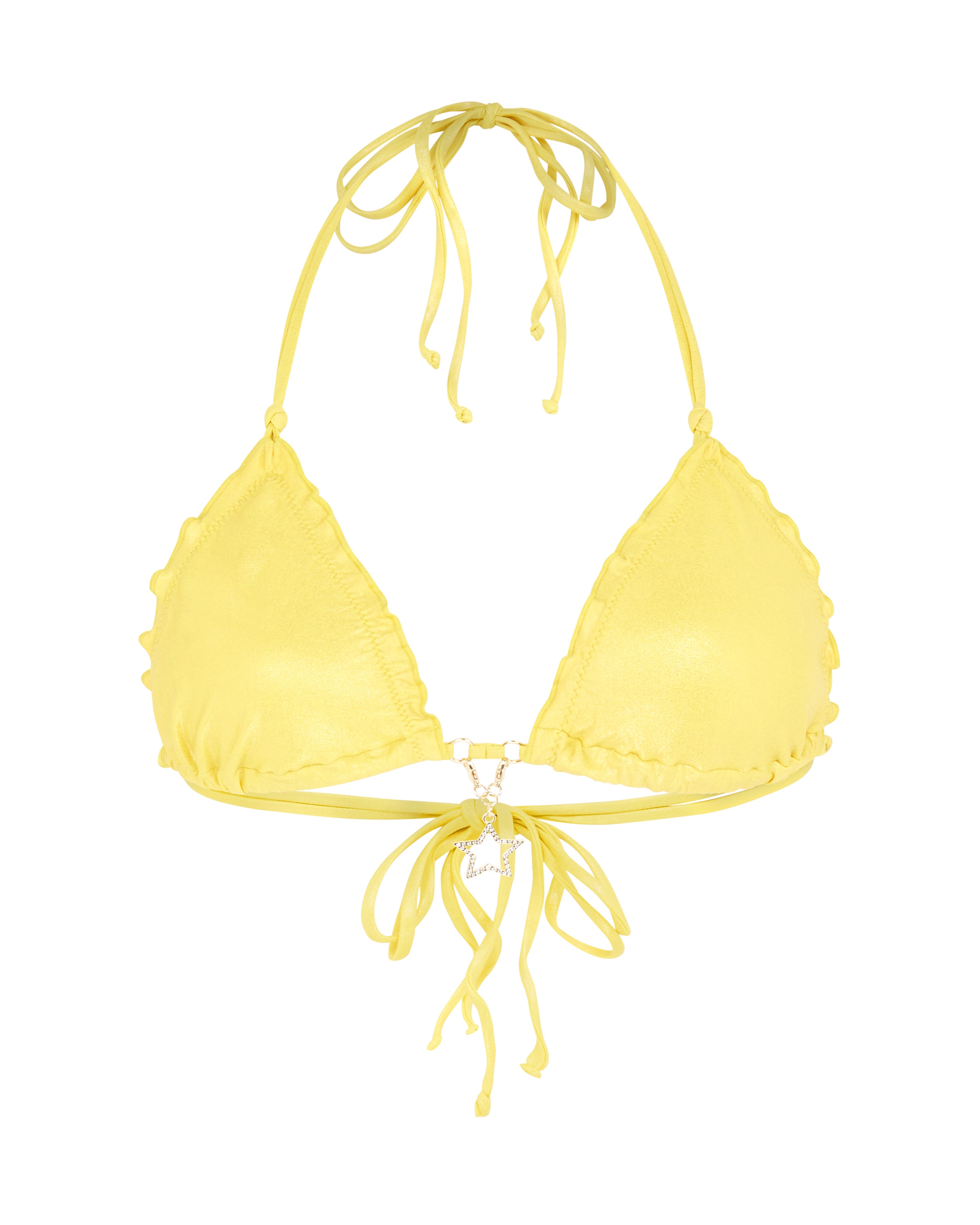 Бикини-топ Berry с треугольными чашками и регулируемой сборкой выполнен из итальянской купальной ткани. Между чашками расположена подвеска в виде кристальной звезды с влагостойким покрытием.