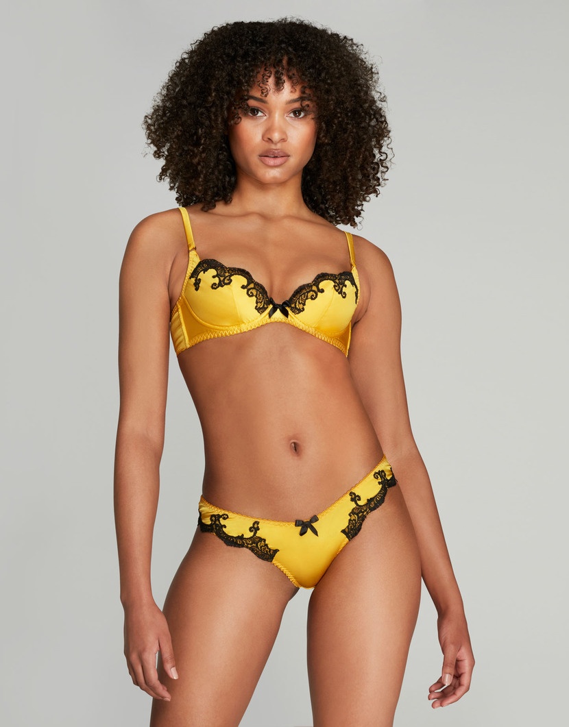 Бюстгальтер из классической коллекции Molly выполнен из желтого эластичного шелка. Фасон балконет украшен полоской черного резного кружева по линии декольте. Чашечки с тонким наполнителем дополнены рельефными швами для оптимальной посадки.