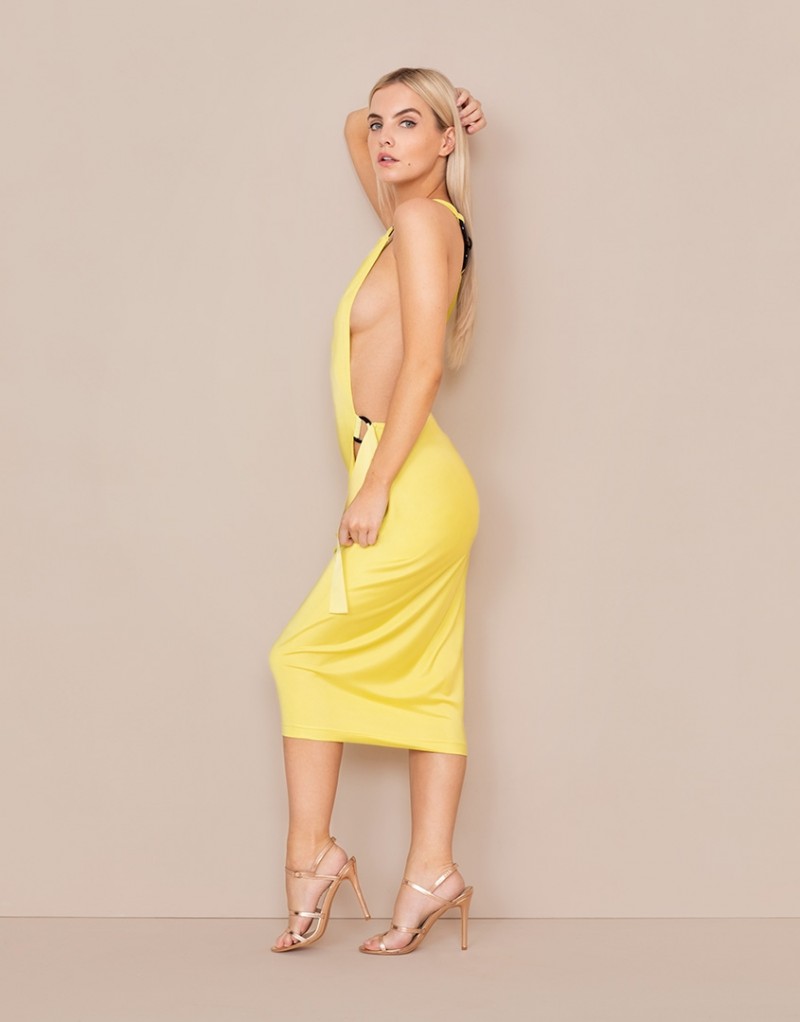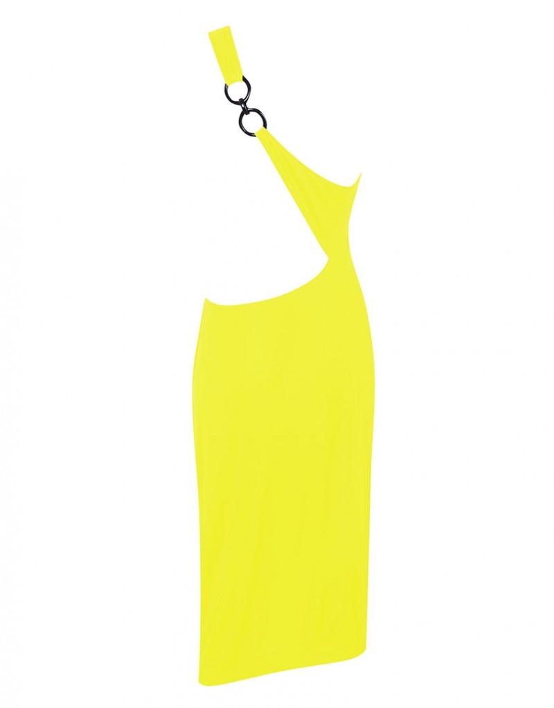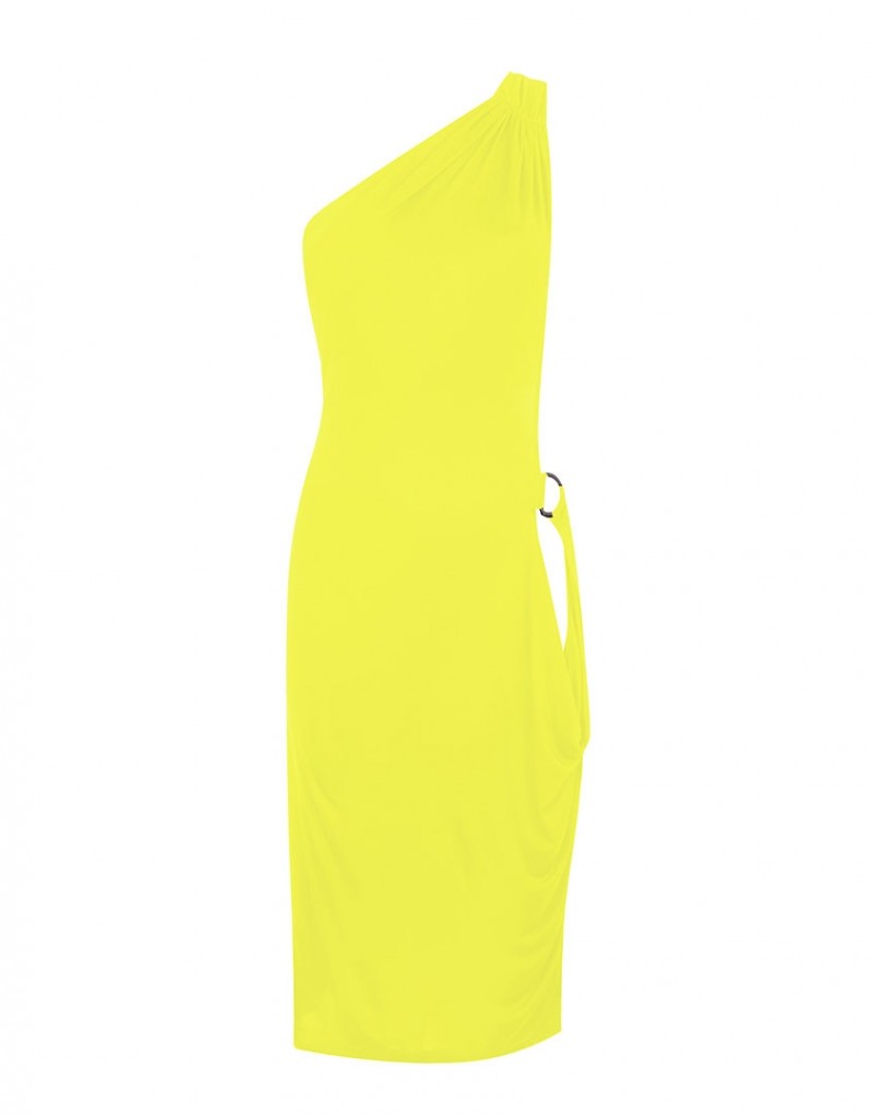 Платье с асимметричным дизайном на одно плечо и расслабленным силуэтом наводит на мысли о греческих богинях. Шелковое платье лимонно-желтого цвета с драпировкой декорировано эксклюзивной пластиковой фурнитурой, добавляющей провокационности образу. Модель подойдет для вечернего выхода или расслабленной прогулки вдоль пляжа. - D-образное кольцо и рельефный эластичный пояс - Асимметричная бретель Материалы и уход: Основной материал: 100% шелк. Рекомендована ручная стирка. Бережная сушка