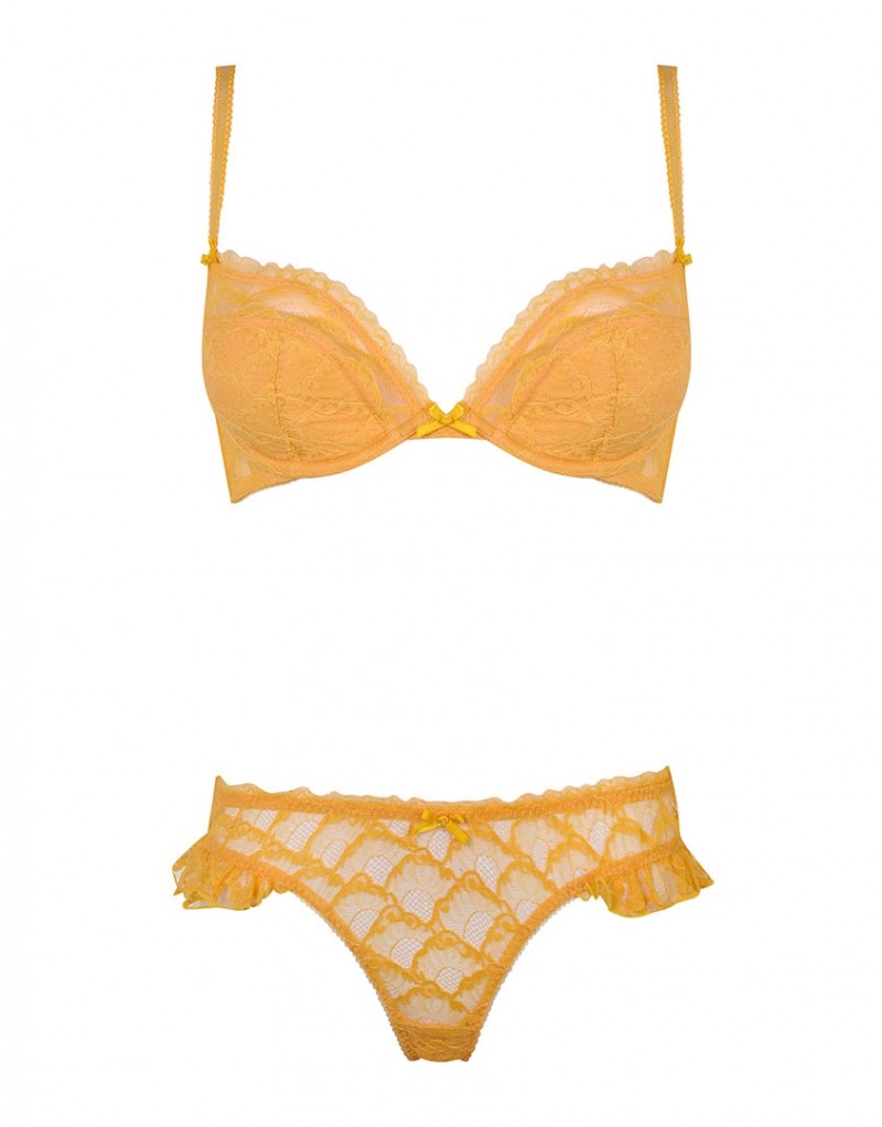 Трусики выполнены из желтого кружева и дополнены игривой оборкой на бедрах.