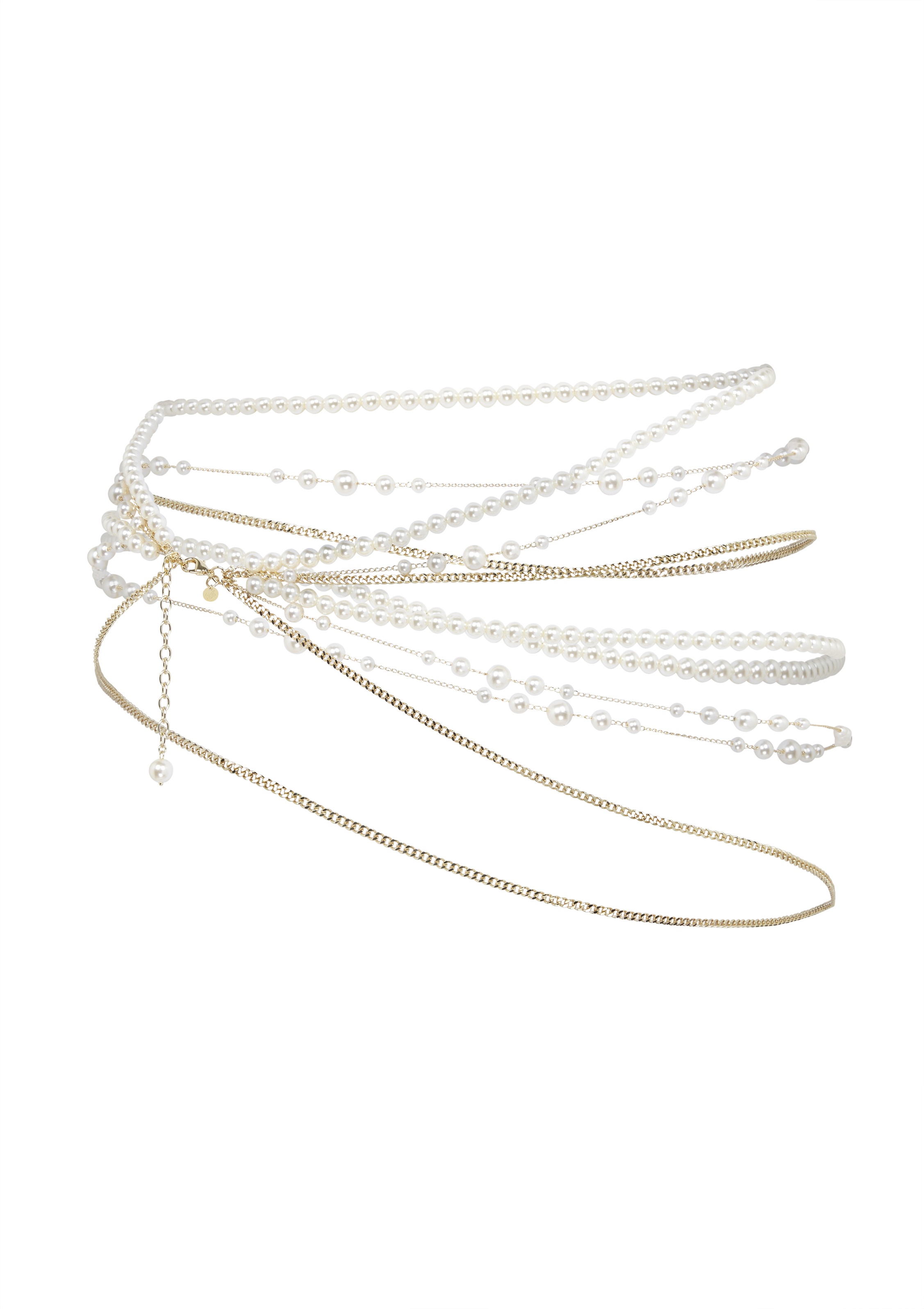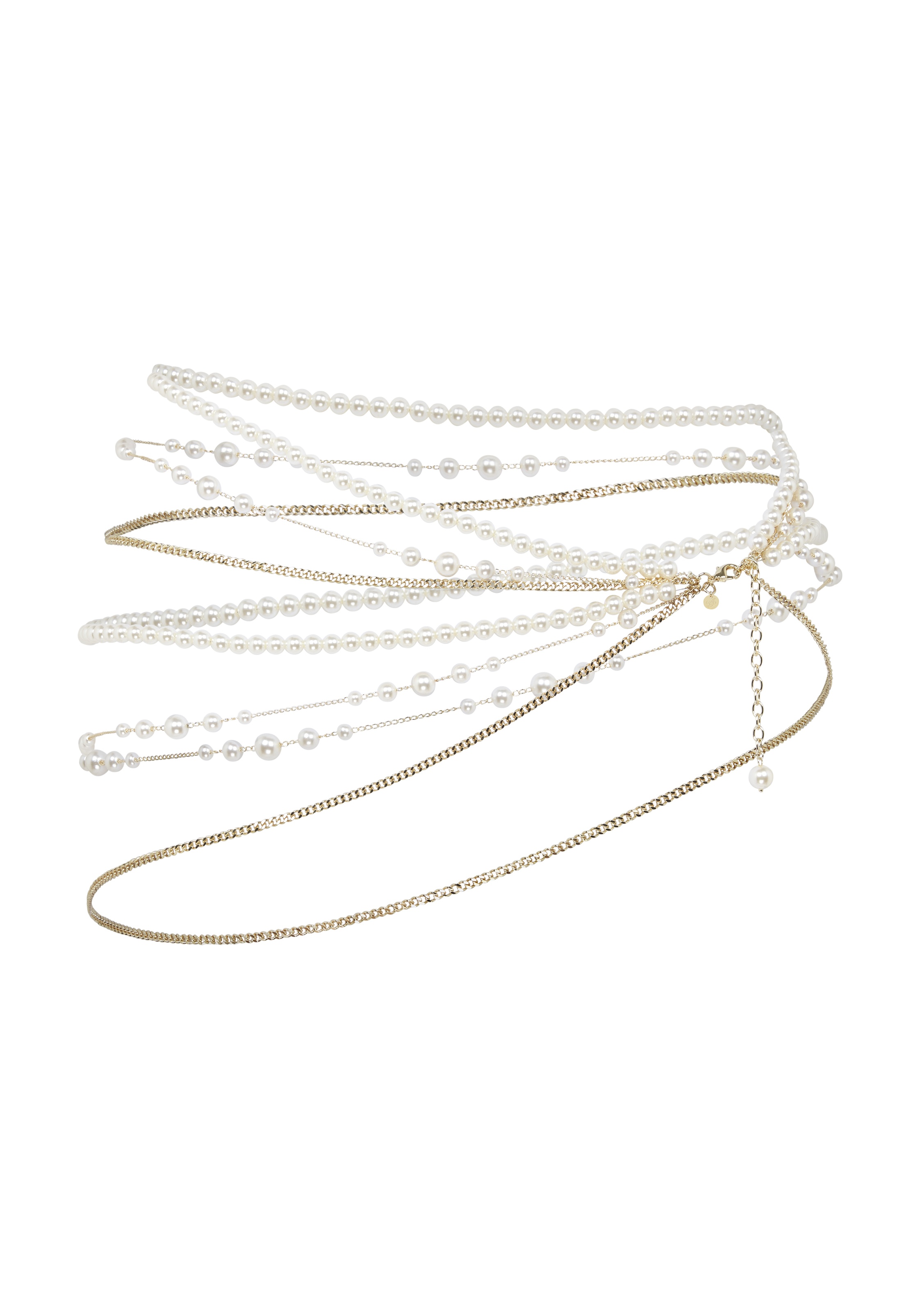 Пояс Pearlie соединяет черную основу с россыпью бусин и золотых цепочек, вышитых вручную. Станет эффектным дополнением как к белью, так и к вечернему образу.