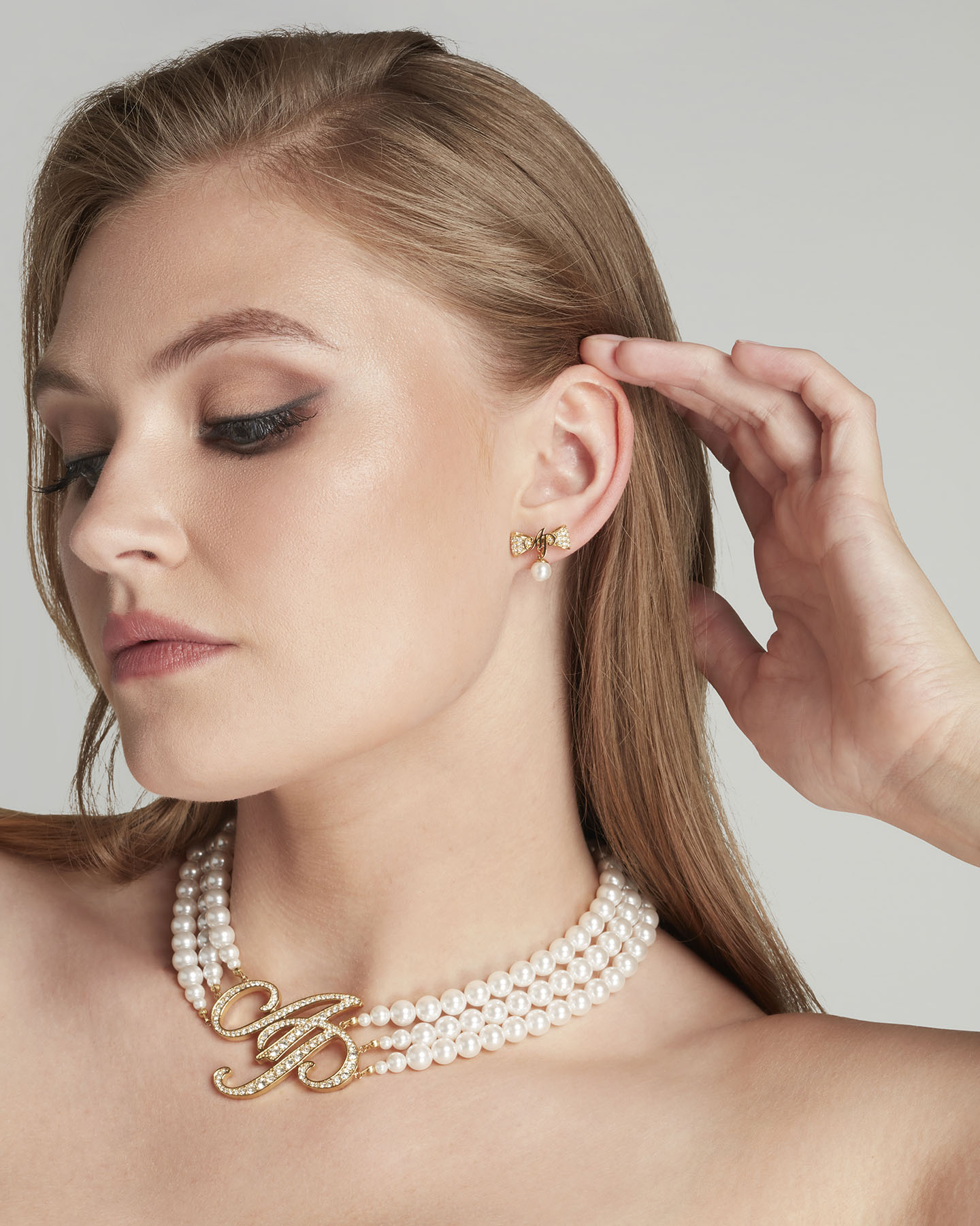 Britt — тройное ожерелье с жемчужными бусинами и кристаллическим логотипом AP. Позолоченная фурнитура и регулируемые застёжки делают его акцентным элементом, особенно в сочетании с другими украшениями Agent Provocateur.