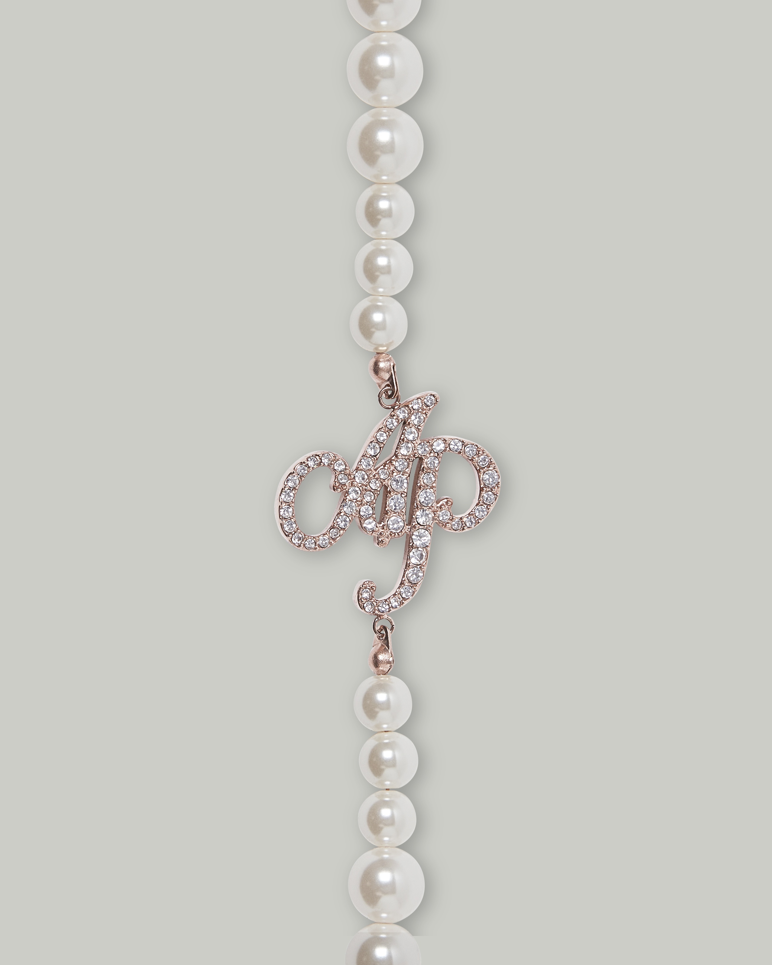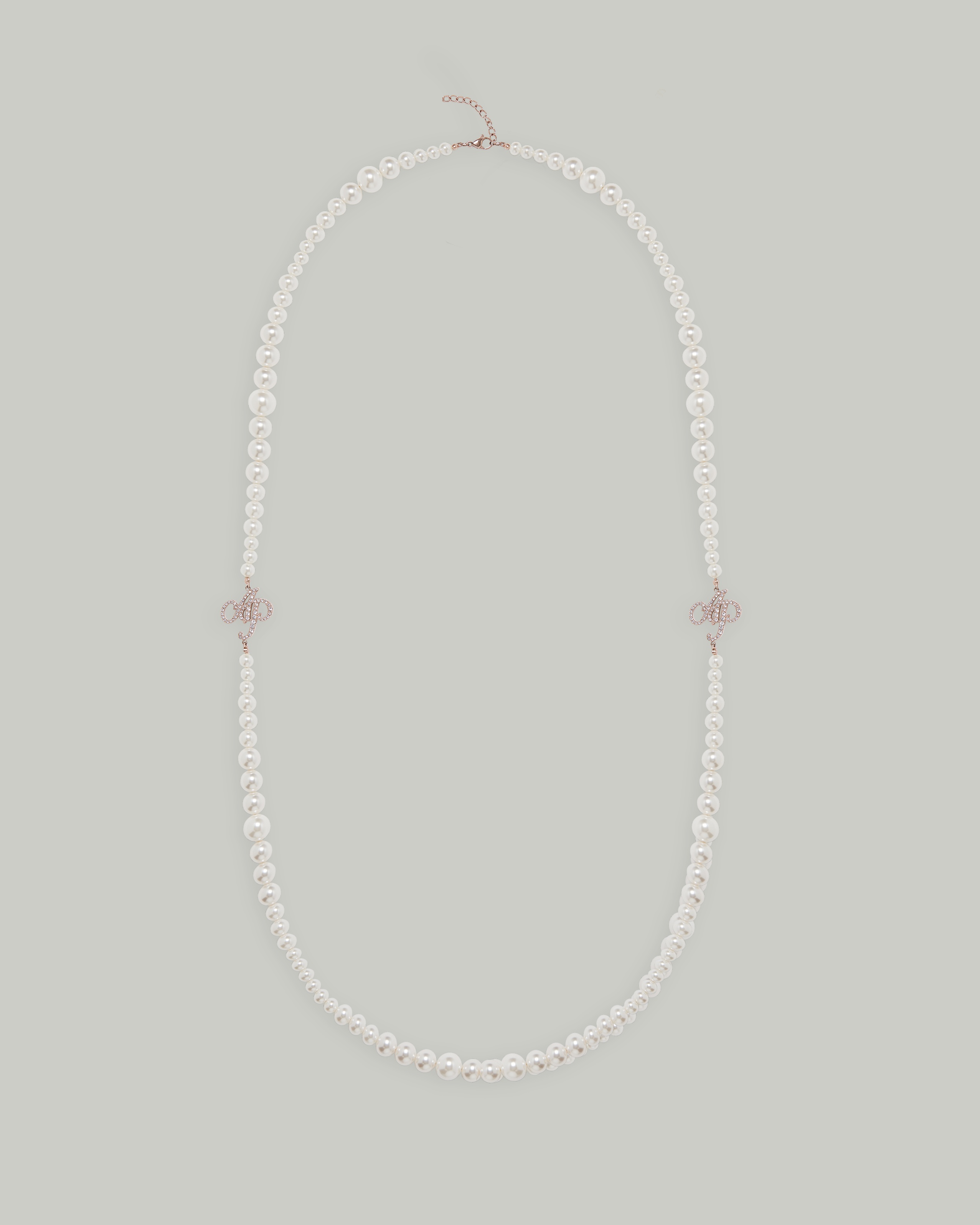 В ожерелье Barb встречаются нежные оттенки жемчуга и логотипы в розово-золотом цвете с кристаллами. Позолоченная фурнитура и возможность регулировать длину делают его универсальным украшением.