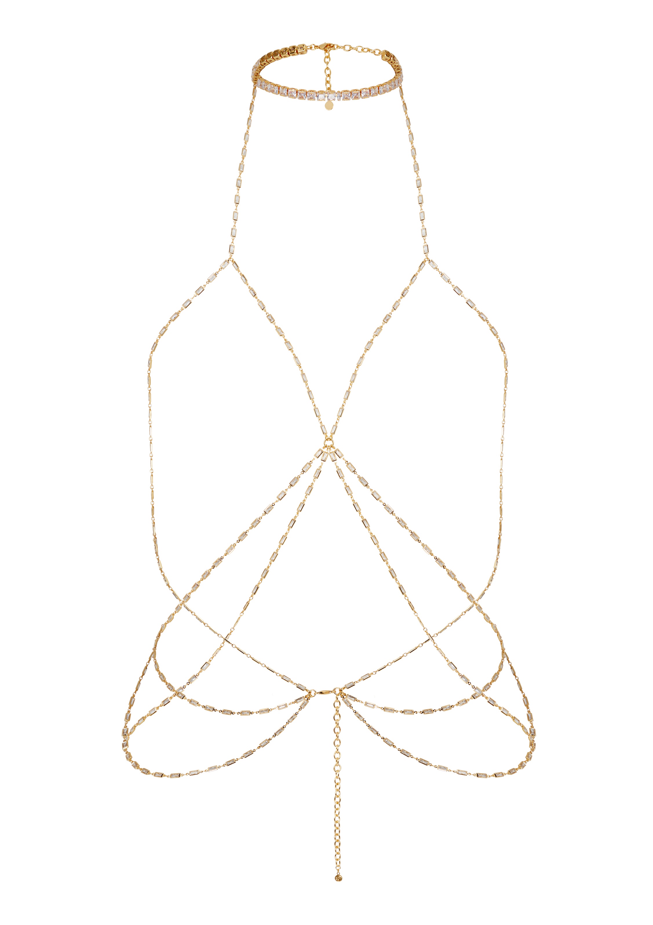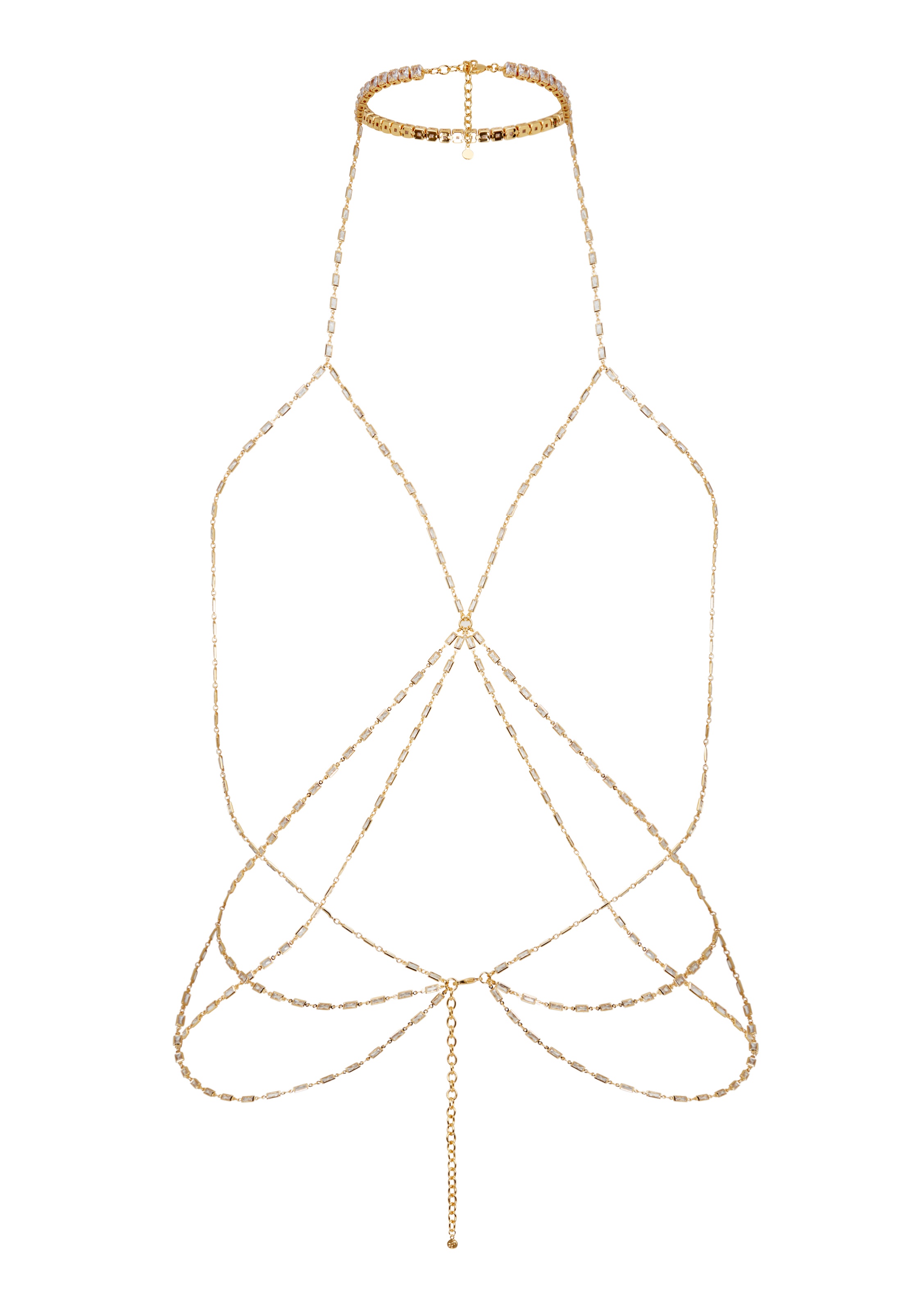 Украшение для тела Crestia выполнено из массивных цепочек золотого оттенка с кристаллами. Идеально подходит для того, чтобы носить его поверх маленького черного платья на коктейльной вечеринке, а затем дополнить любимыми накладками AP для более интимного образа.