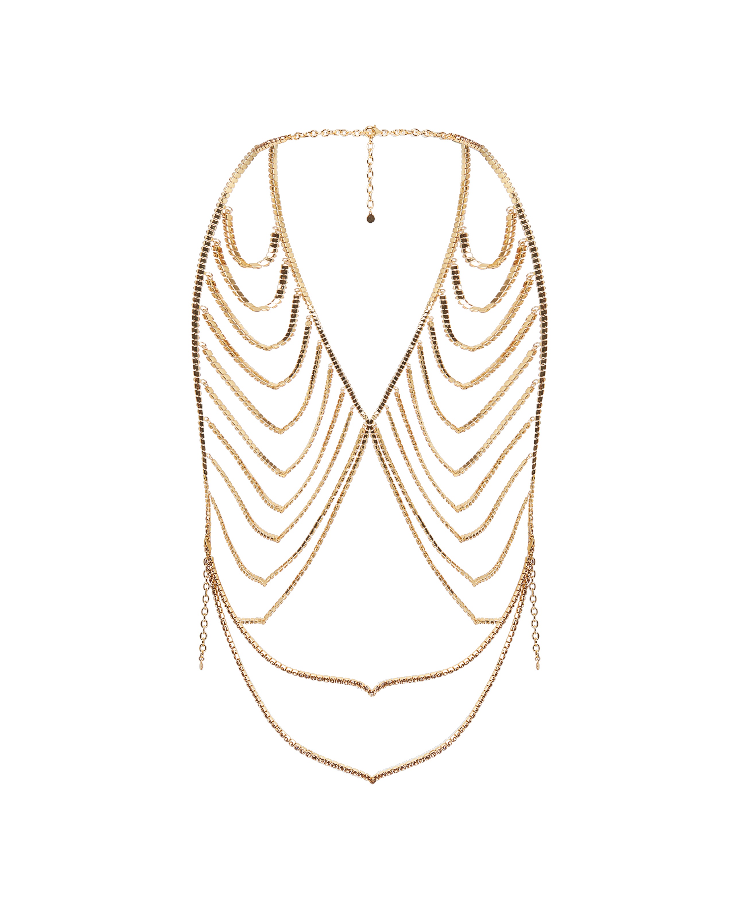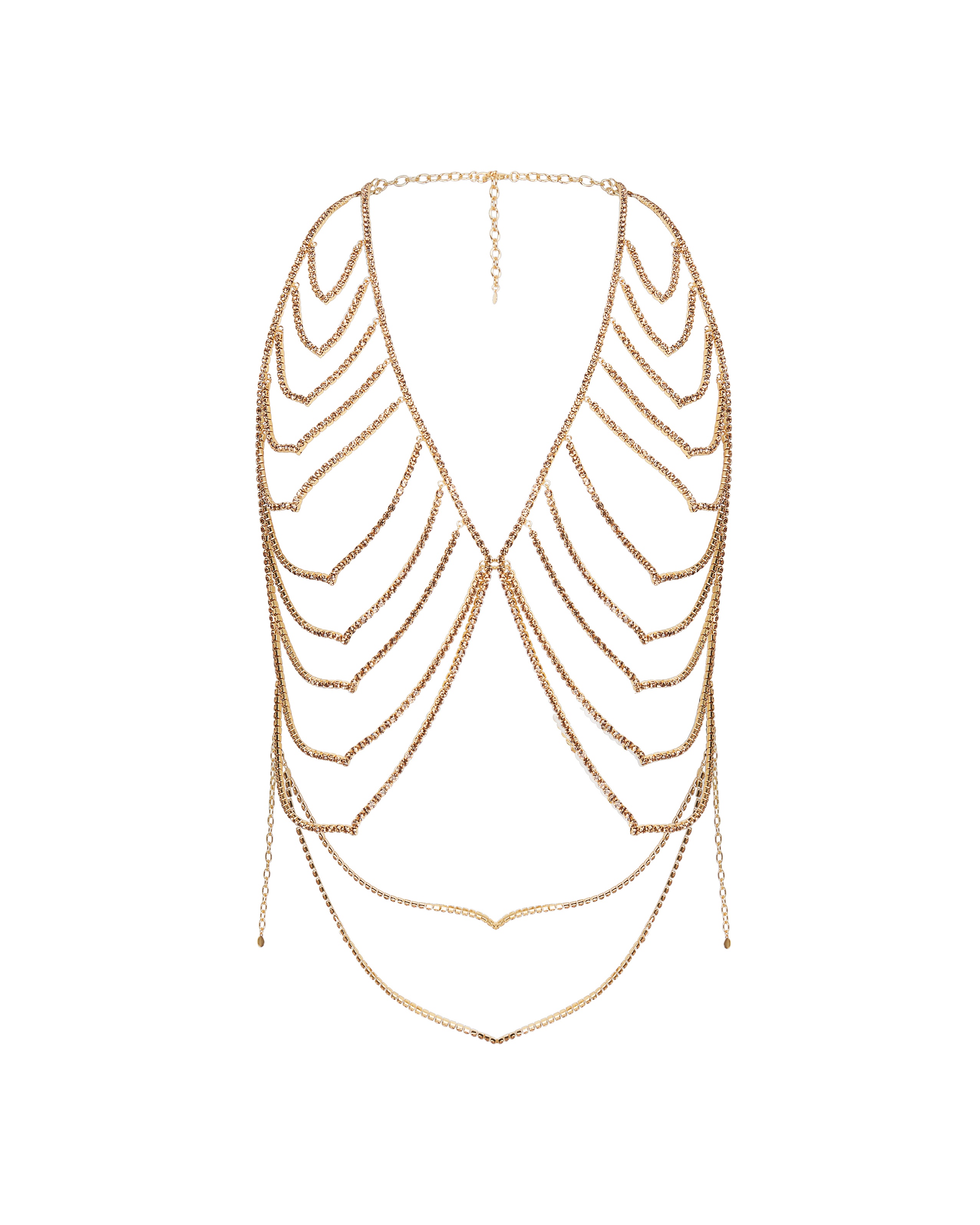 Золотистая цепочка для тела Elliotte: шевронные цепи, играющие светом, и соблазнительная линия бюста. Настраиваемая посадка для безупречной посадки. Смелый акцент поверх наряда или на голое тело — выбор за вами.
