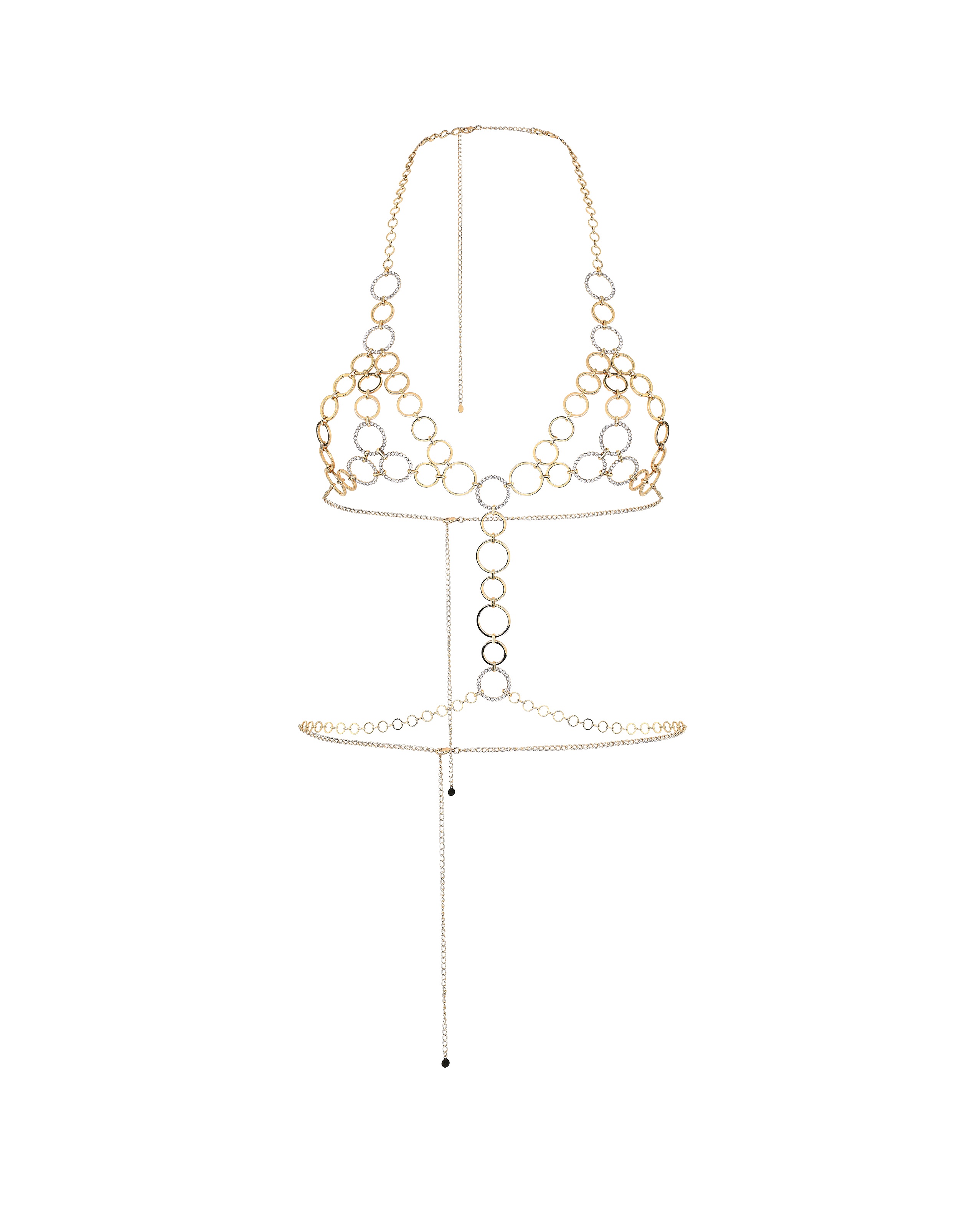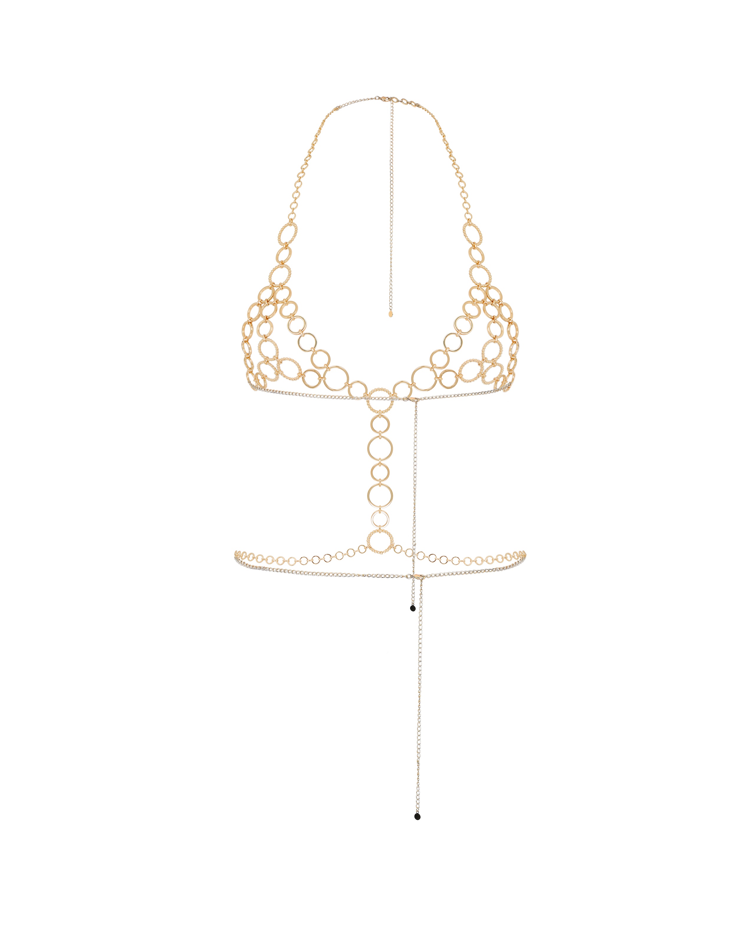 Цепочка для тела Lustia украшена сверкающими кольцами с водо- и термостойким покрытием. Застежки-карабины позволяют подогнать посадку под настроение и образ.