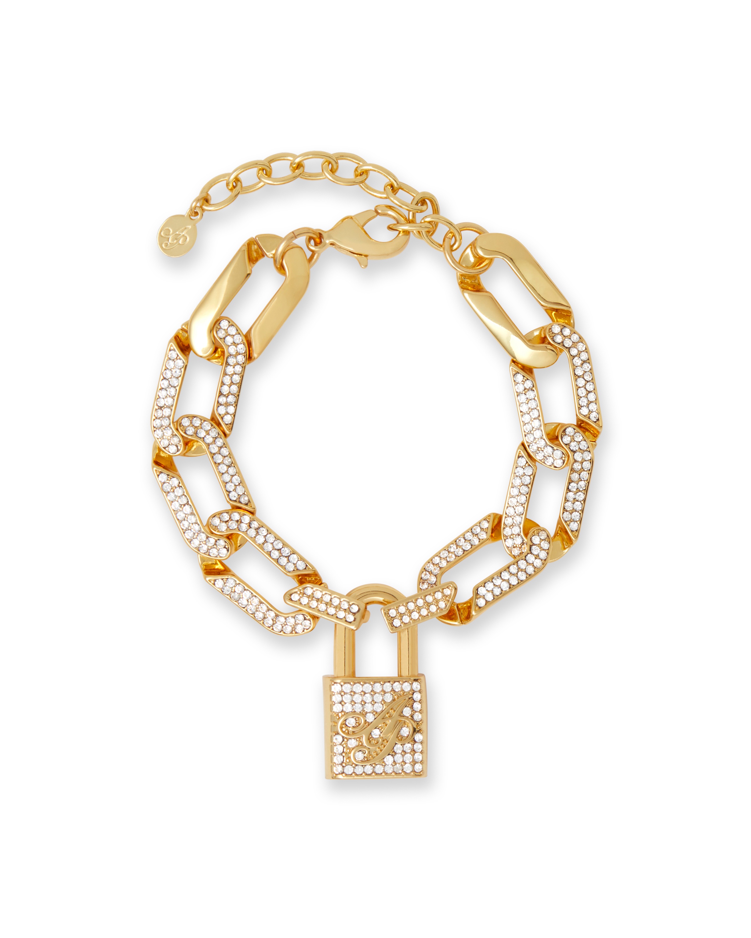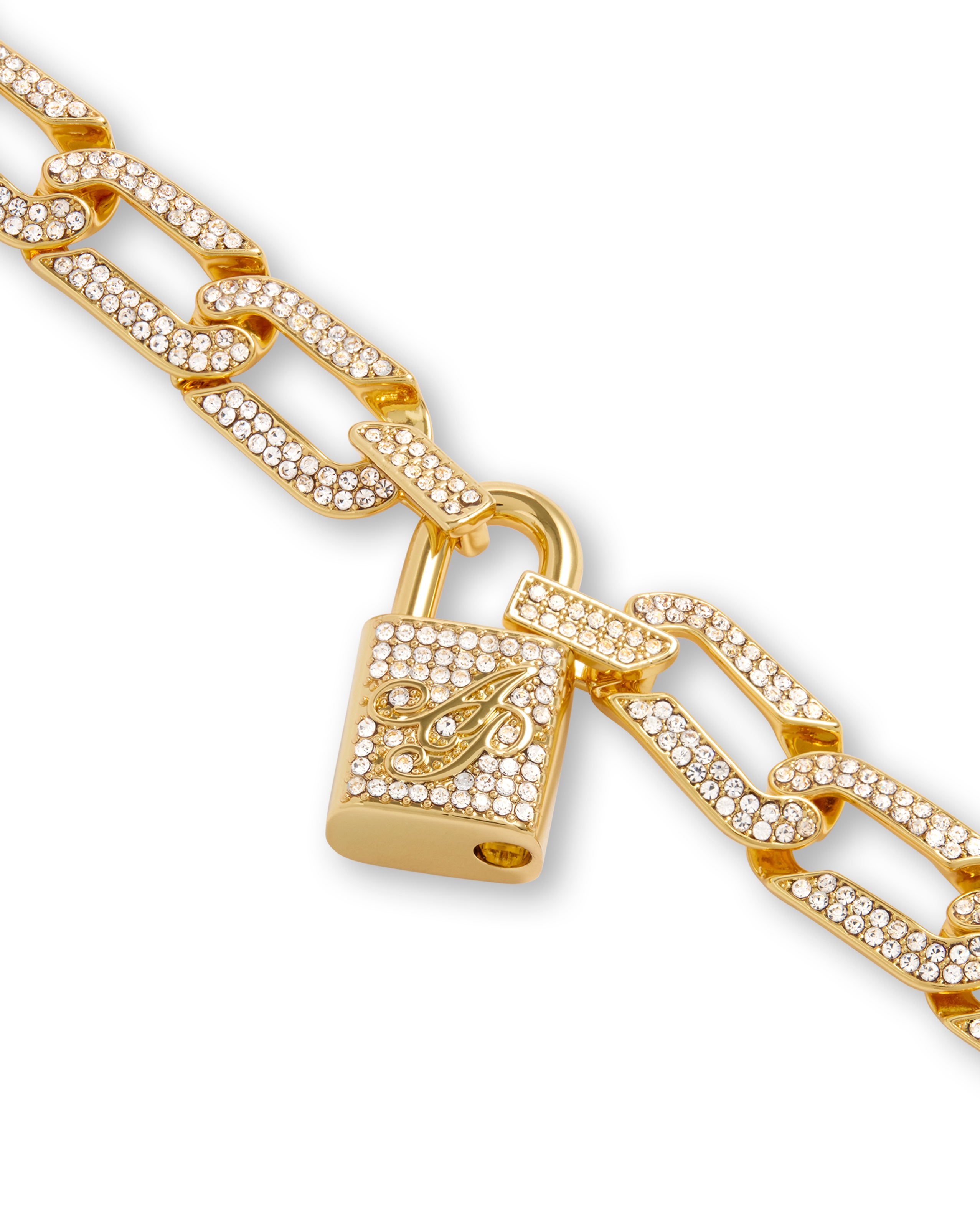 Браслет Meriem золотистого цвета с массивным цепным плетением, чармом в виде замочка AP и кристальными вставками. Регулируемая длина обеспечивает идеальную посадку. Сочетайте с другими предметами коллекции Meriem для завершения образа.