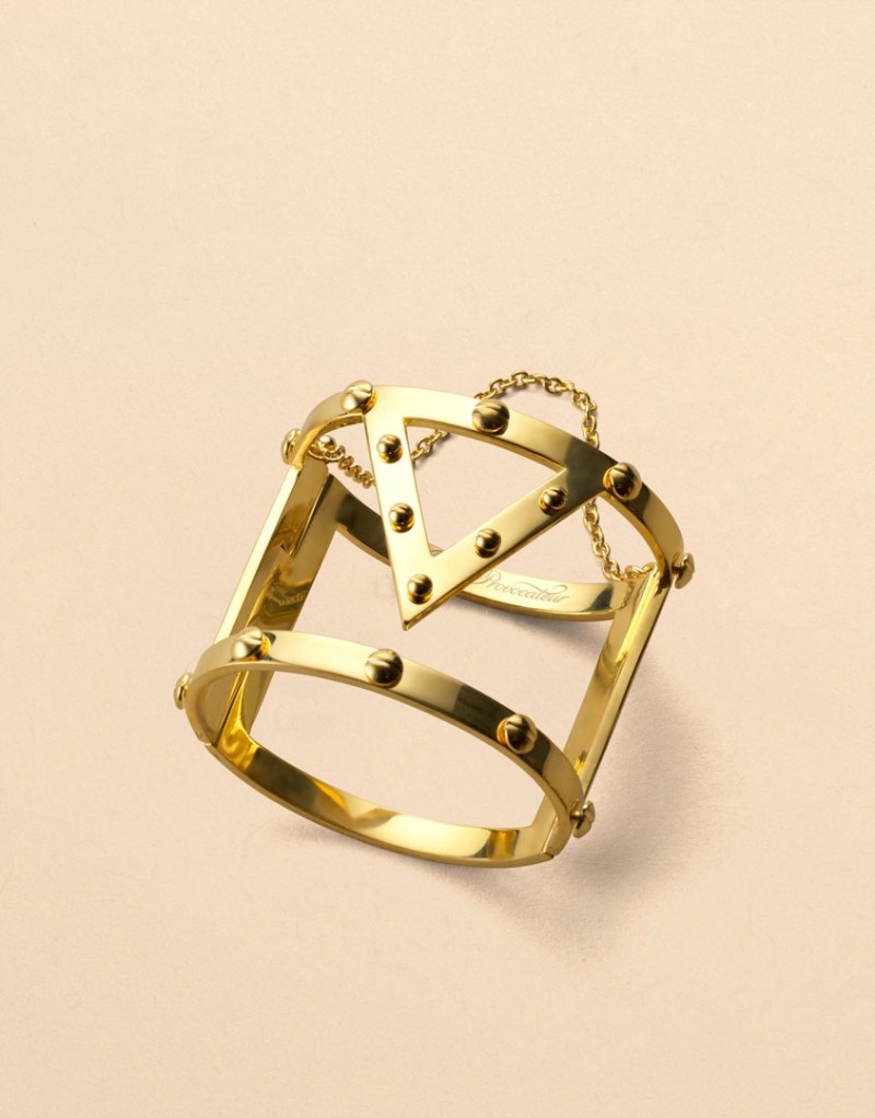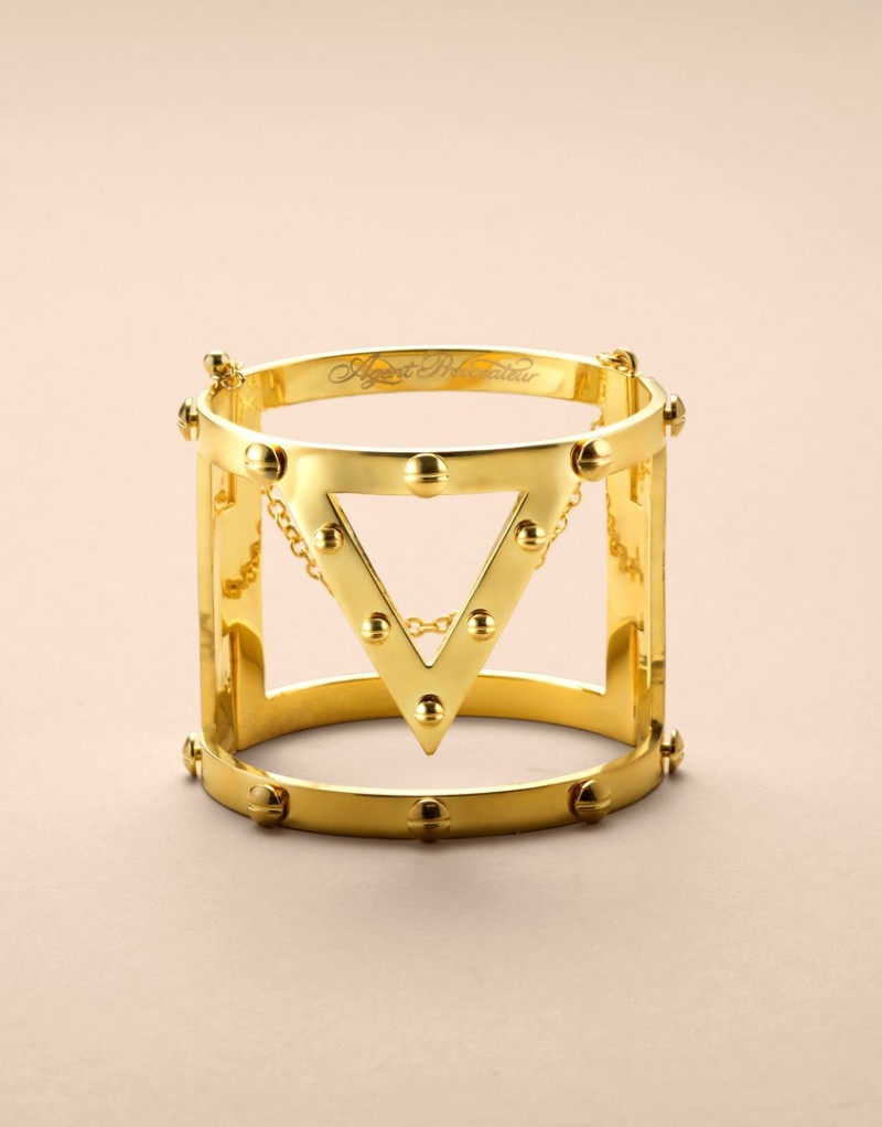 Почувствуйте себя супер-героиней в новой коллекции аксессуаров Zeusanna. Эффектный позолоченный браслет с традиционной застежкой-булавкой выполнен в этническом стиле. Браслет дополнен золотистыми клепками и тонкой драпированной цепочкой. Сочетайте с колье Zeusanna для создания незабываемого образа.