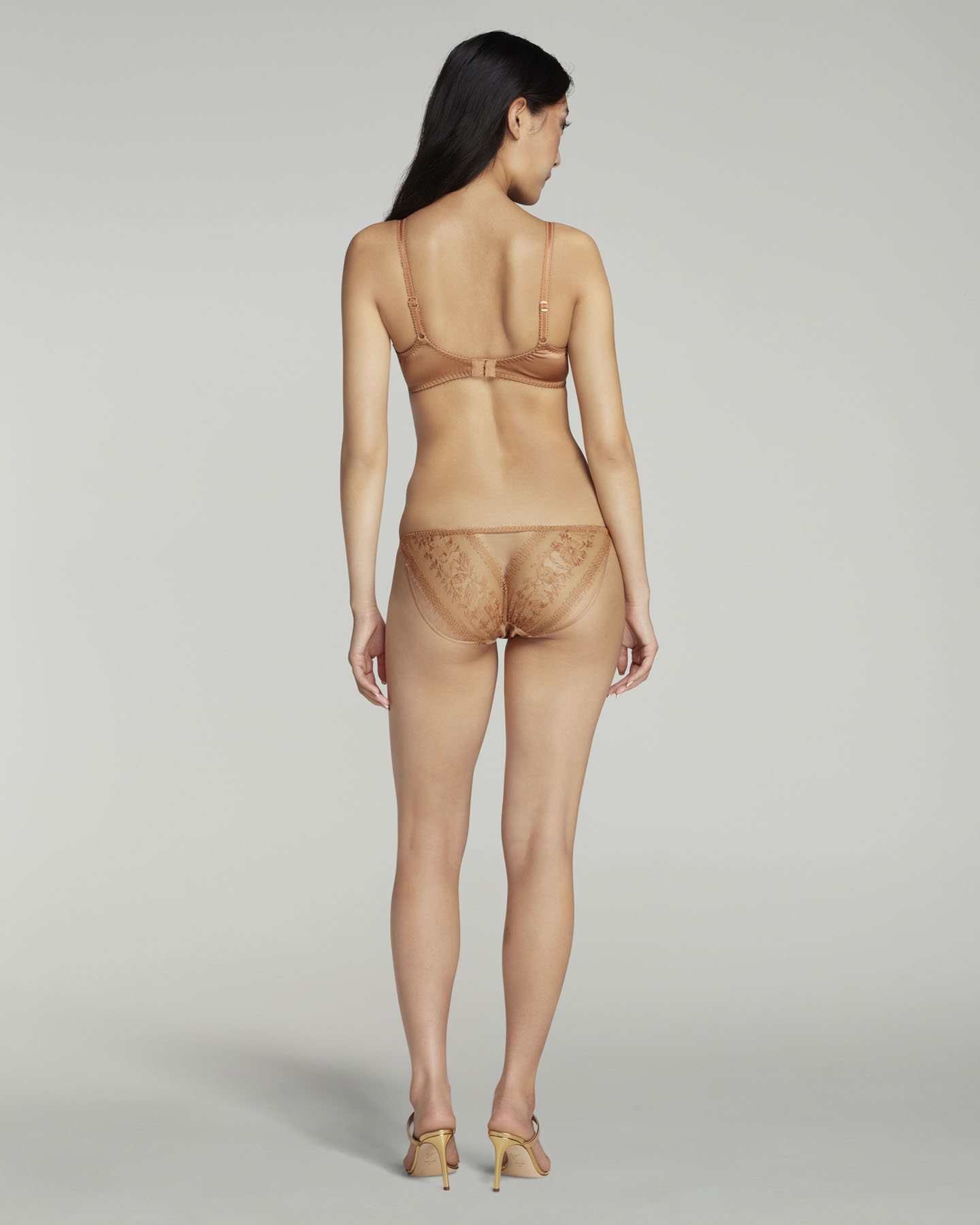 Трусы Tanya выполнены из самых изысканных материалов — шелкового атласа, французского кружева и невесомой полупрозрачной сетки золотистого цвета. Модель украшена смелым вырезом сзади и тонкими перемычками, дублирующими плавные линии кроя. Дополните романтический образ бюстгальтером и поясом коллекции Tanya.